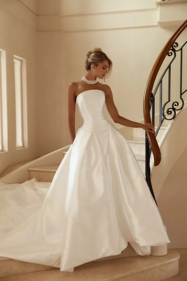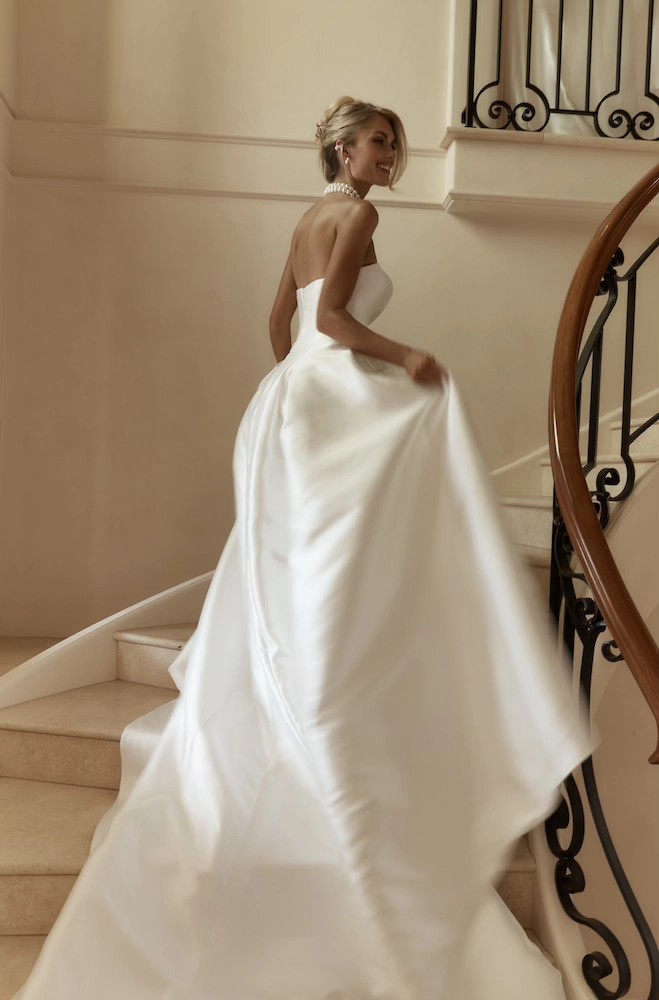 Jane Hill Dolce redefines regal with a sculptural rounded neckline and a seamless, panelled bodice that melts into the skirt. Designed to elongate the figure, this minimalist silhouette features a hidden back zip for a clean finish.