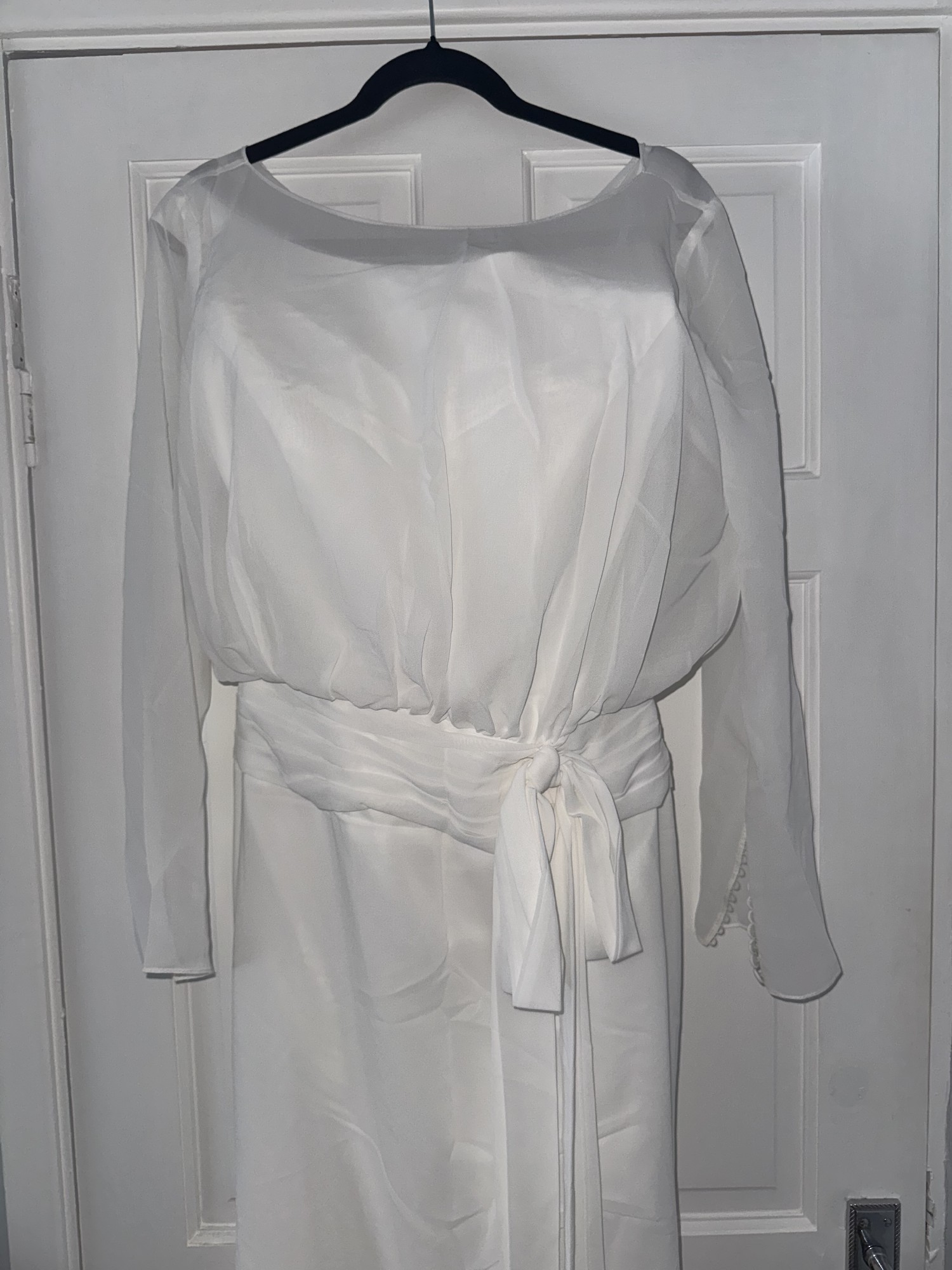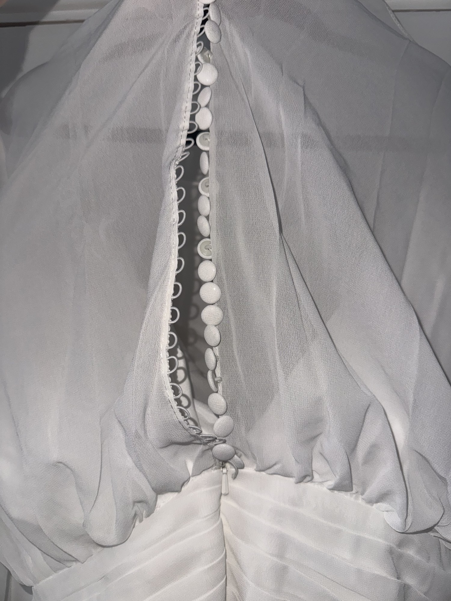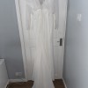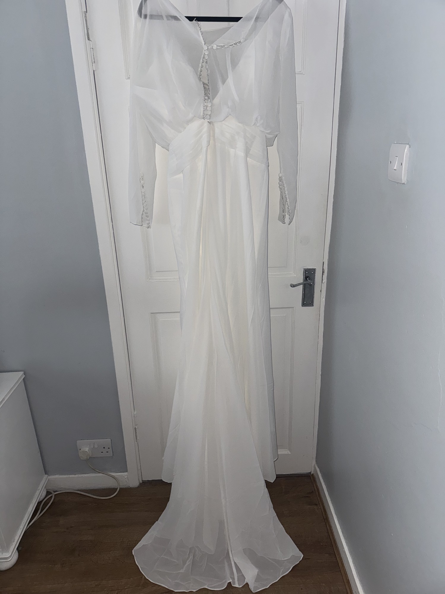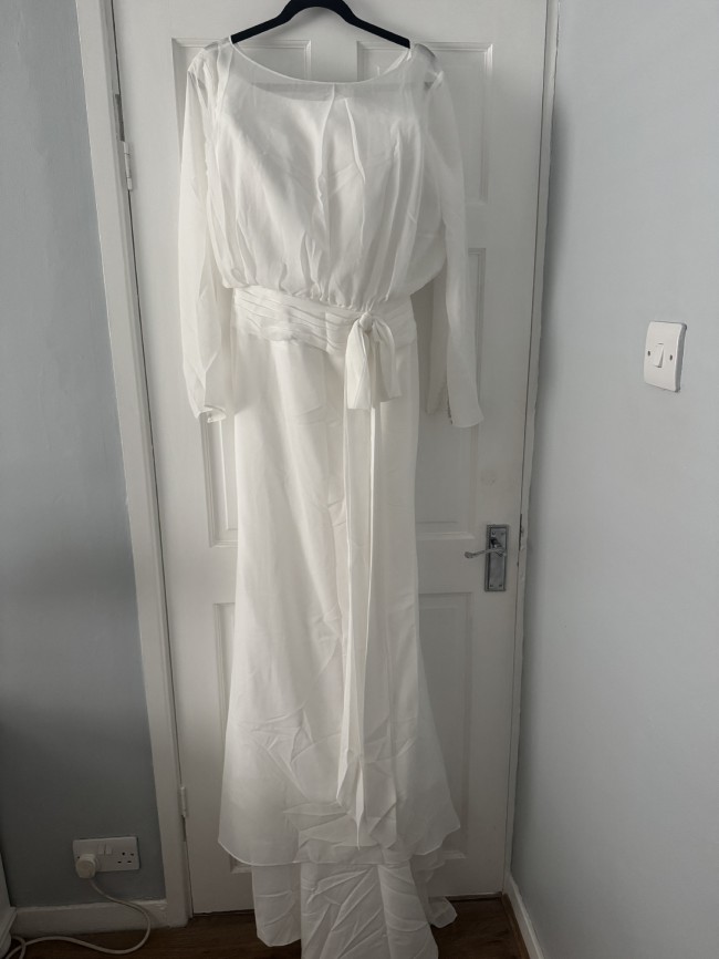 Ex store but amazing condition. Button came off at top of back (still have it) and one of the elastic loops at very bottom needs restitching. Beautiful long sleeved wedding dress with boning in the bust with a chiffon overlay. Gorgeous button detail on sleeves and at the back. Some train to the dress.