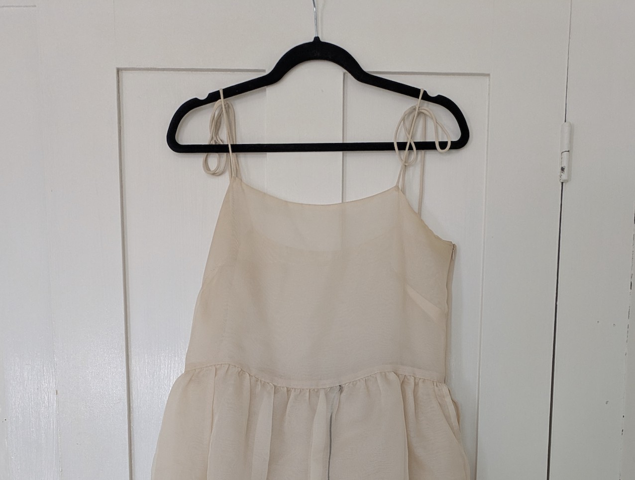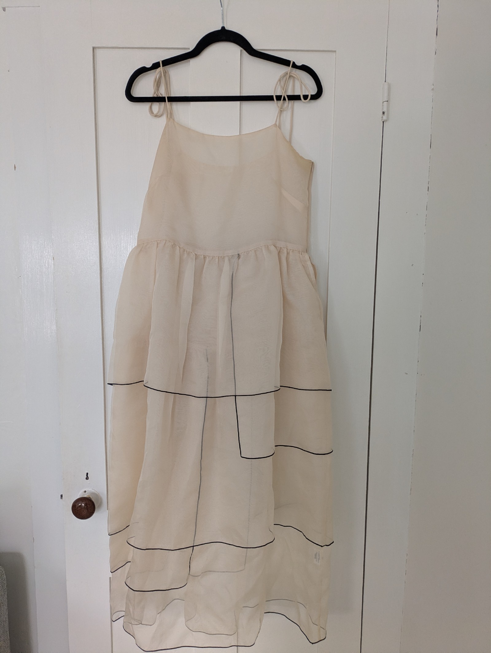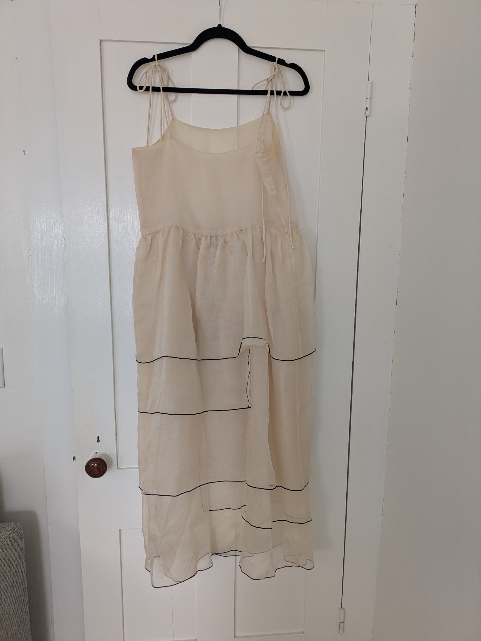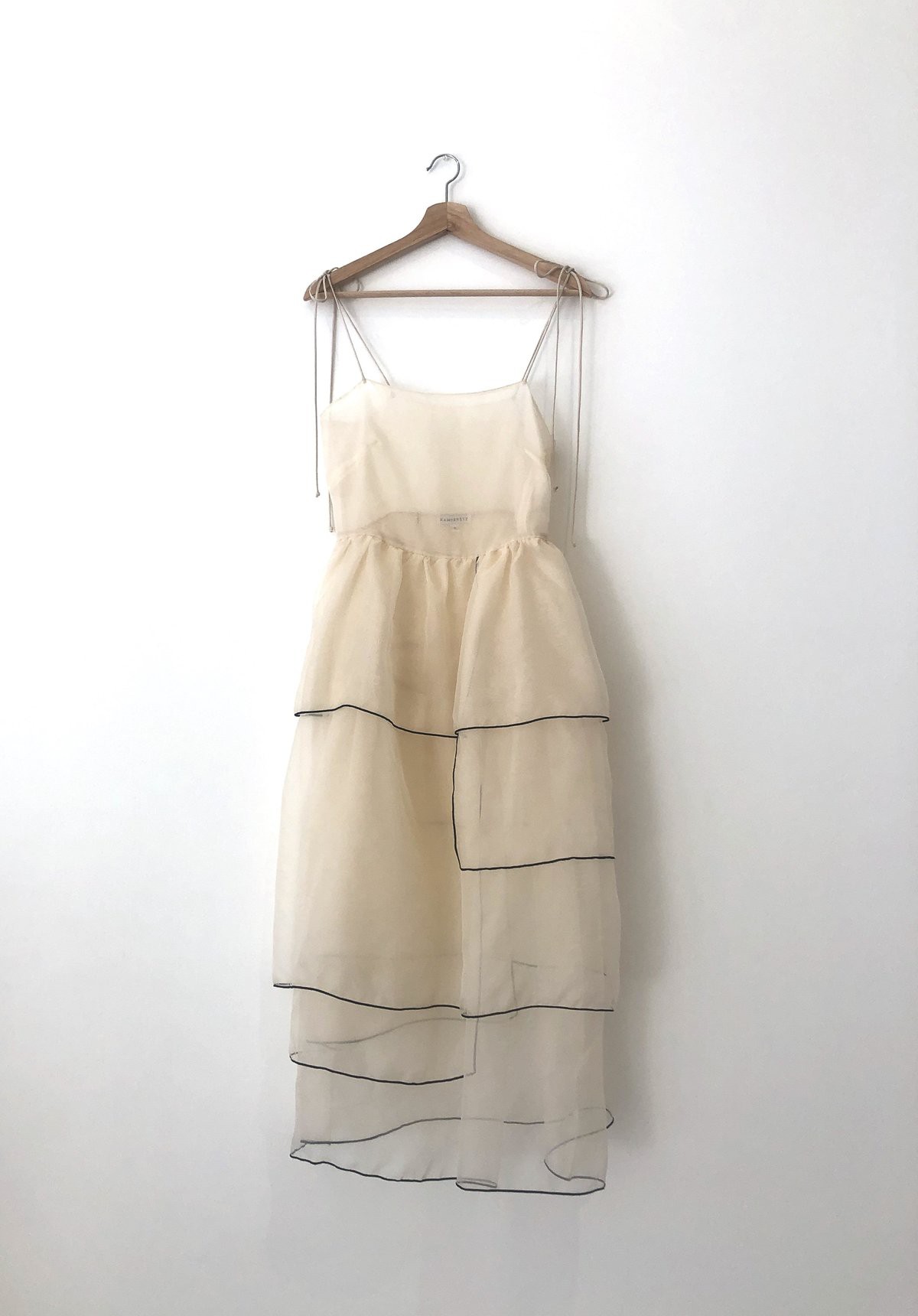 Midi length dress constructed from a delicate ivory silk organza. Self lined bodice with straight cut neckline, dress hits at natural waist and opens up into a full skirt of lightly gathered tiered panels of silk organza. Contrasting black pearl edge finish on each tier adds subtle detail. Thin corded straps tie at the shoulder, invisible side zip closure.