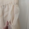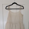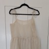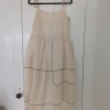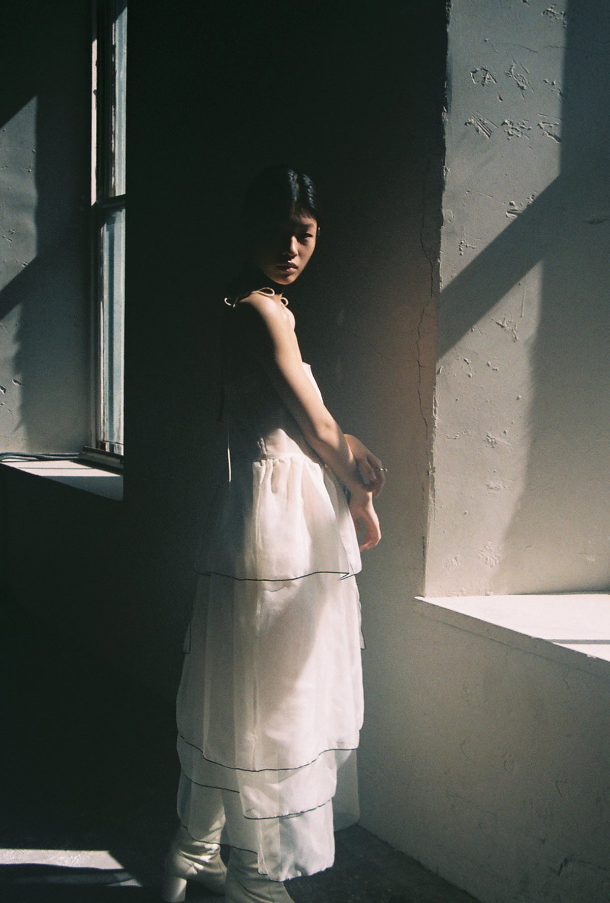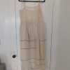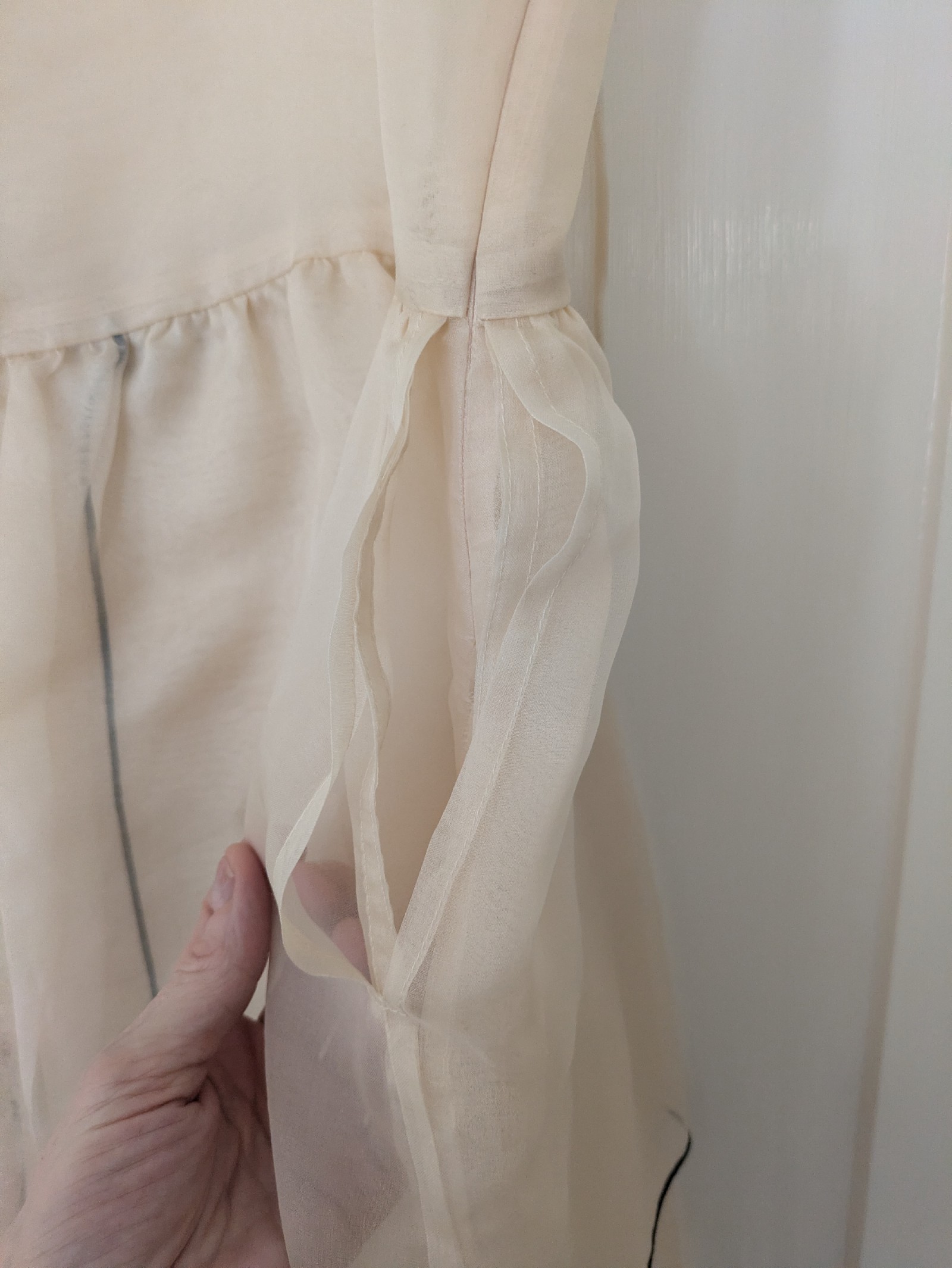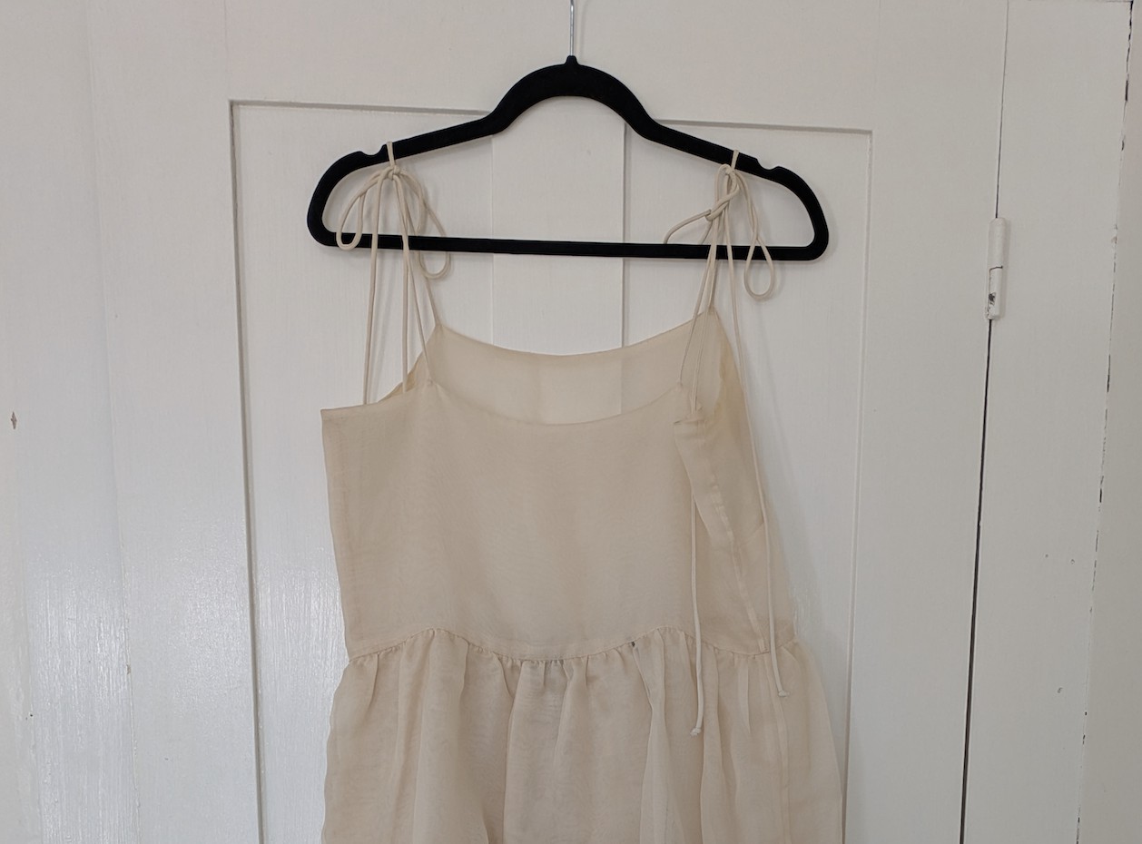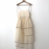 Midi length dress constructed from a delicate ivory silk organza. Self lined bodice with straight cut neckline, dress hits at natural waist and opens up into a full skirt of lightly gathered tiered panels of silk organza. Contrasting black pearl edge finish on each tier adds subtle detail. Thin corded straps tie at the shoulder, invisible side zip closure.
