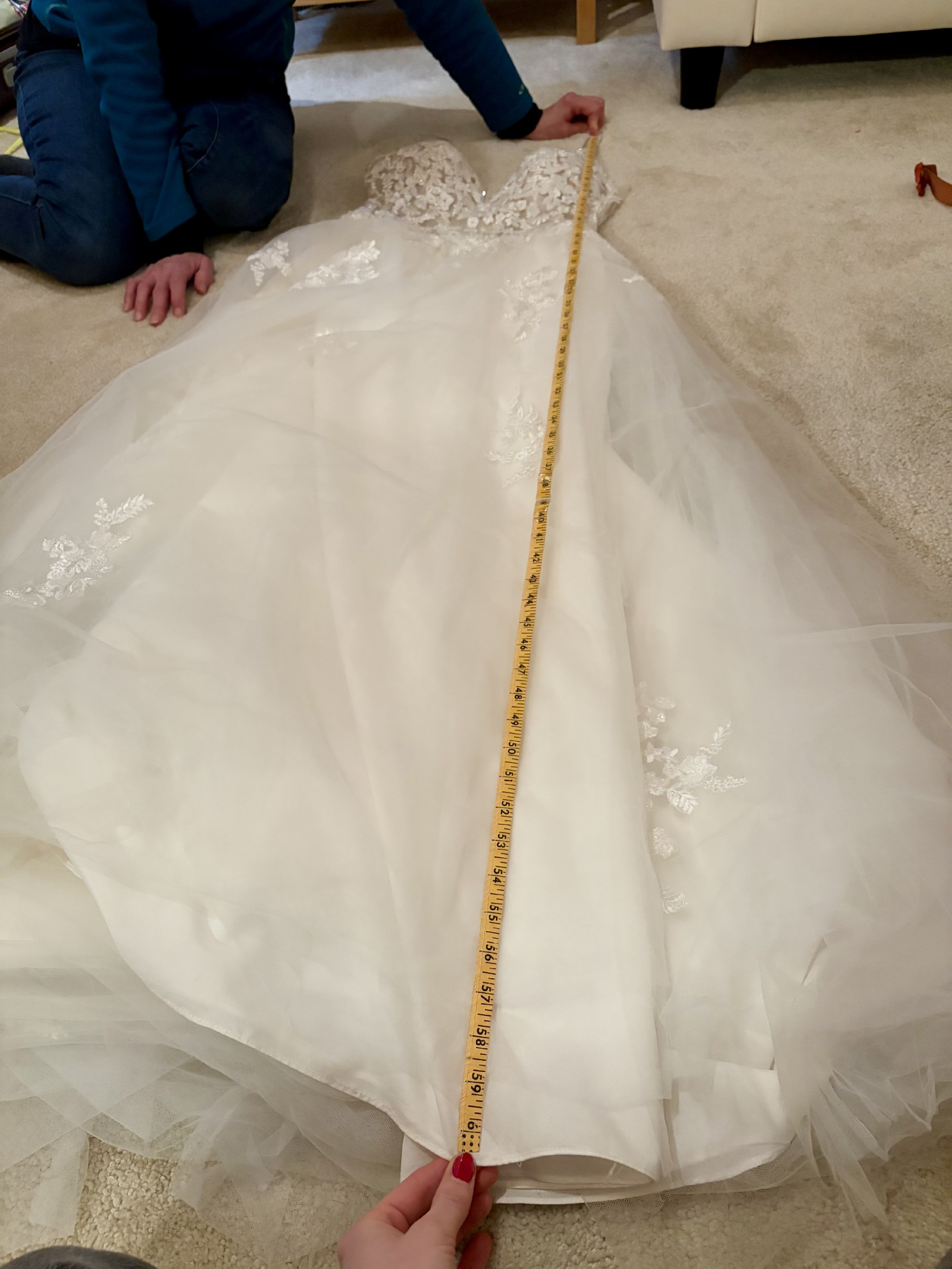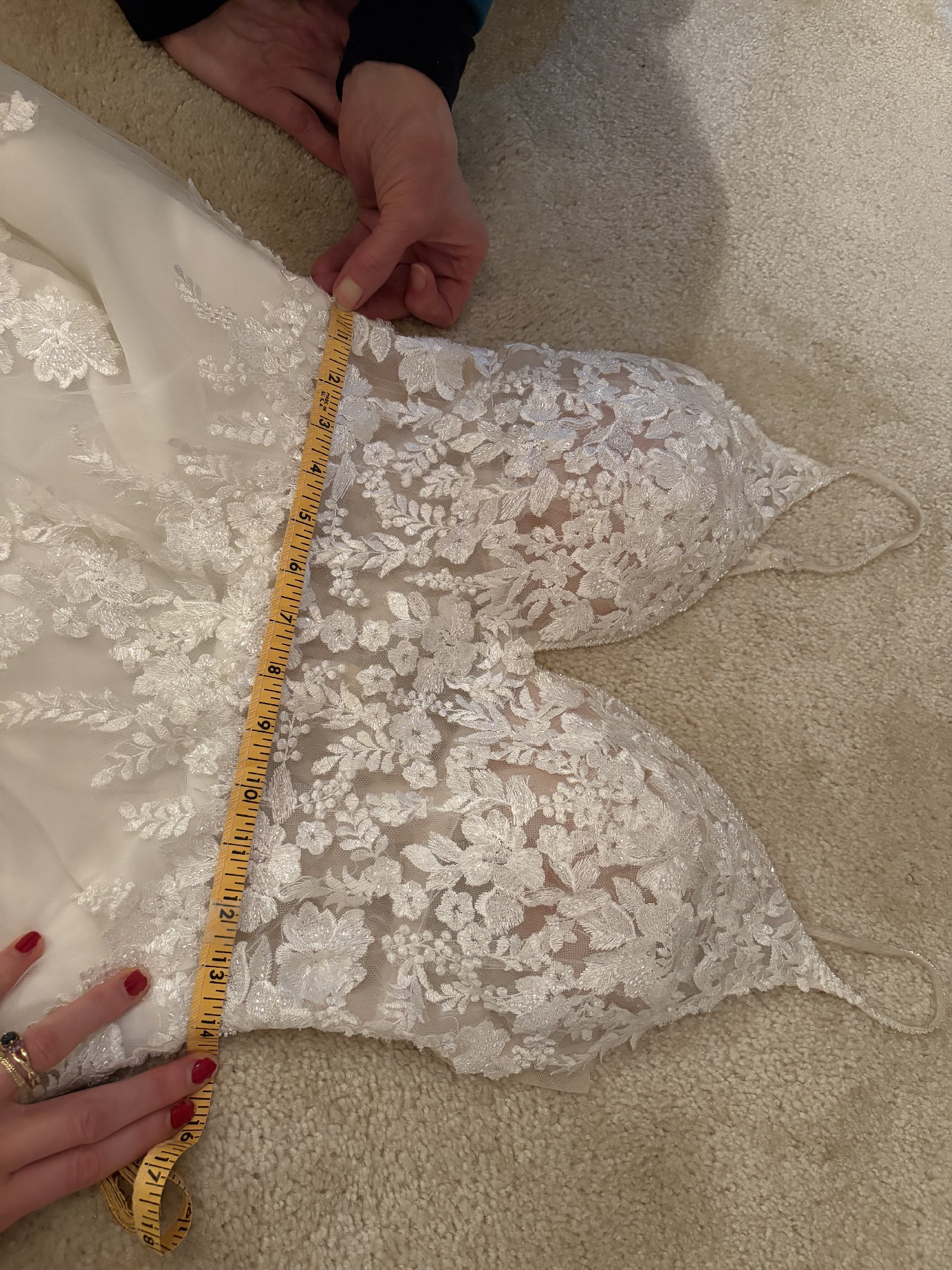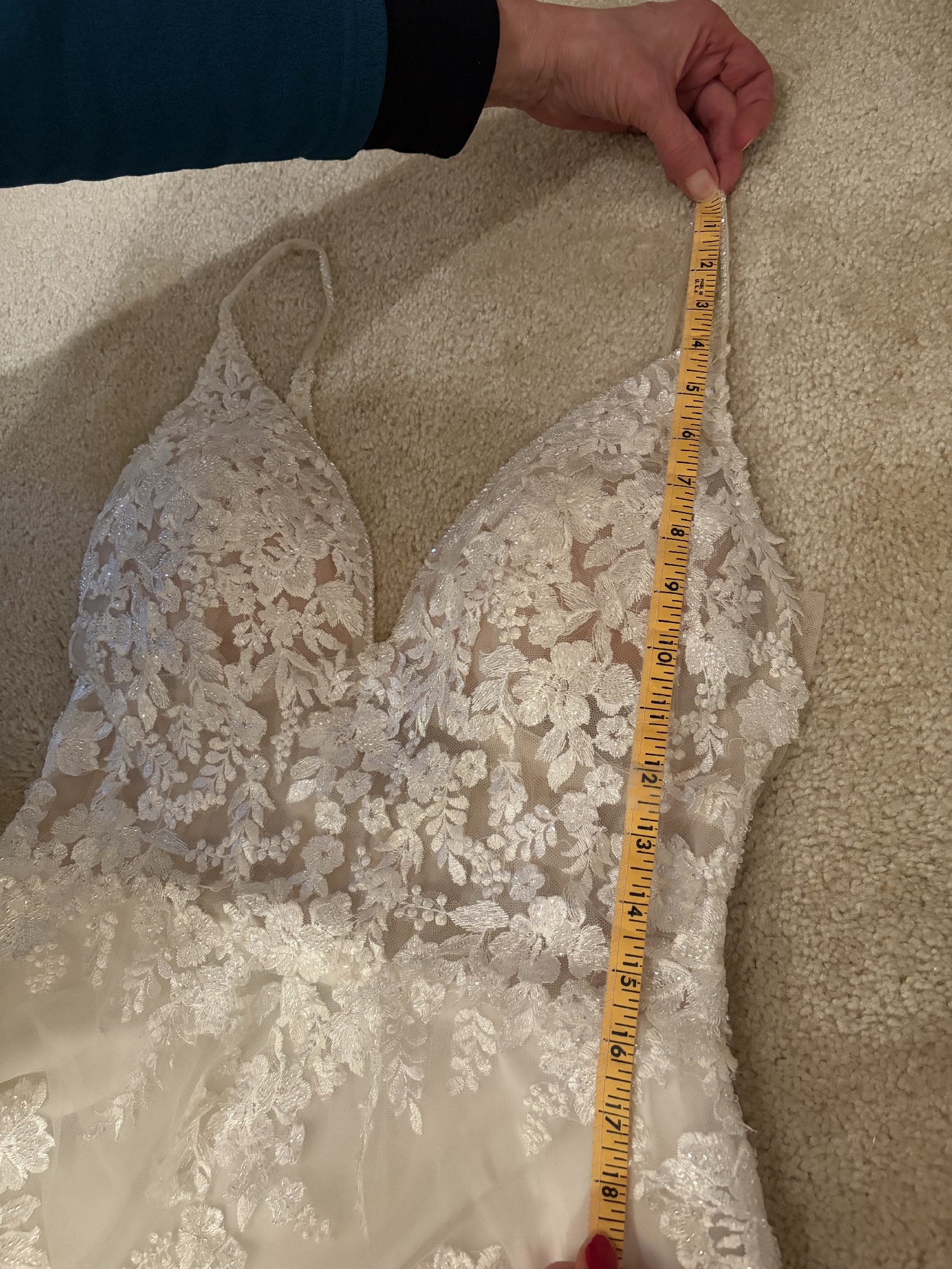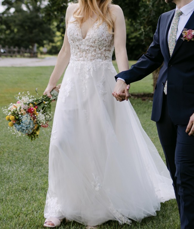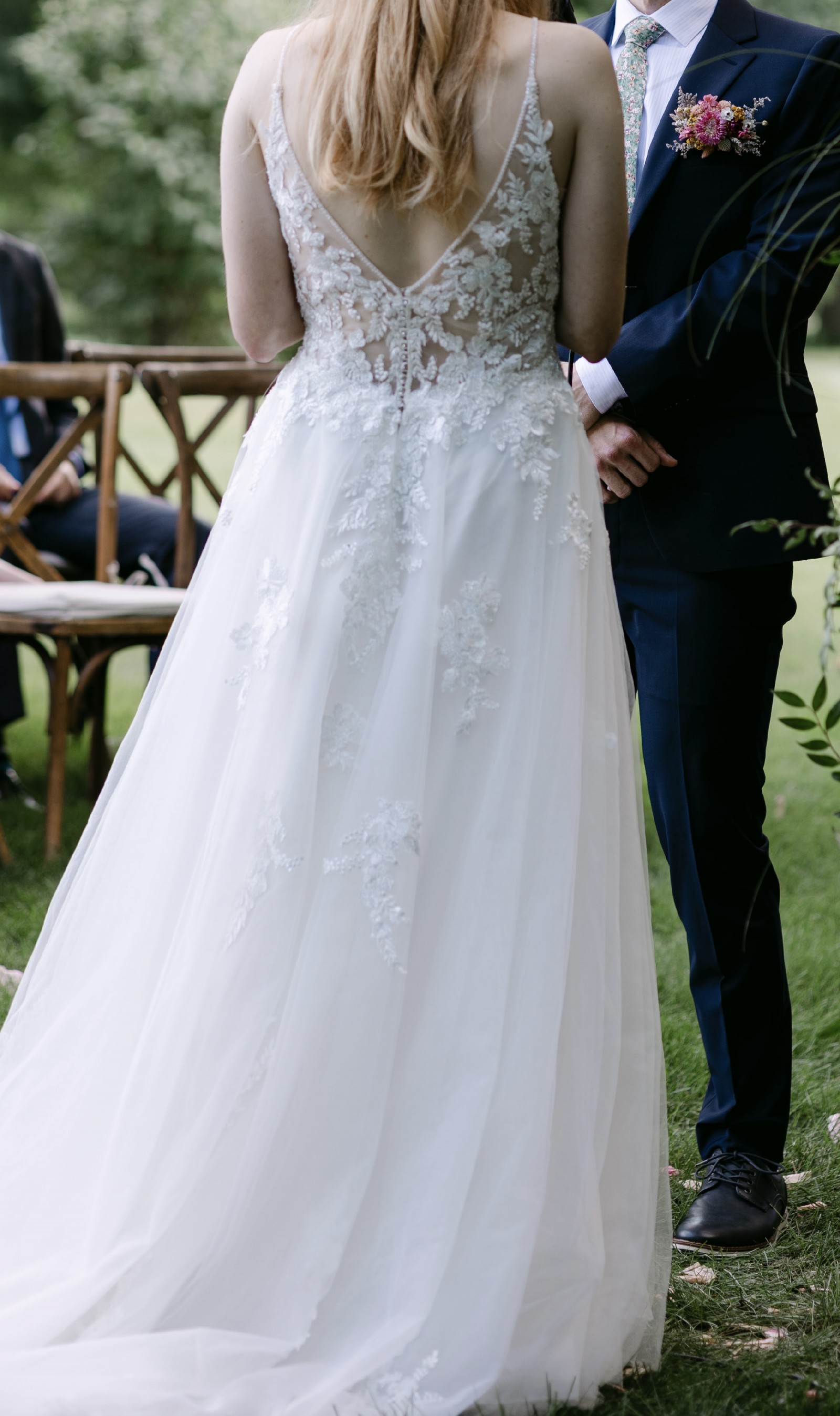 A gorgeous dress worn just once on my wedding day. The dress was a size 8 when I bought it but I had it altered to closer to a size 6. It’s honestly a pretty comfortable dress and lightweight enough to move around and dance without feeling too heavy. Due to the nature of an outdoor wedding, the very bottom of the skirt has a few stains and a couple small tears in the tulle - I could imagine these can be fixed with cleaning / alterations but they are really pretty unnoticeable. Lots of life still left in this dress!