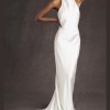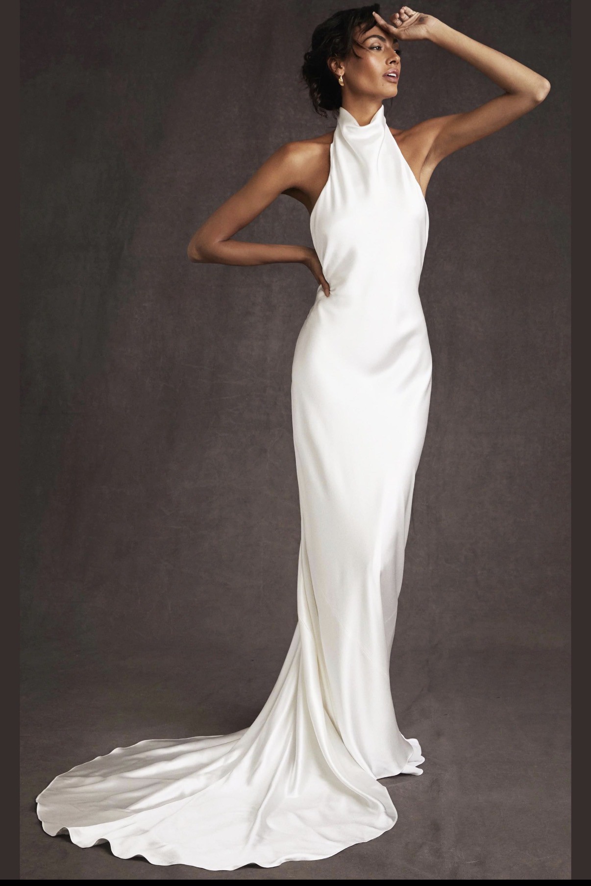 It features a backless design and a haltered neck, with a built in slip and a short train for extra dramatic effect.