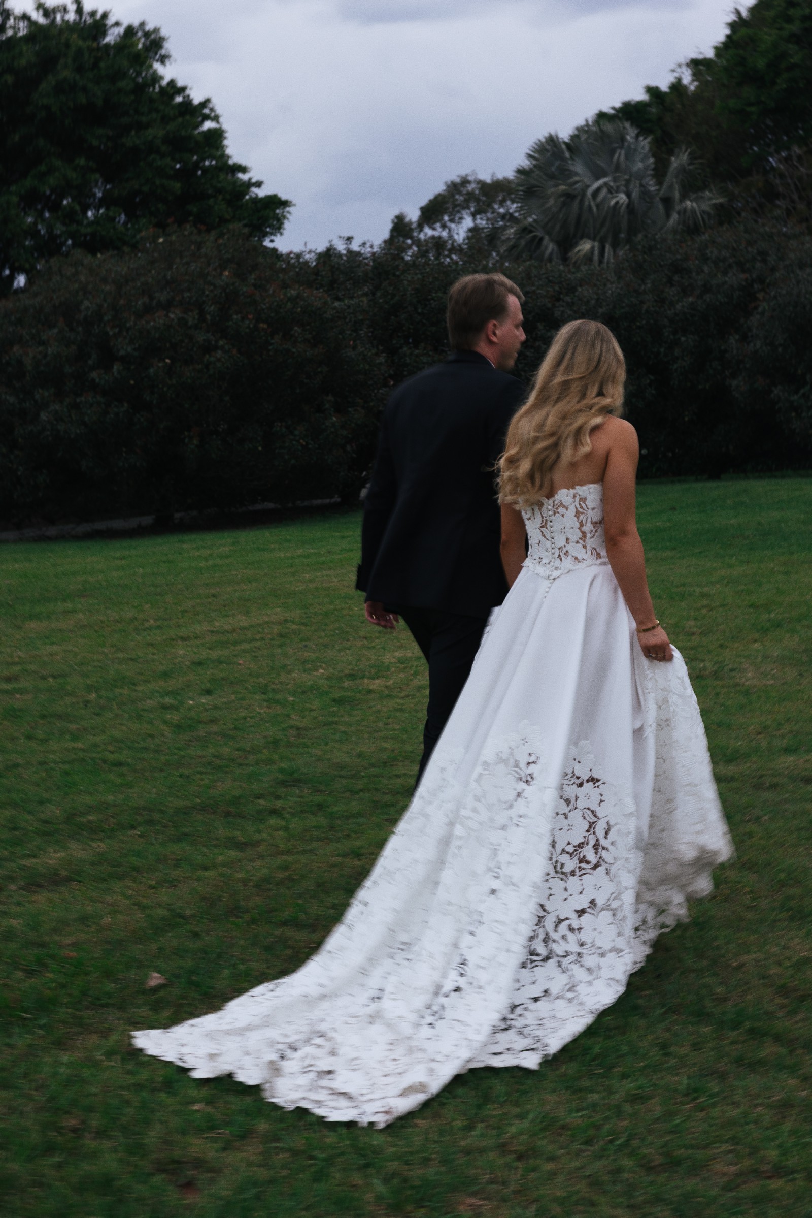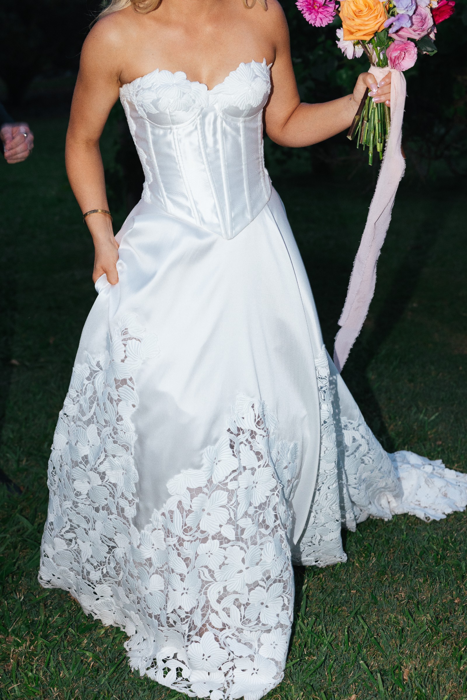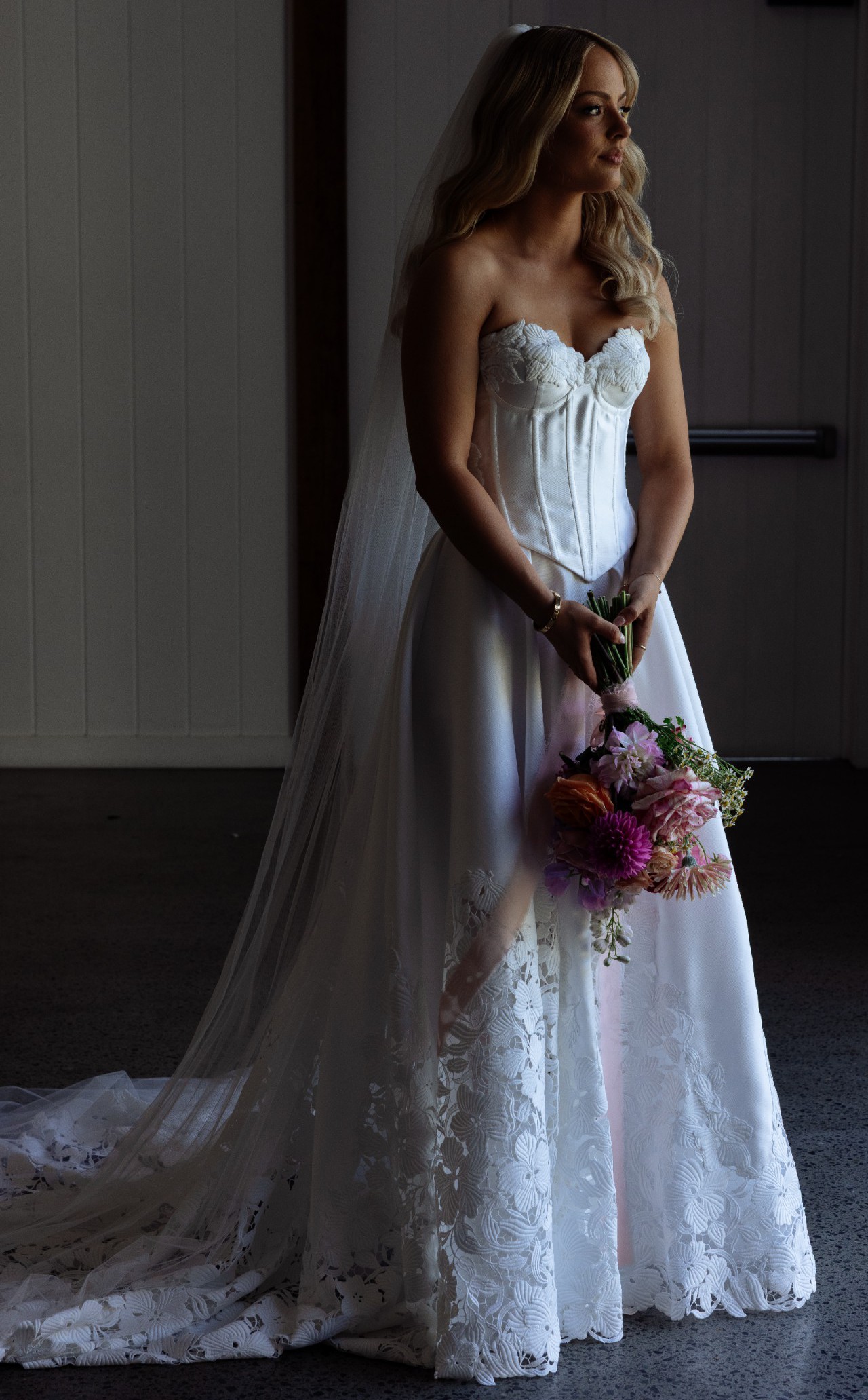 Details from designer - Romance radiates with Vesper’s flattering boned bodice, natural white Mikado and hand-appliqué guipure lace, culminating in a dramatic silhouette.