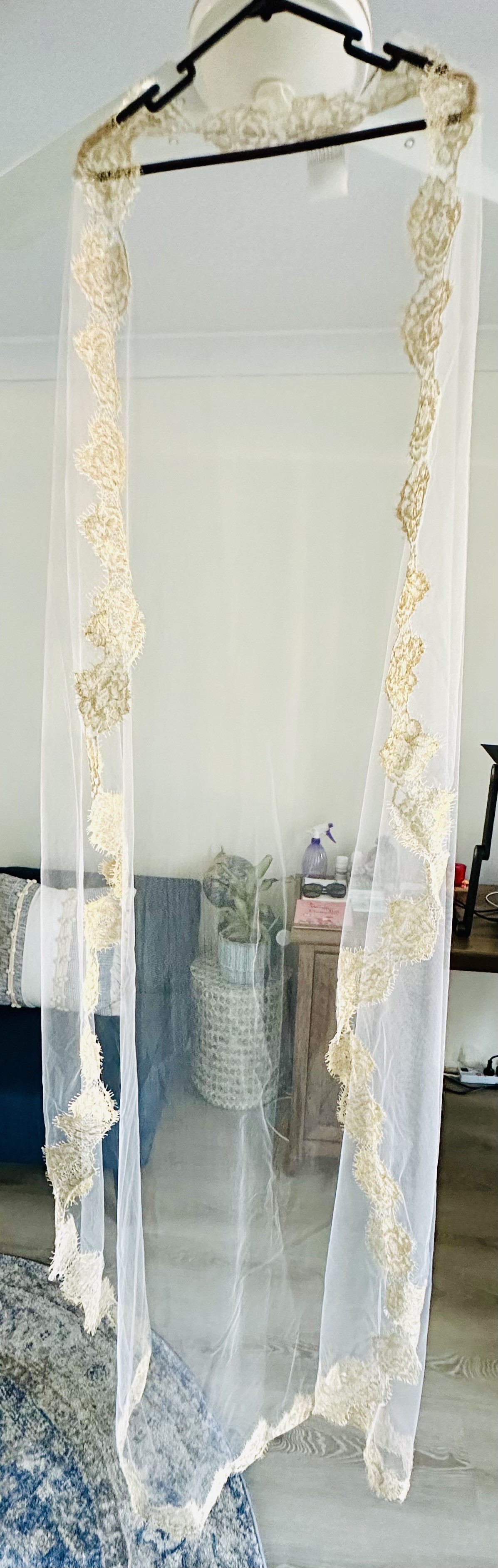 Also included is a custom made, floor length mantilla veil (French Chantilly lace with gold lace trim), to complete the Grecian goddess look.