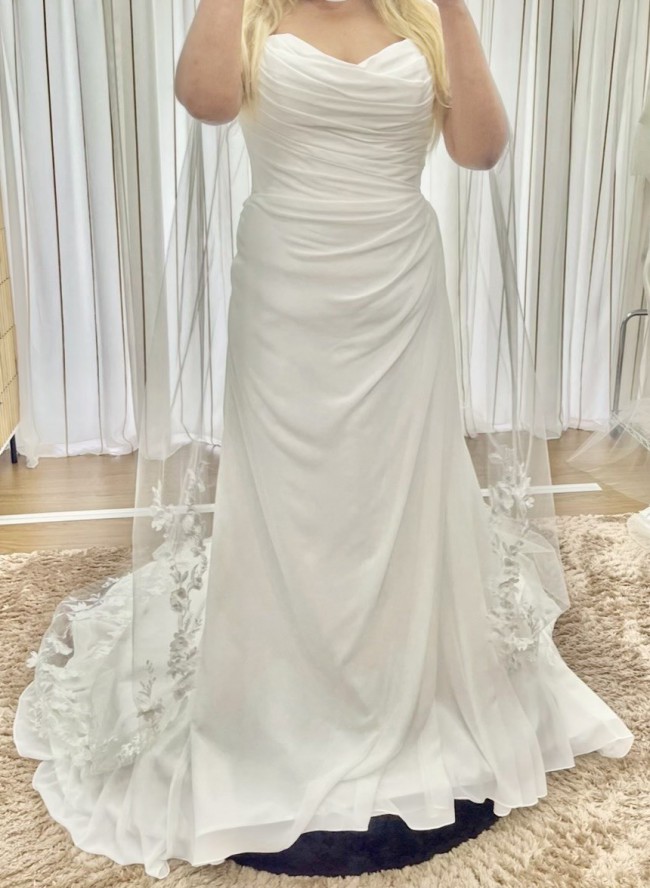 Romantic, Grecian style chiffon wedding dress with semi-sweetheart neckline, beautiful covered buttons and comfortable silhouette that creates a timeless style. Can be personalised with Francesca detachable sleeves from Maggie Sottero website. Brand new, no alterations and never worn.