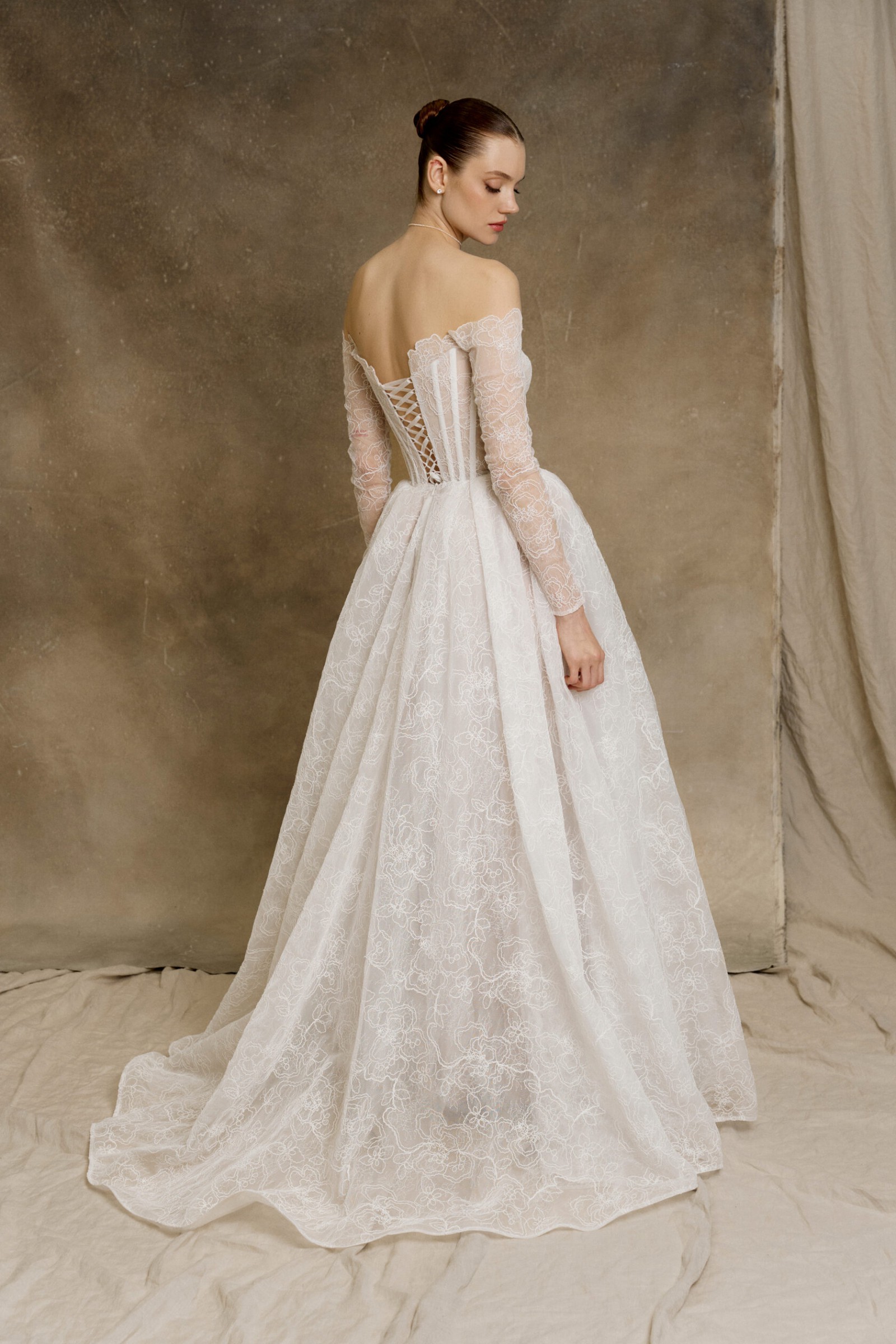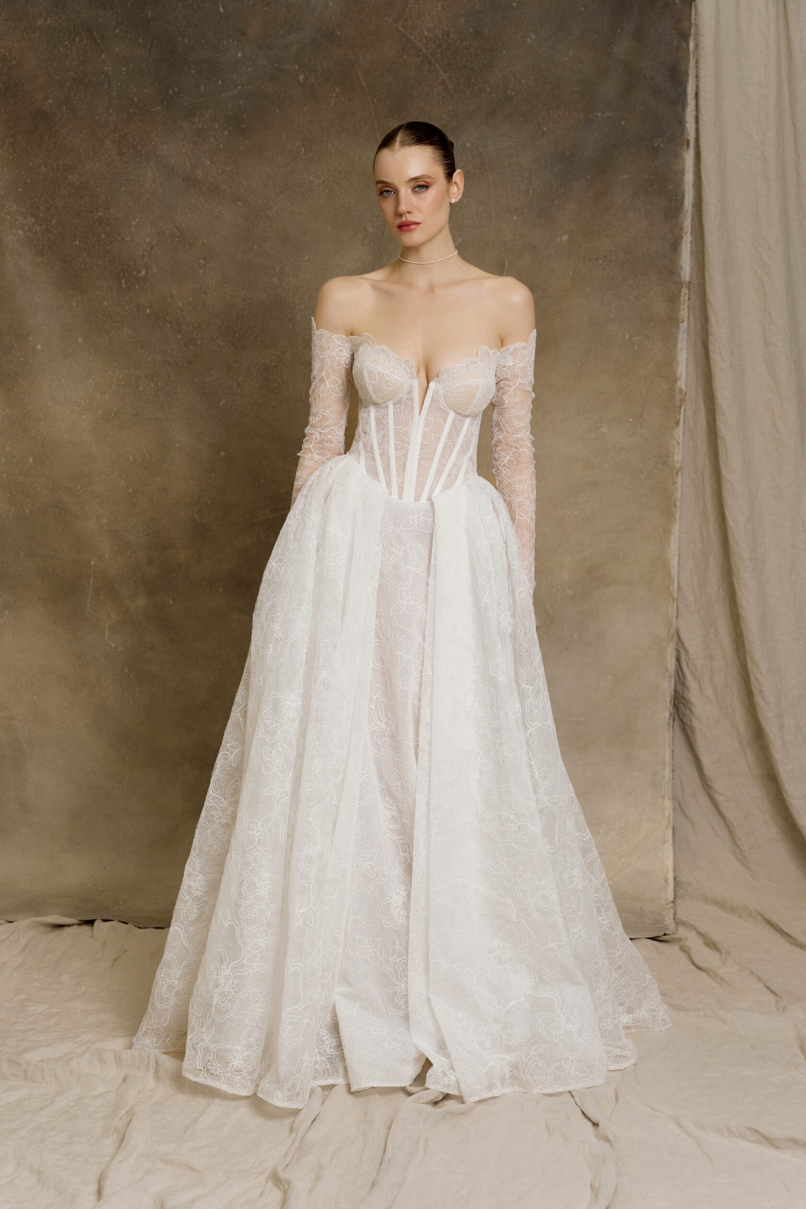 The long sleeves provide a vintage charm, while the option for detachable sleeves allows you to transform your look effortlessly throughout your special day. The corset back offers an exquisite fit, enhancing your silhouette while ensuring comfort as you move and dance. The beautiful ivory color radiates purity and classic elegance, promising a timeless look in your wedding photos.