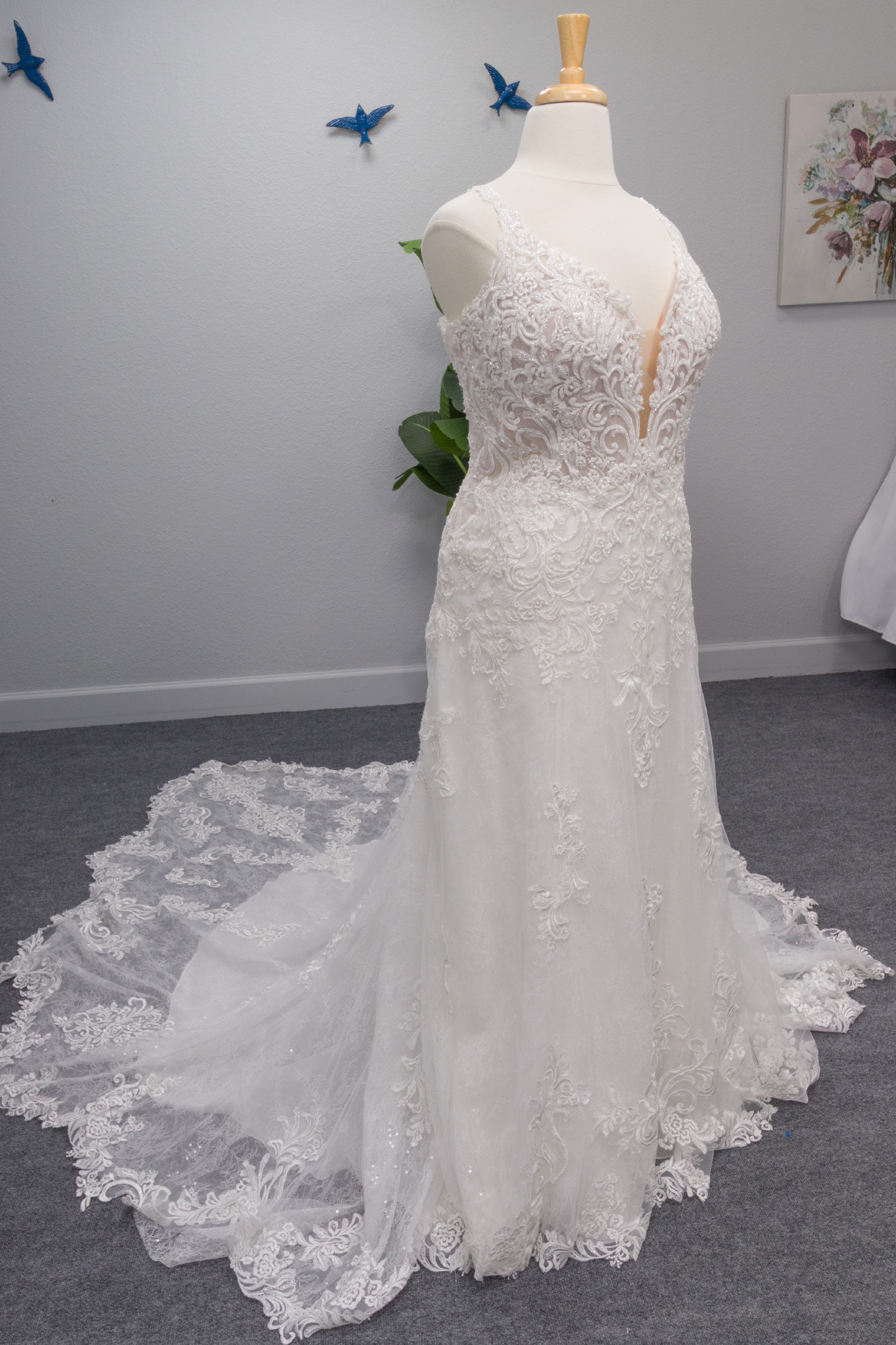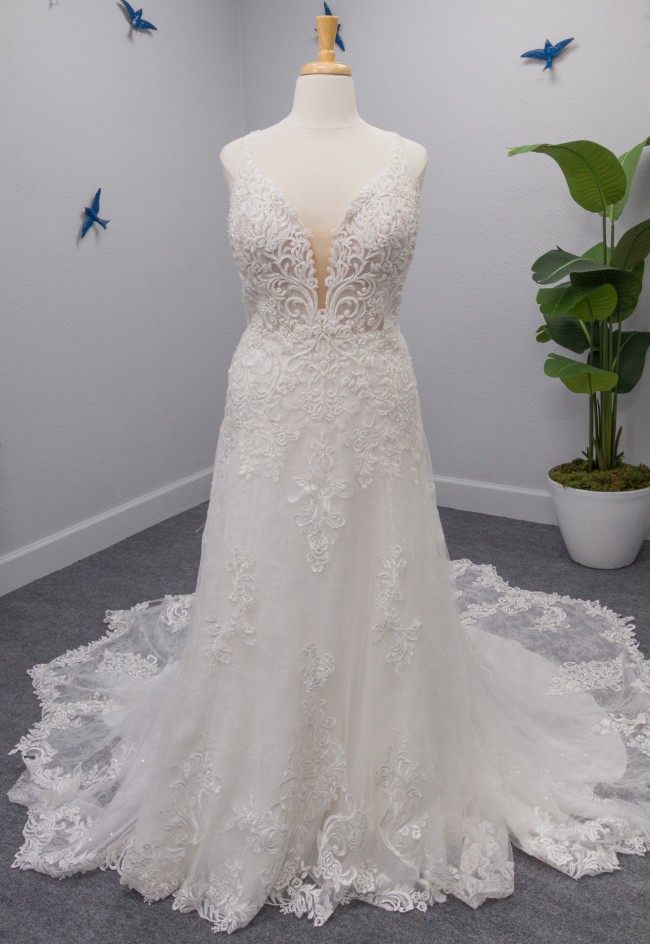 - Bridal sizing varies by designer — use your measurements, not your usual size. It is best to be under on all 3 measurements to have it brought it during alterations