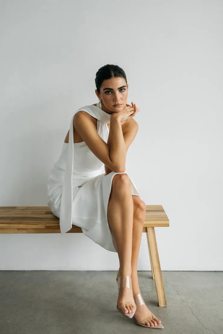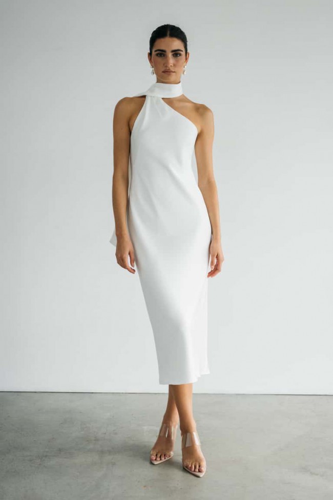 The Rowan dress, cut in the sumptuous hammered satin makes a sleek, chic statement. Cut on the bias for a barely there, body skimming feel, her asymmetrical halter neckline is finished with a dramatic scarf detail.
