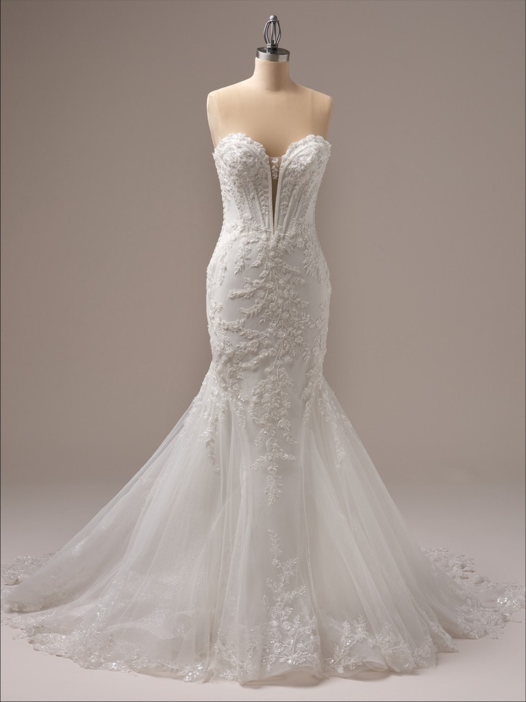 This exquisite Maggie Sottero Benjie Royale wedding dress is a stunning choice for any bride looking to make a lasting impression on her special day. The fit and flare silhouette gracefully hugs the figure before cascading into a breathtaking skirt, creating an alluring shape that accentuates curves beautifully. The sweetheart neckline adds a romantic touch, perfectly showcasing the décolletage while remaining elegant and timeless.