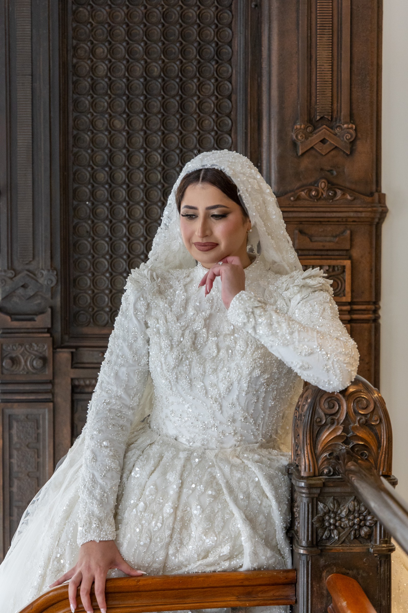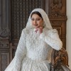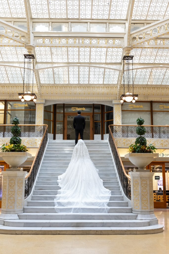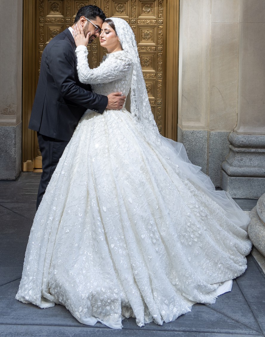The craftsmanship, structure, and detailing rival top couture bridal houses, with exceptional attention to fit, drape, and finish. The gown includes a full cathedral-length 6-foot veil, completing the timeless bridal look.