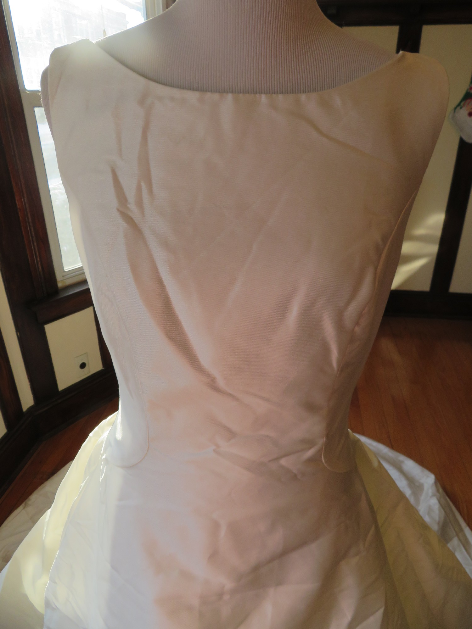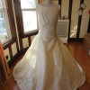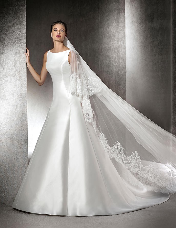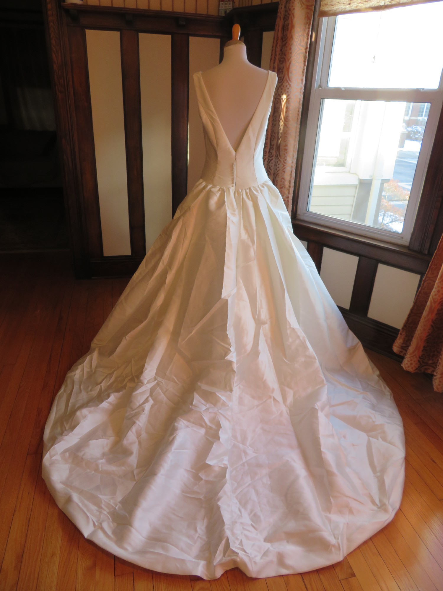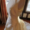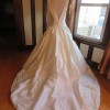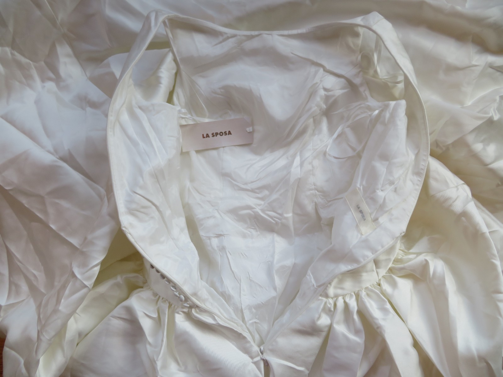This is an Authentic LA SPOSA by PRONOVIAS Bridal Wedding Dress Gown. It has a gorgeous A line style with a fabulous long train. The gown is made of high grade satin. The skirt has netting petticoat inside to support a perfect shape. This dress is new in good condition with the original label and tags. It was never worn. There are minor stitching marks around the neckline, which is subtle and not noticeable to others when worn.
