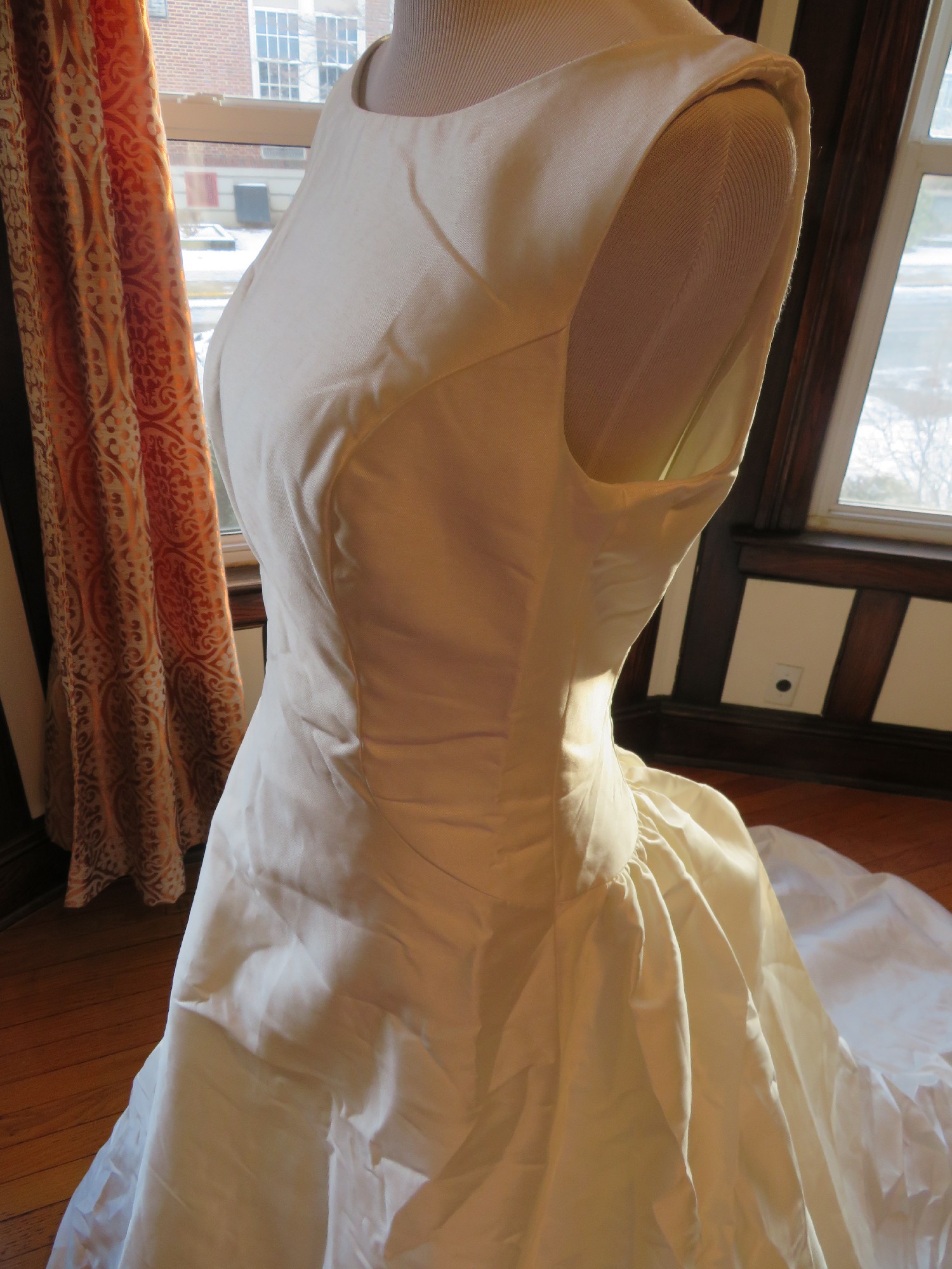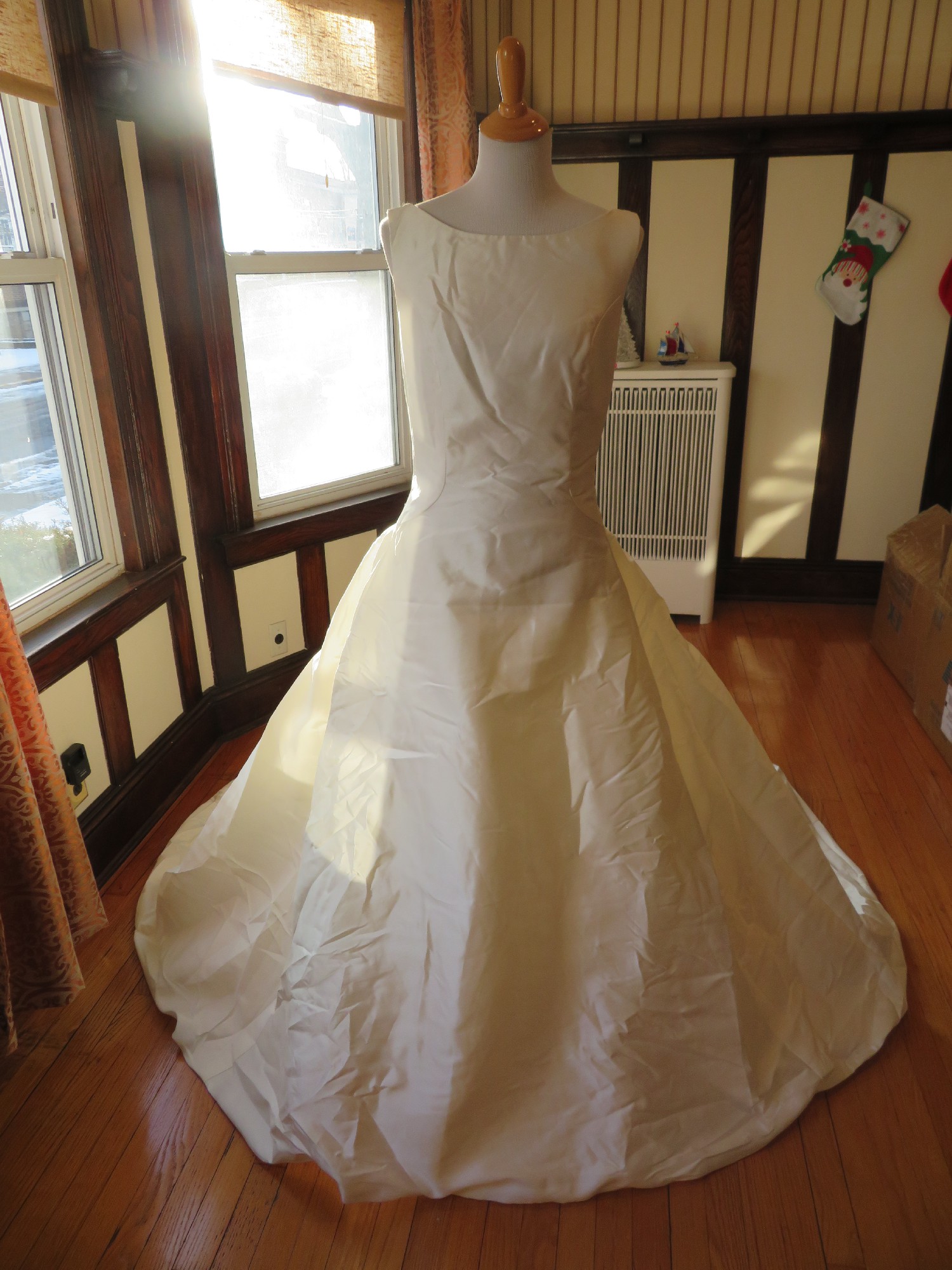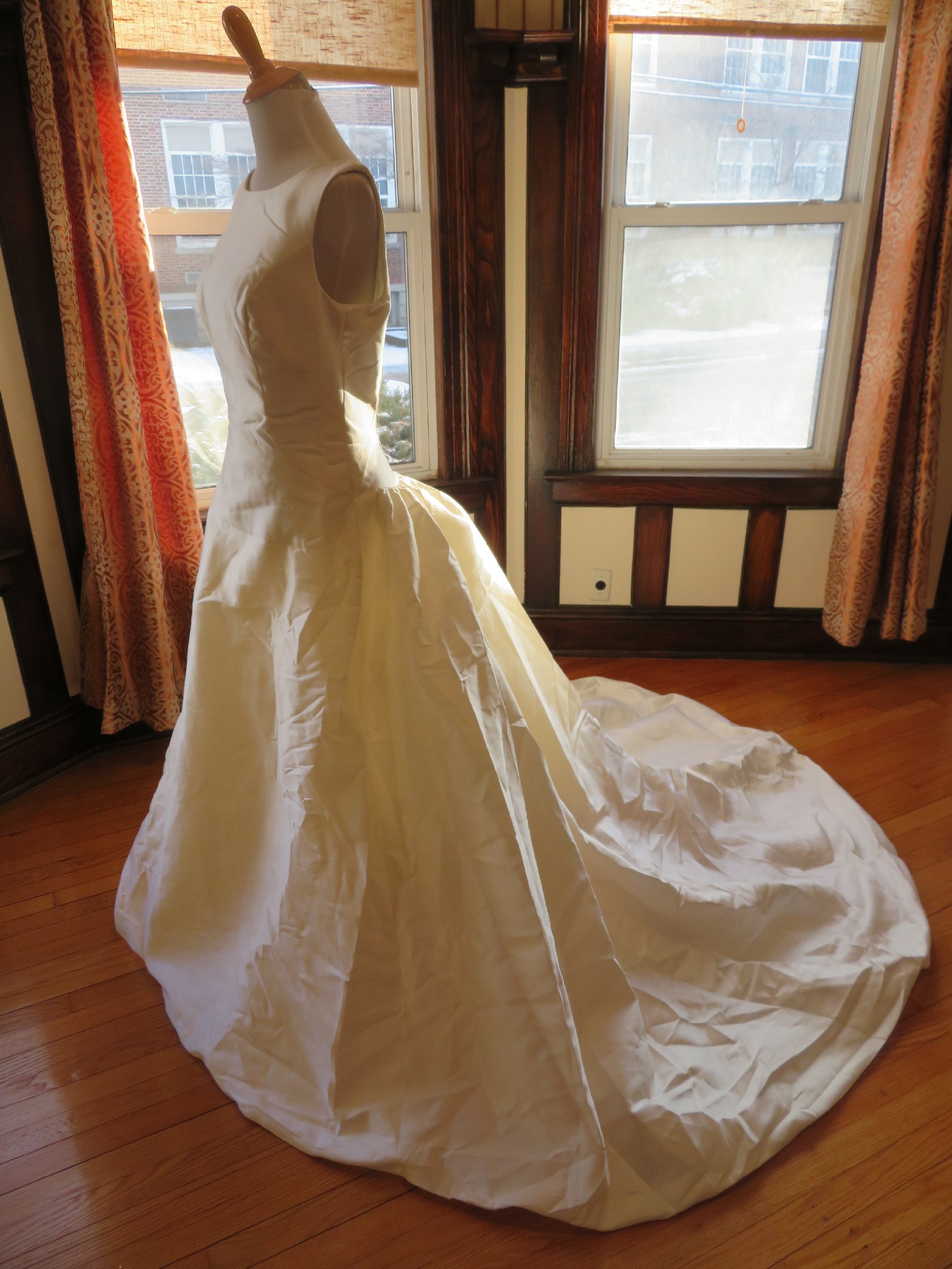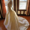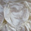 This is an Authentic LA SPOSA by PRONOVIAS Bridal Wedding Dress Gown. It has a gorgeous A line style with a fabulous long train. The gown is made of high grade satin. The skirt has netting petticoat inside to support a perfect shape. This dress is new in good condition with the original label and tags. It was never worn. There are minor stitching marks around the neckline, which is subtle and not noticeable to others when worn.
