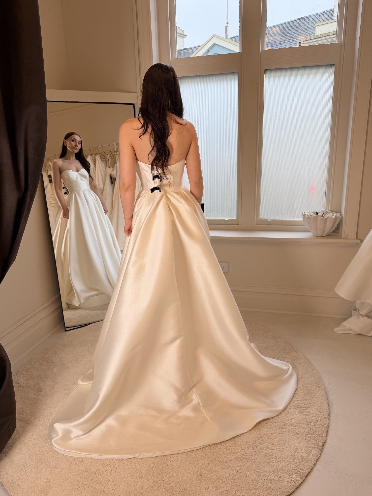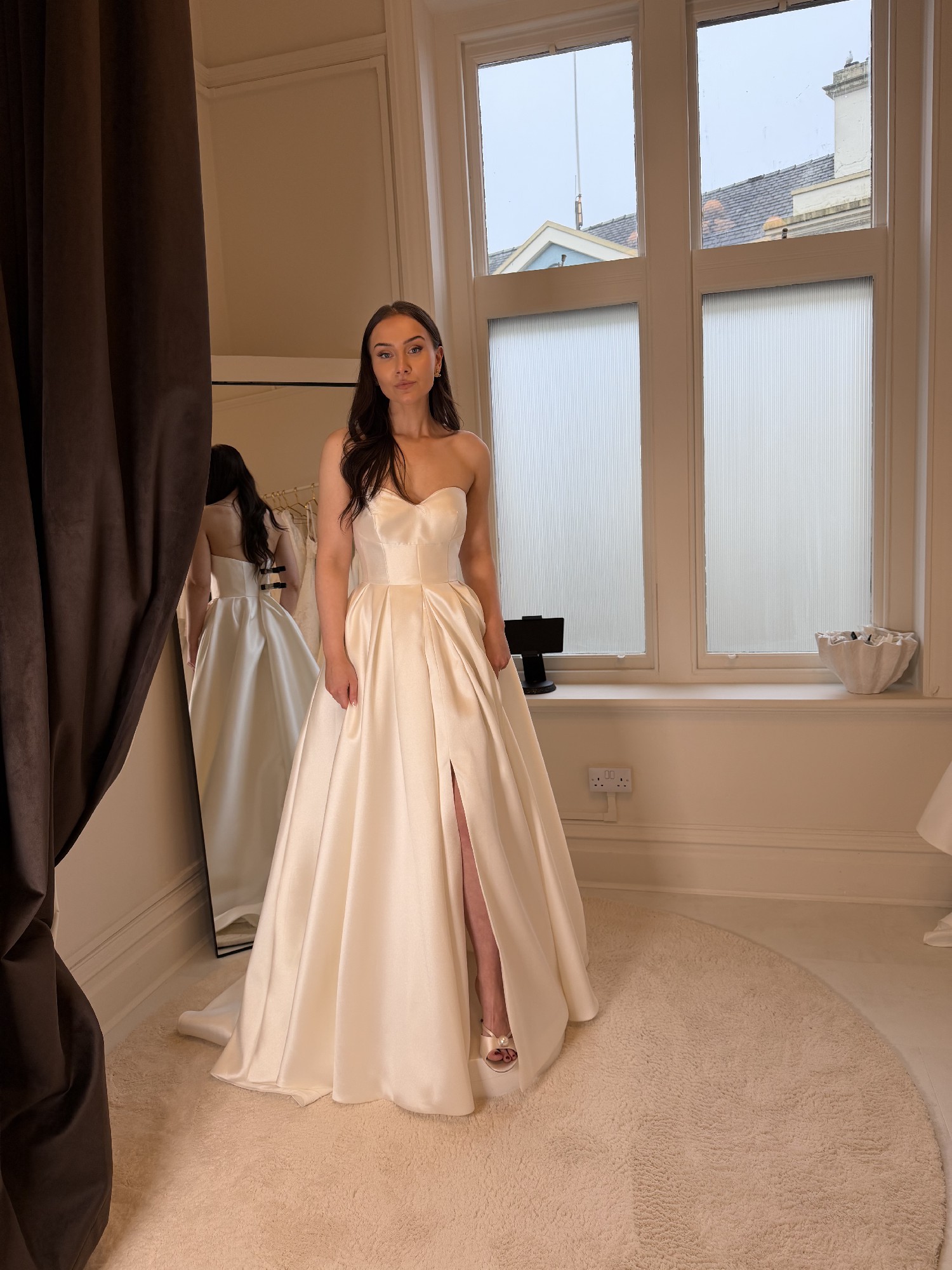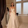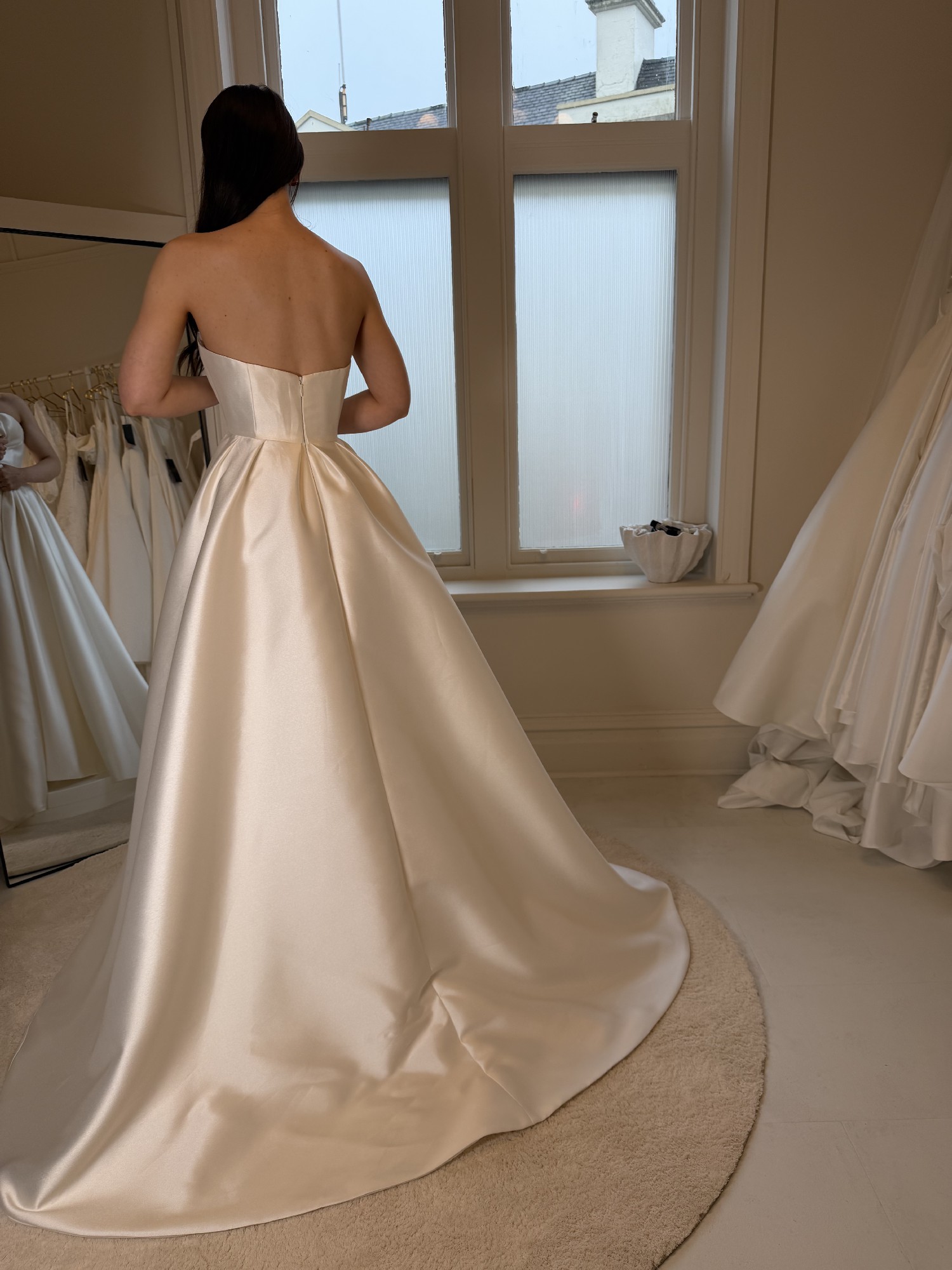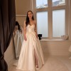 Mikado Contemporary dress with a fitted bodice and full split skirt with train.