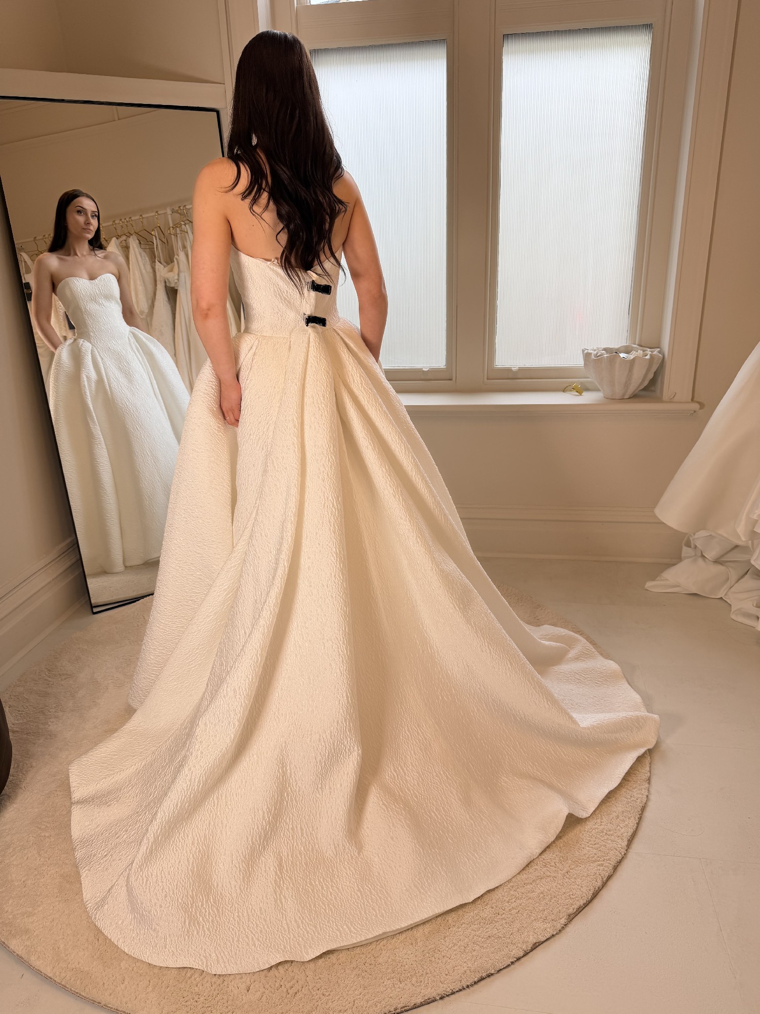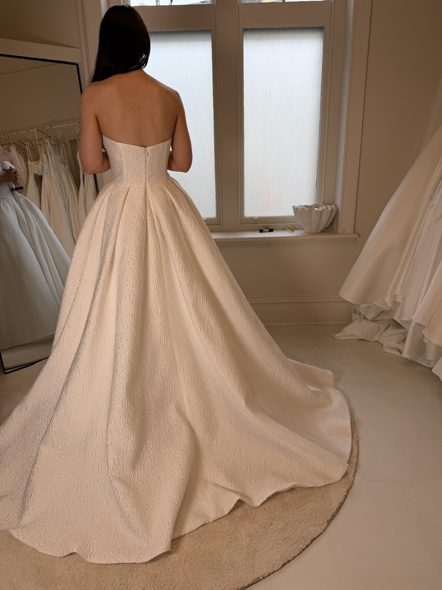 Cloque contemporary dress with a fitted strapless bodice and full pannier skirt.