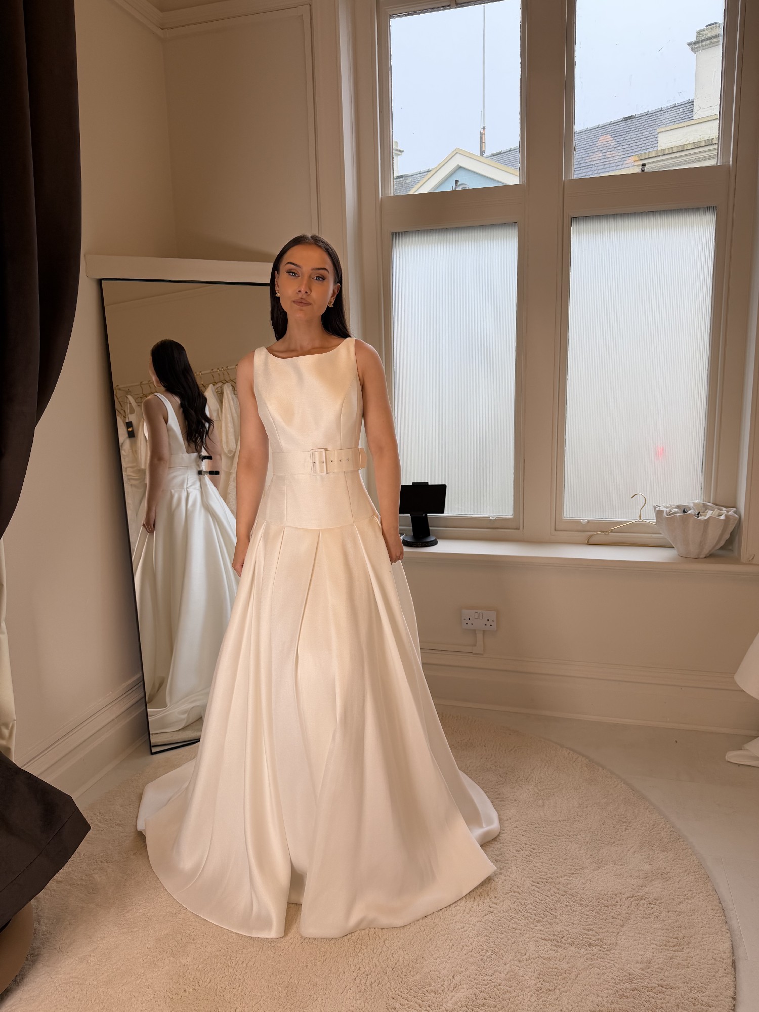 Contemporary dress in Linen Mikado with a fitted bodice to hip, wide fabric belt and full skirt with train.