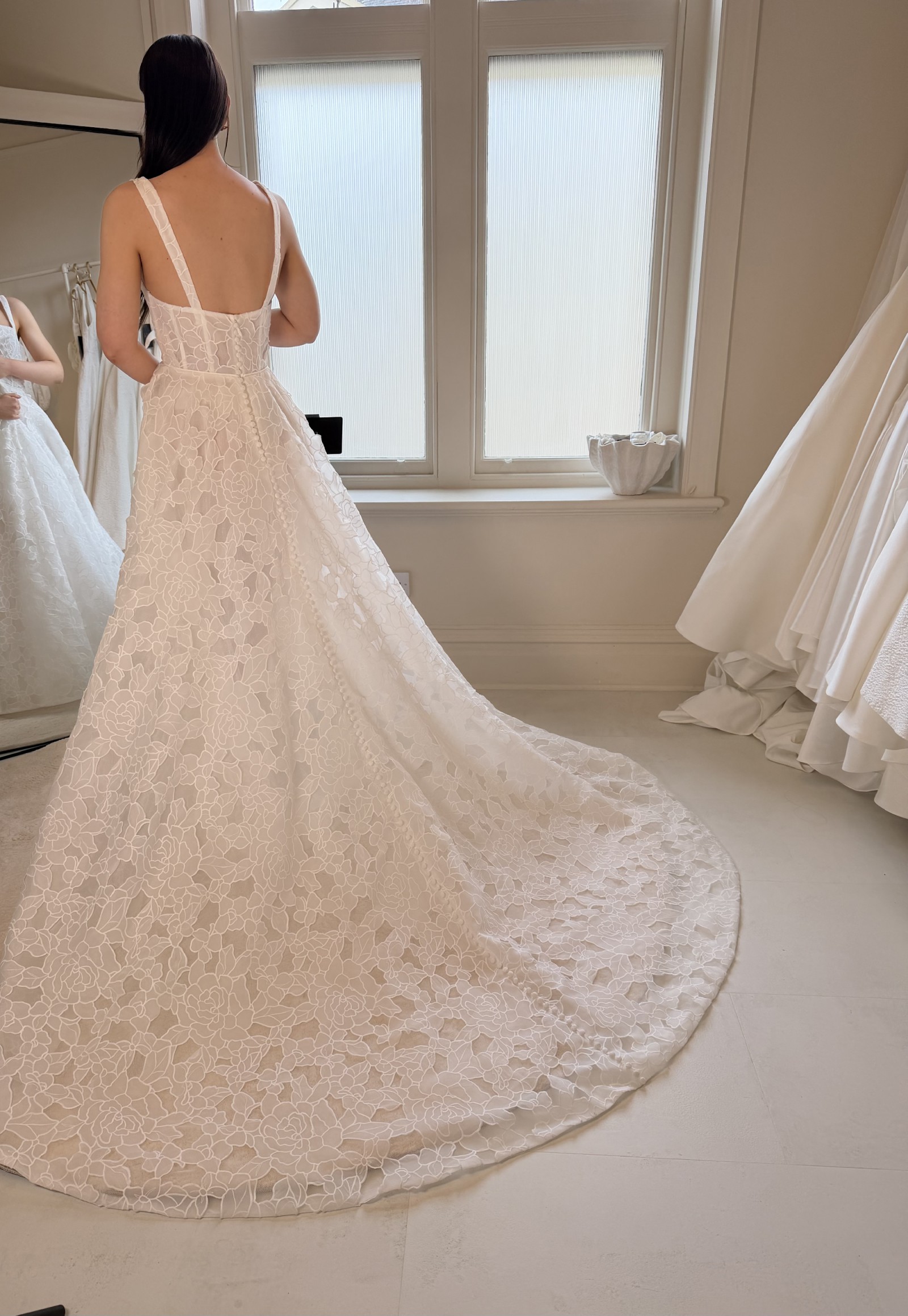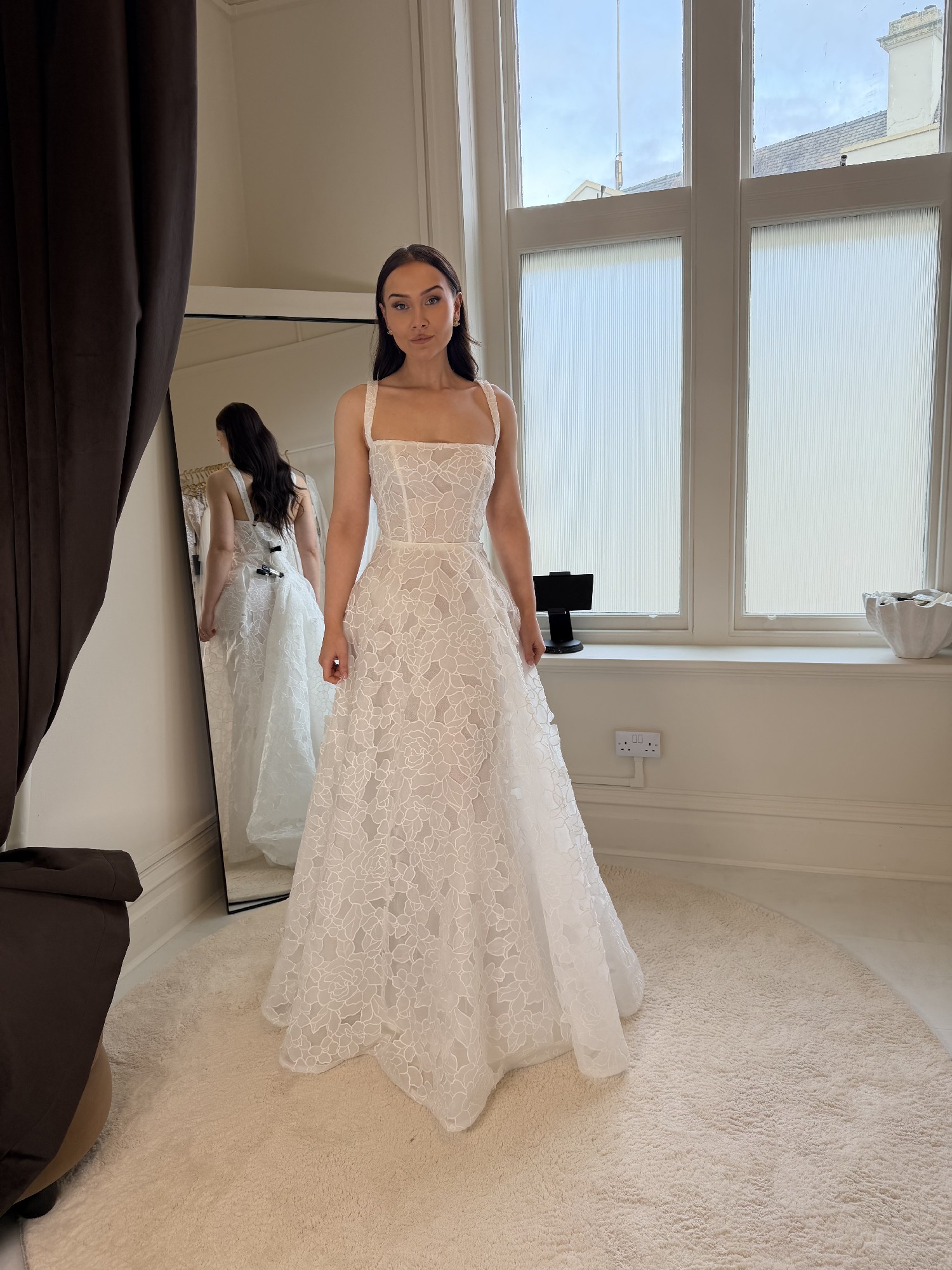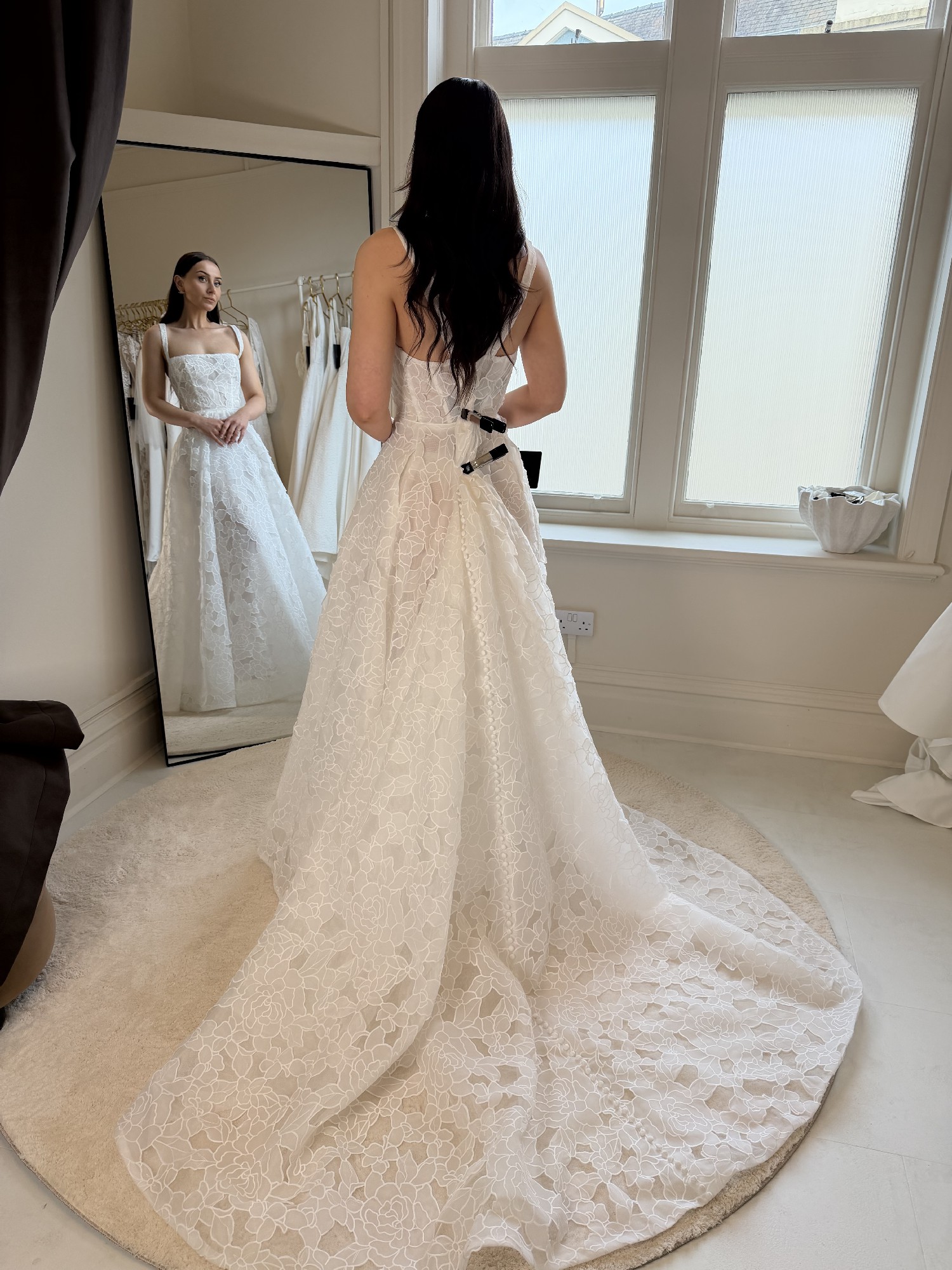 This can be taken out by 1 dress size and taken in by two dress sizes - we work in cm's and not inches. We also have an in house seamstress so can advise on any alterations you plan to make first hand. Please provide accurate measurements as all dresses are non refundable. As the new season approaches we are making space for new dresses. If you have any questions at all please contact the bridal studio direct or send us a message.