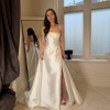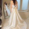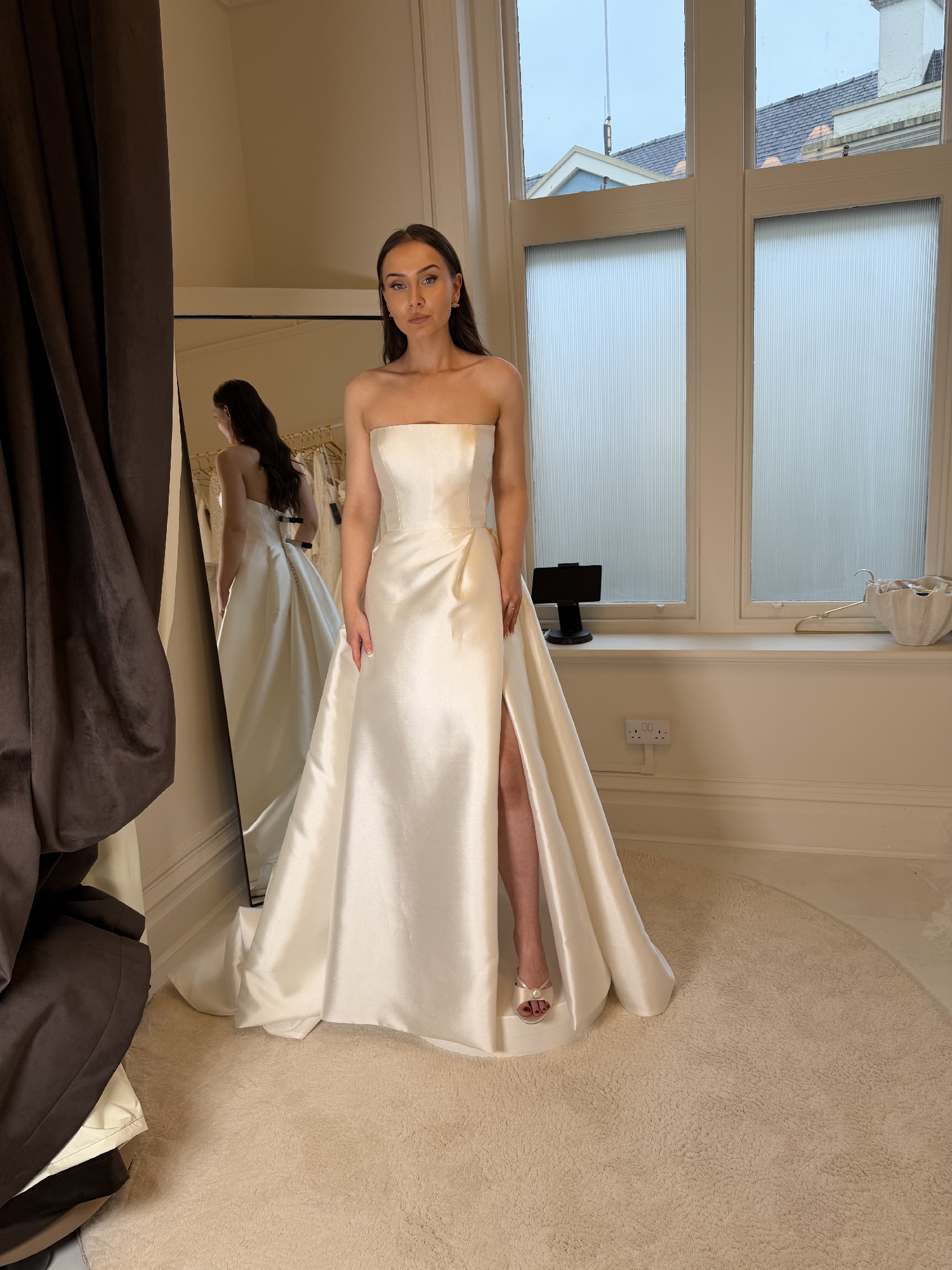 The Catherine gown takes a modern approach to old Hollywood glamour. Cut in our luminous sleek Mikado fabric, she features a sharp straight neckline, sculpted clean bodice, and sweeping ball skirt with a sultry slit. Angled pleat details add volume and interest to the dramatic skirt.