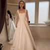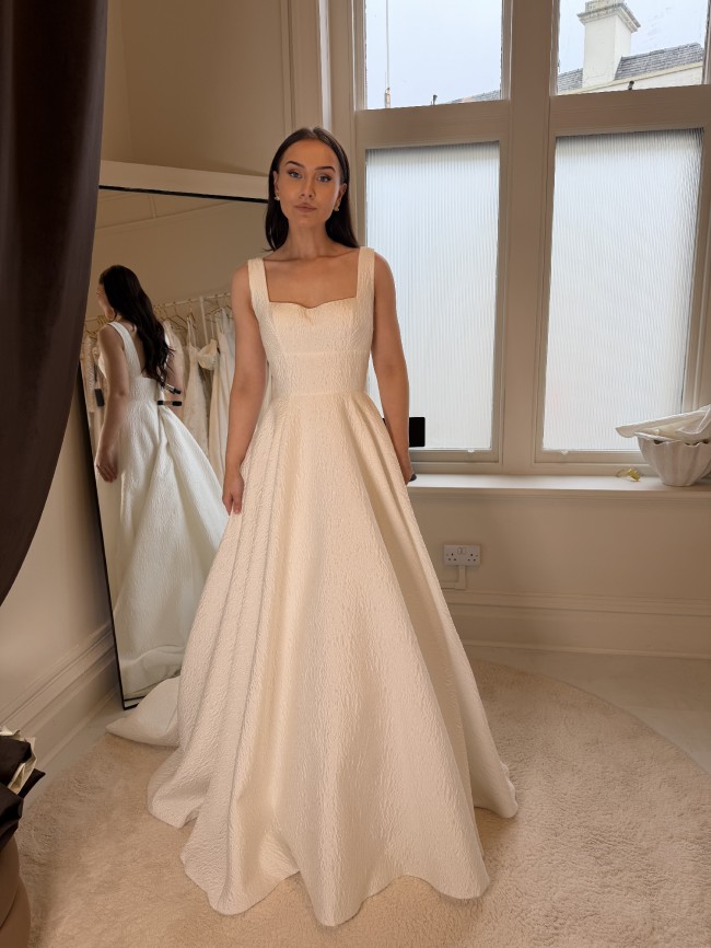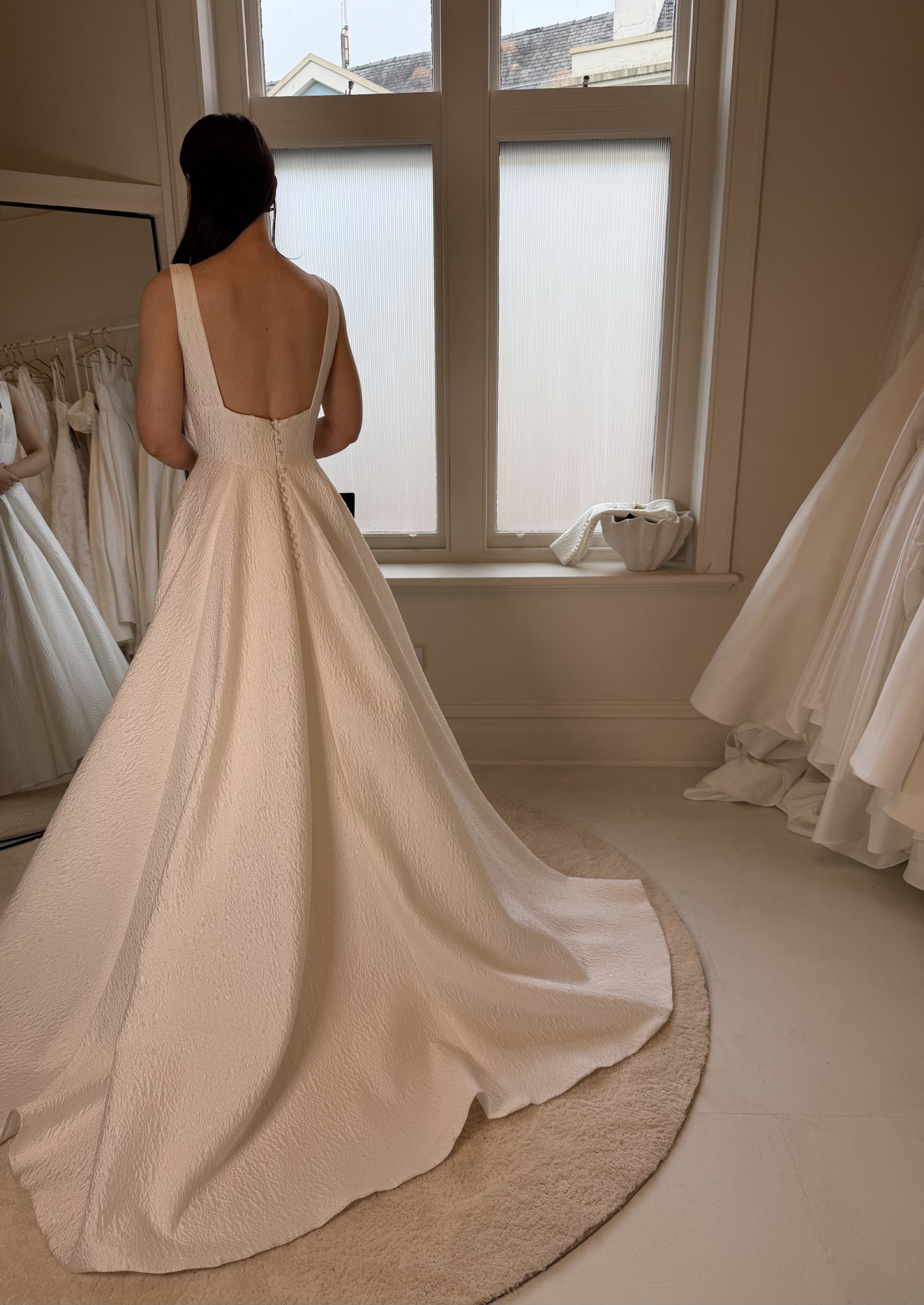 Made from luxurious textured cloque fabric. A boned fitted bodice, with a refined square neckline. The full skirt, complemented by discreet pockets, because what bride doesn't love pockets right?