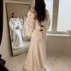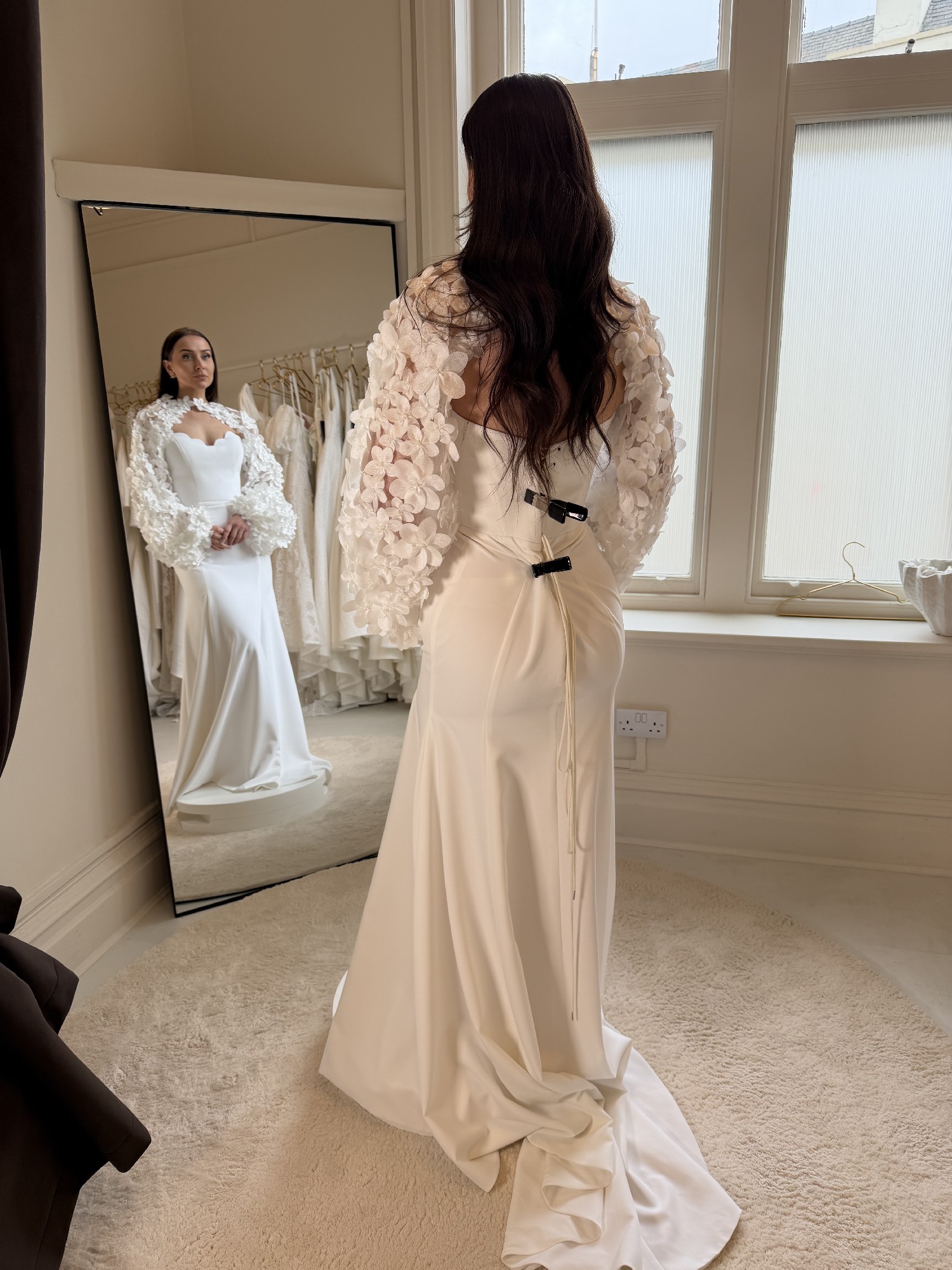 Slender and minimalist trumpet dress featuring a contoured wavy neckline and a flawless silhouette. The standout detail is a floral application bolero, adorning the shoulder line and giving the dress a fresh look or eye-catching puffed bolero, creating volume around the waistline and adding a playful touch.