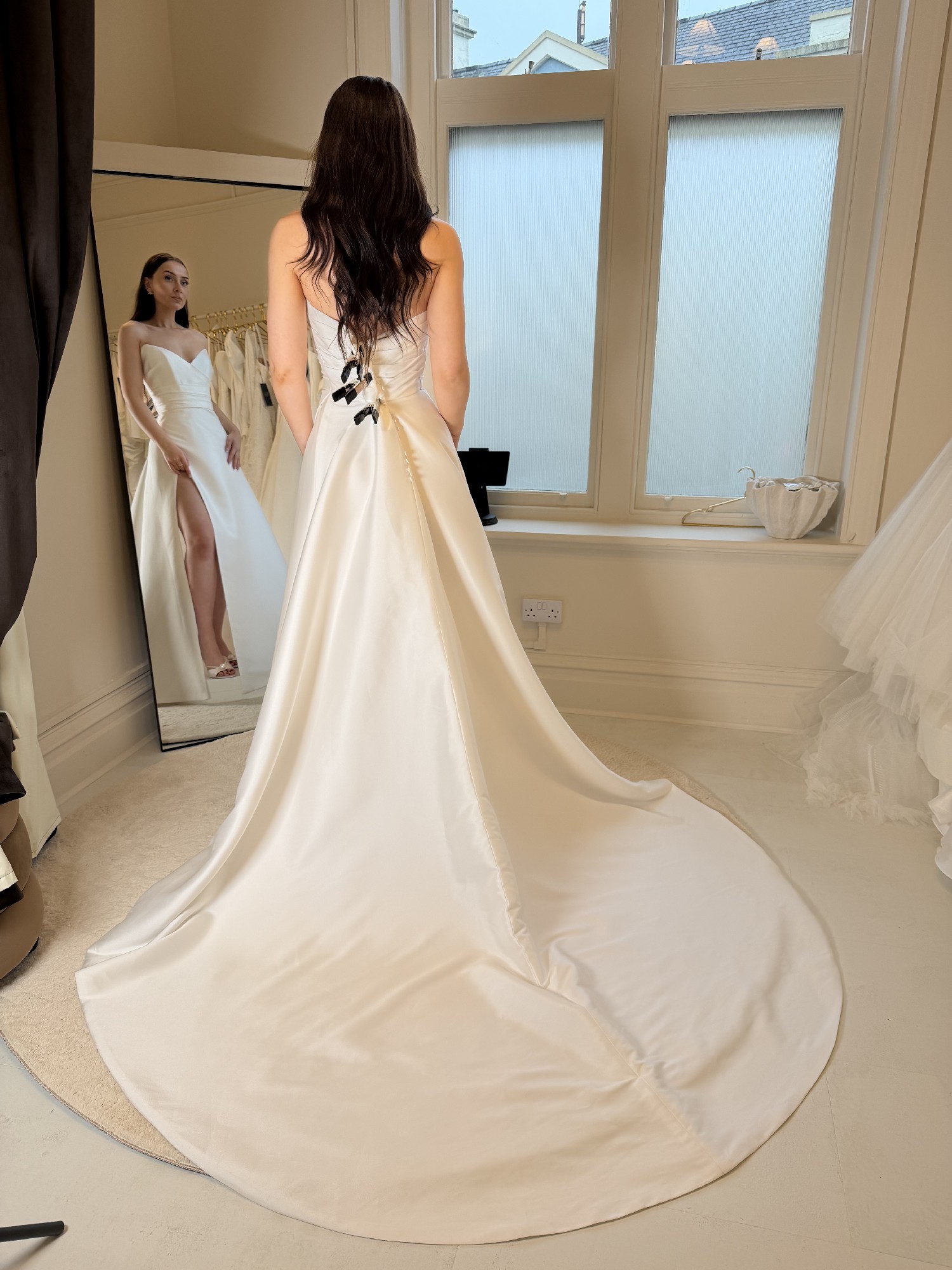 Choose Rae with a daring cross over high split in her skirt for an added dash of drama, or close her split for a more classic, seamless look. As the perfect cherry on top, Rae's back is lined to the zip with gorgeous Mikado buttons for a beautiful feminine touch.