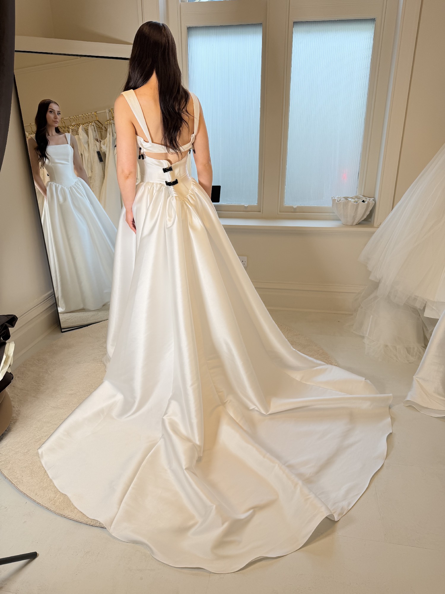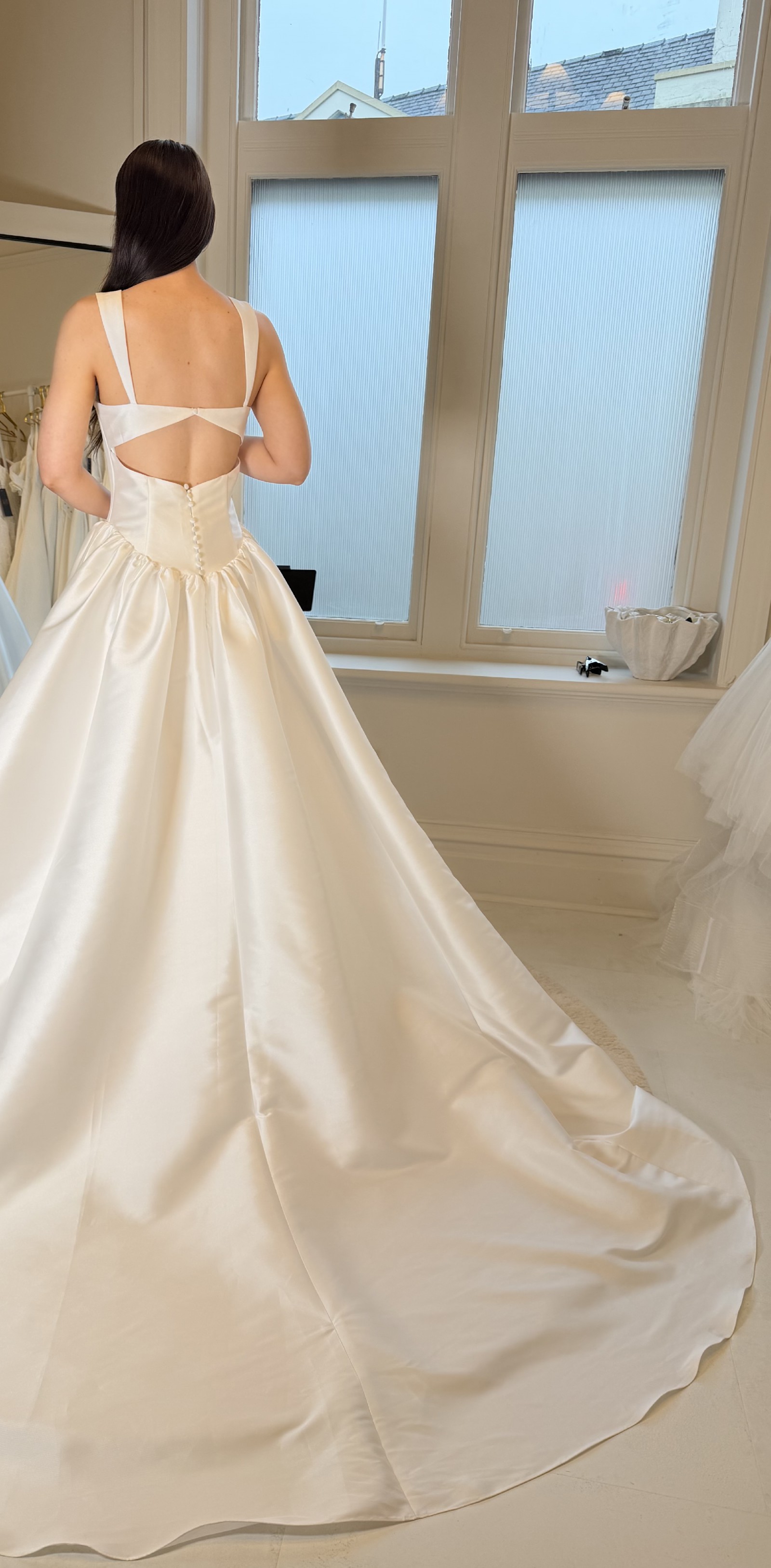 A striking diamond-shaped back cut-out adds a modern touch, beautifully highlighting the skin and adding a hint of allure. The exquisite button detailing along the back offers a classic element, creating a sense of timeless sophistication that complements the overall design.