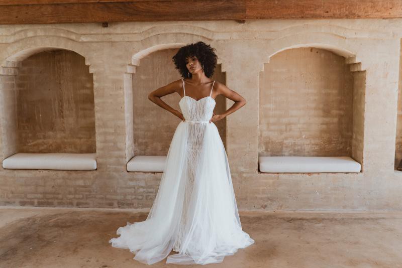 Stunning dress embellished with intricate beaded tulle! Low back, stunning detachable over skirt