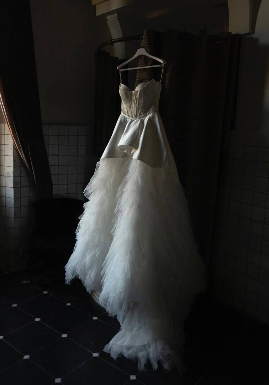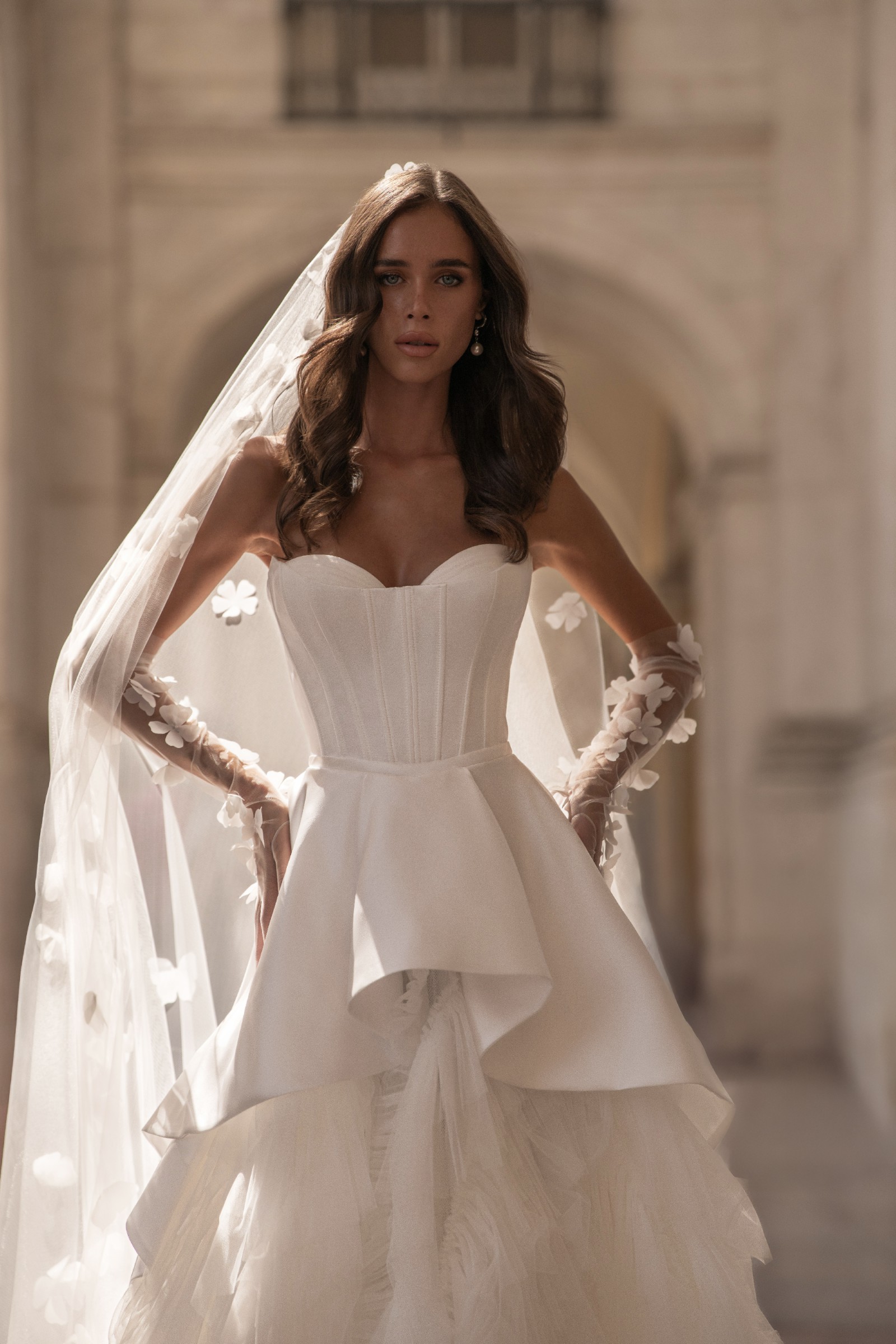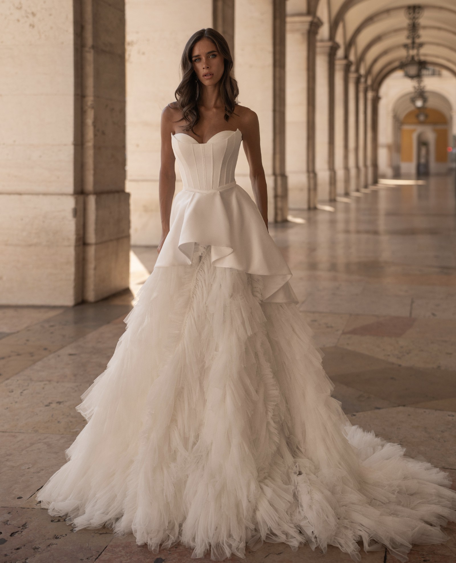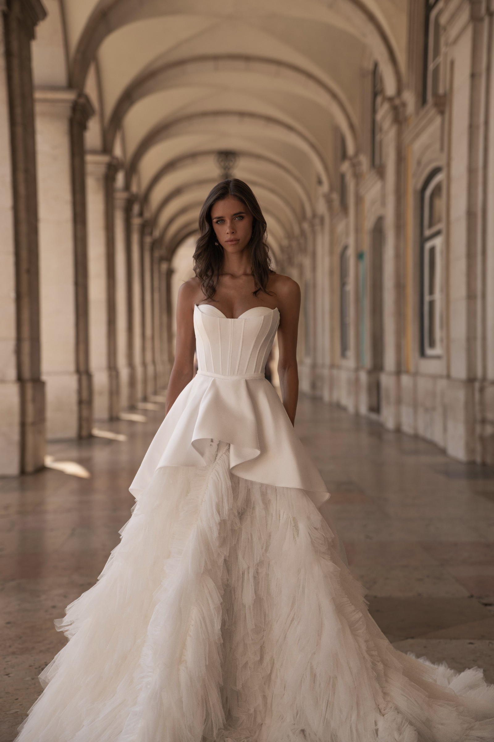 A princess-style wedding dress made of smooth milky satin and soft nylon that gently shimmers in the light. The bodice features a graceful corset with a deep curve along the neckline. Sculpted seams are highlighted with decorative stitching. The multi-layered voluminous skirt ends in a long flowing train. The top layer, a peplum, has varying lengths: short in front and gradually lengthening toward the center back, with the waistline softened by gentle pleats. The look radiates tender luxury and elegance in every movement.