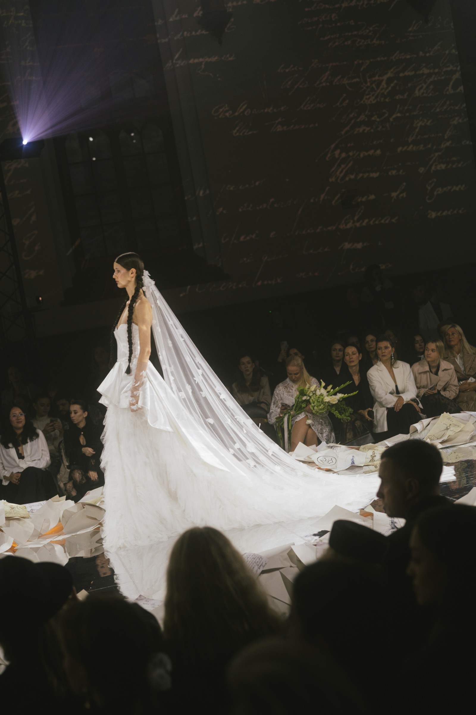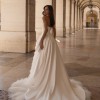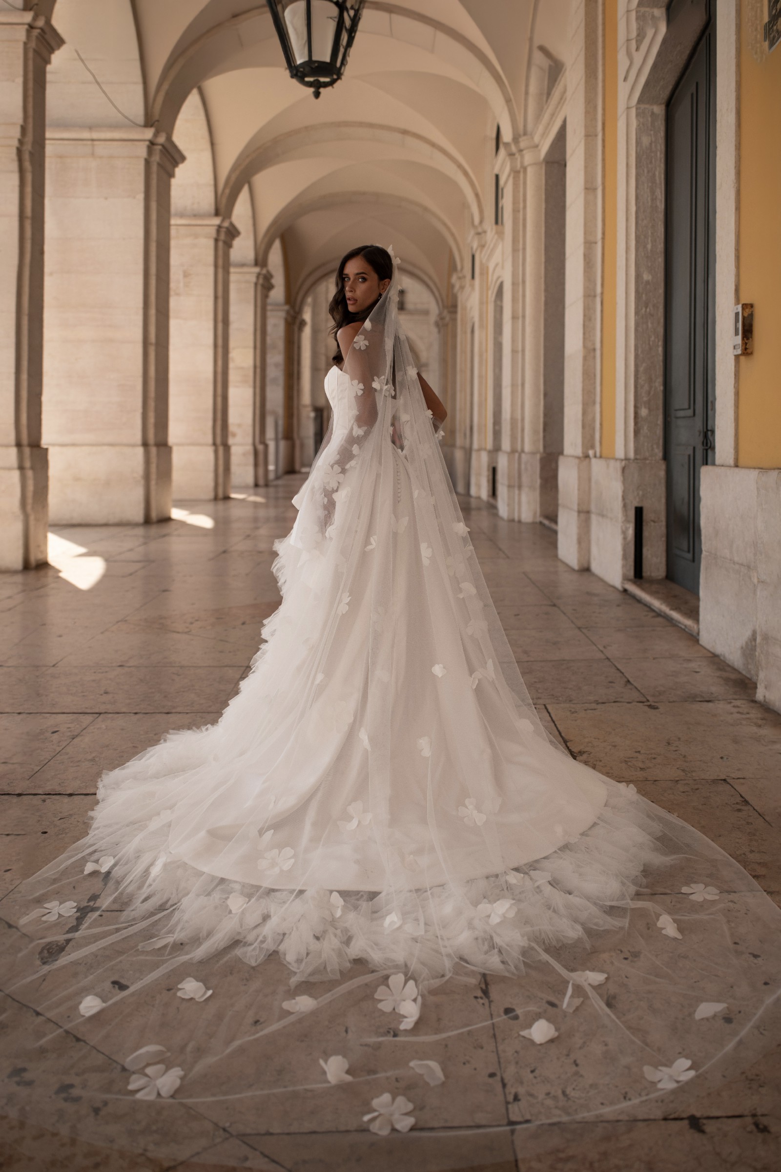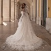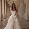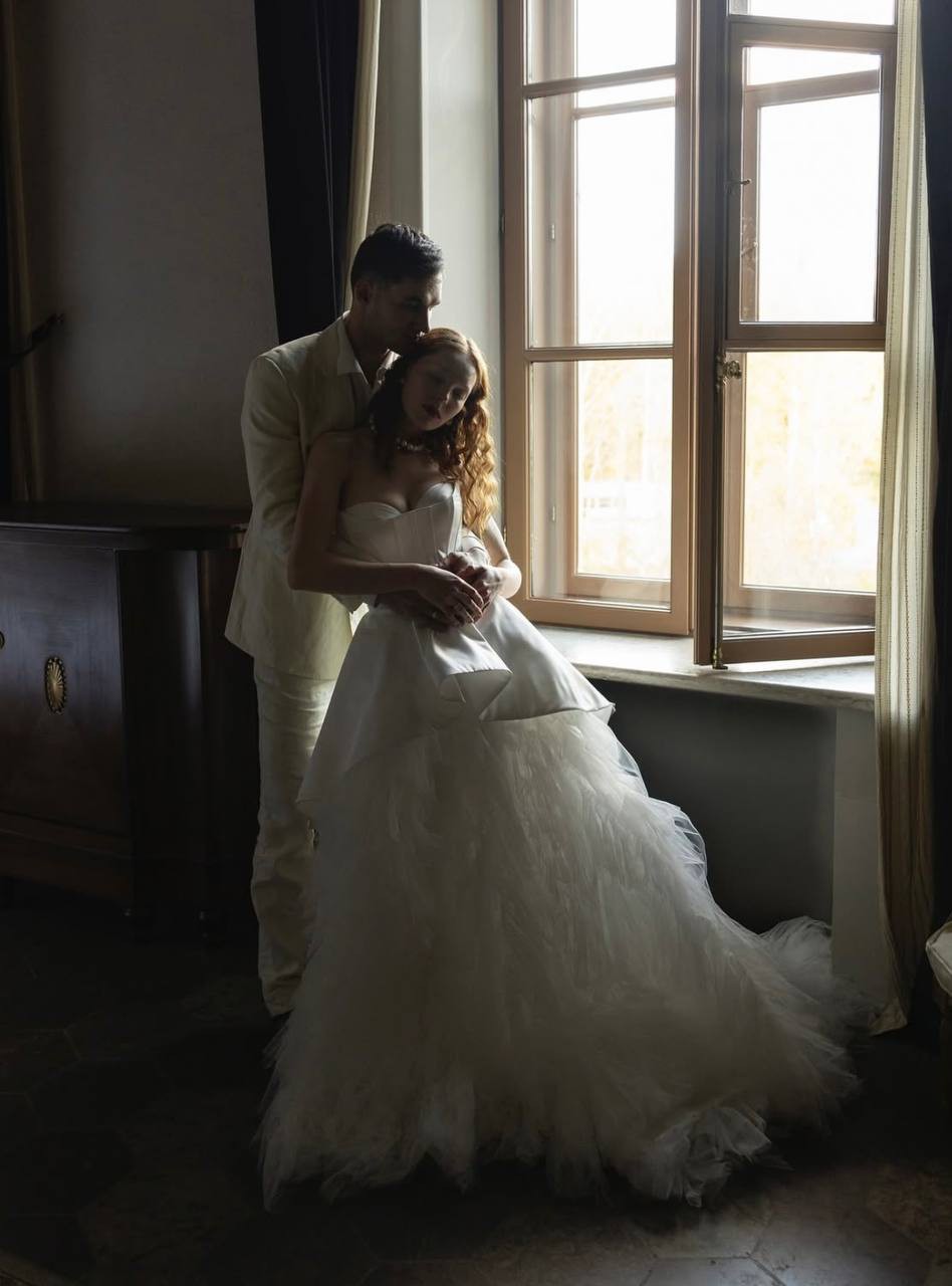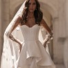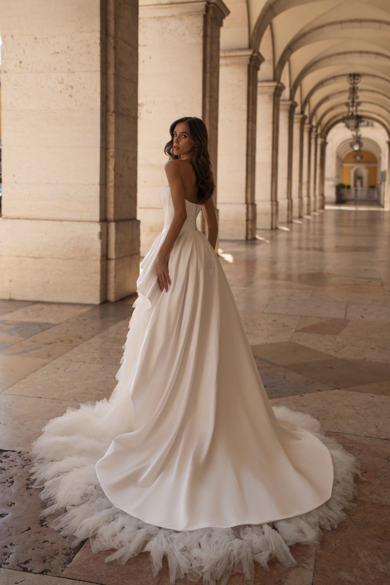 A princess-style wedding dress made of smooth milky satin and soft nylon that gently shimmers in the light. The bodice features a graceful corset with a deep curve along the neckline. Sculpted seams are highlighted with decorative stitching. The multi-layered voluminous skirt ends in a long flowing train. The top layer, a peplum, has varying lengths: short in front and gradually lengthening toward the center back, with the waistline softened by gentle pleats. The look radiates tender luxury and elegance in every movement.