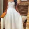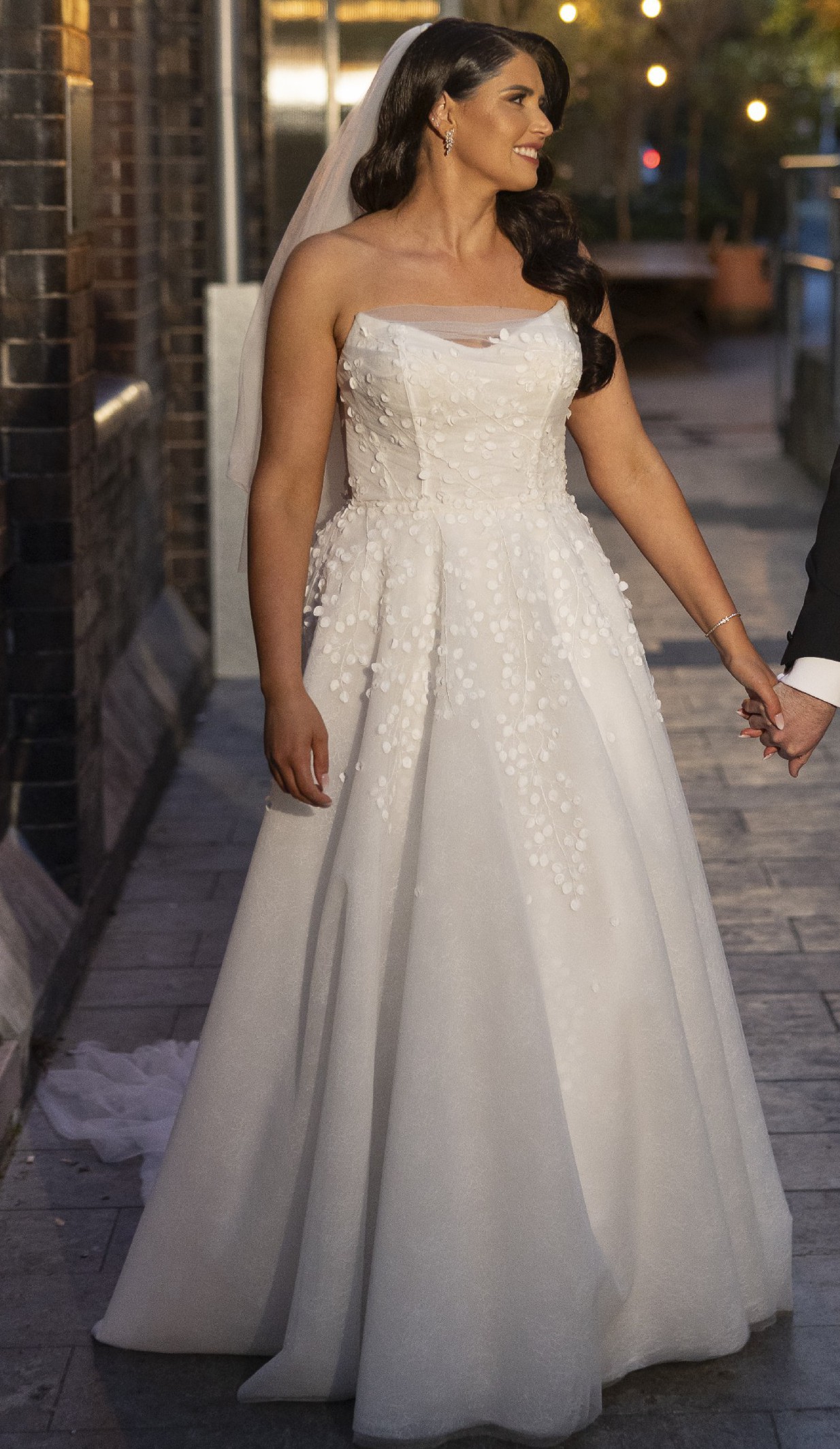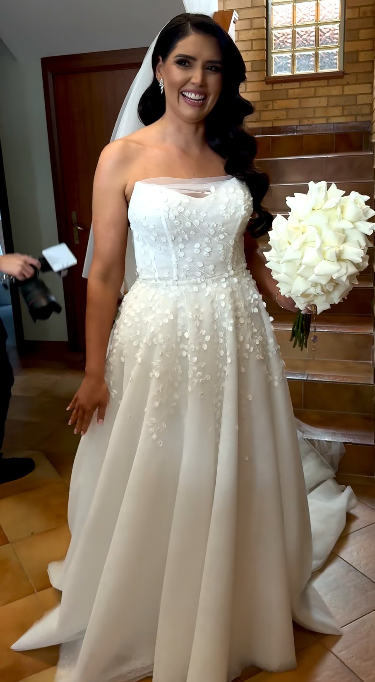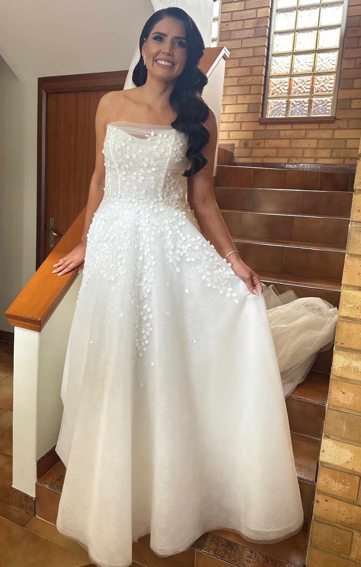 Crafted from exquisite ivory lace, the gown is beautifully detailed with hand-placed 3D floral appliques and intricate embroidery, creating depth and texture that catches the light from every angle. Up close, the craftsmanship is stunning and in photos, it looks effortlessly elegant. The curve neckline frames the decolletage softly, while the sheer mid-back adds a subtle sense of allure without feeling too revealing.