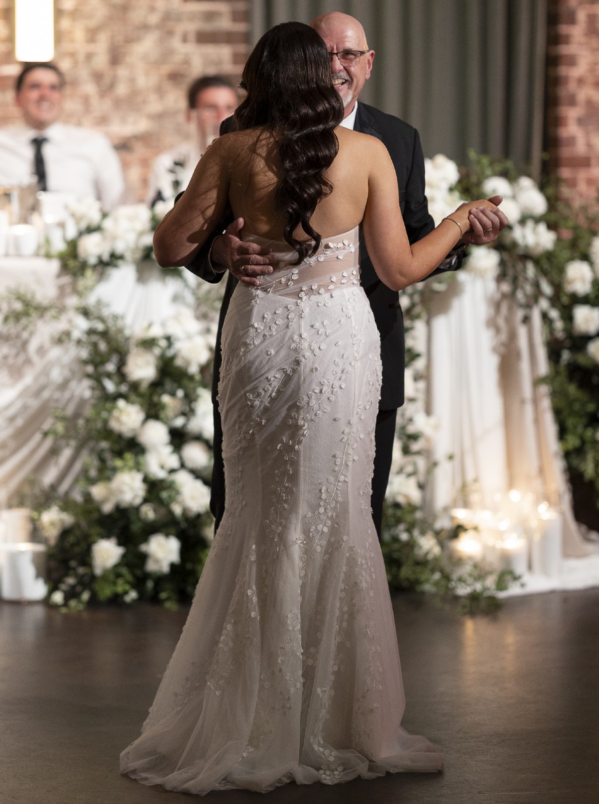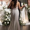 The silhouette is a flattering mermaid style, designed to hug the body in all the right places before flowing into a graceful train. One of the most unique features of this gown is the detachable overskirt, which allows the dress to transform from a sleek mermaid silhouette into a romantic A-line for the ceremony. It was perfect for creating a dramatic entrance and then removing later for a more relaxed, comfortable feel at the reception, truly two looks in one!