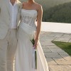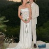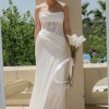 Description: Hammered satin gown with vine lace and exposed corset bodice, pleated waist, and asymmetrical skirt.
