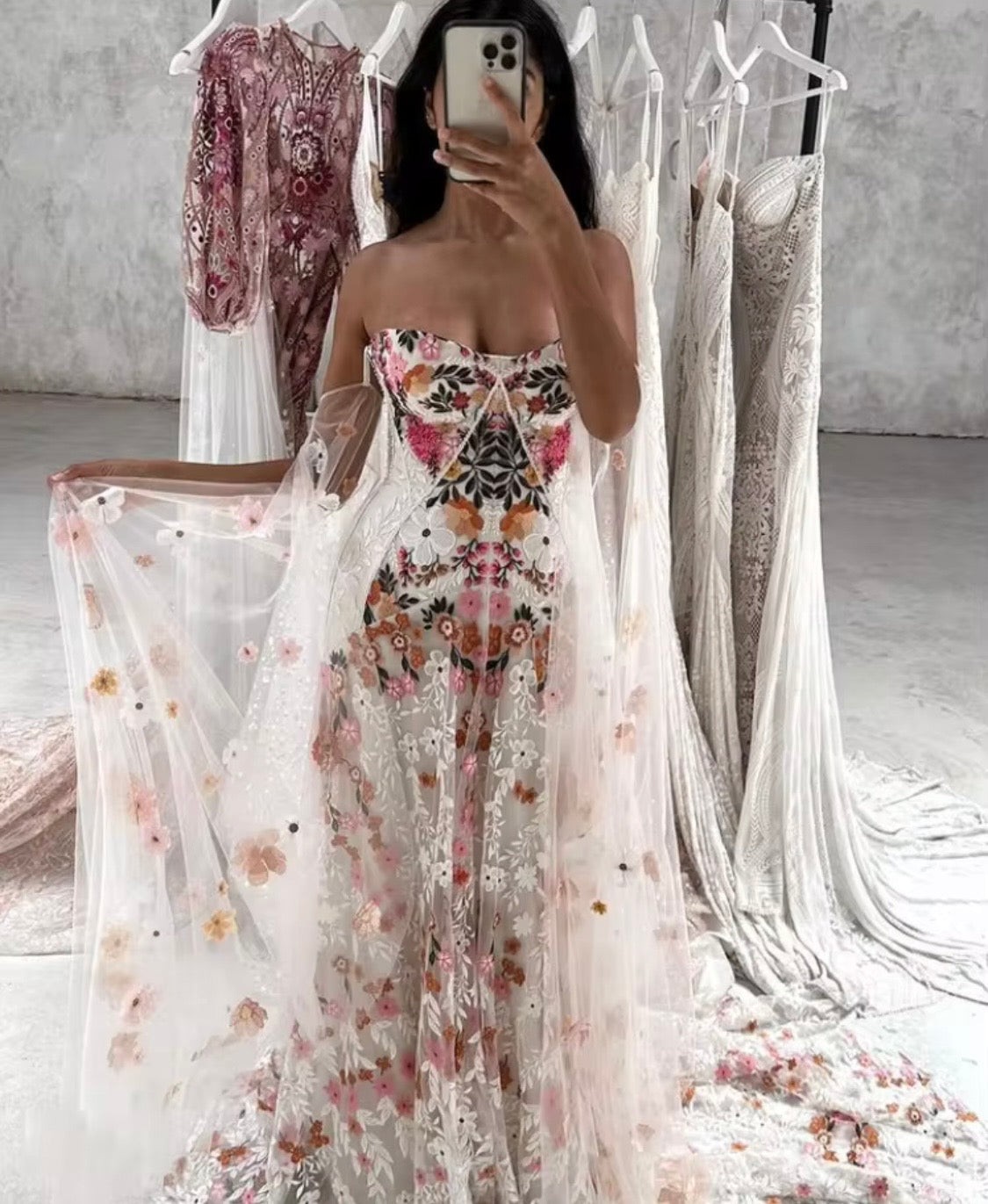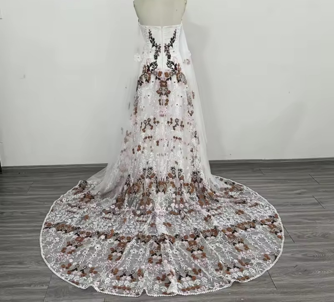 This wedding dress is the Inspired by Rue de Seine Cora style by Other from the 2023 collection. I bought this dress in 2025, it has not been professionally cleaned and is unaltered. I would describe it as a Beach, Boho, Country wedding dress featuring Detachable sleeves, a Fit-And-Flare silhouette, and a Sweetheart neckline.