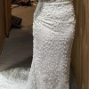 Made With Love Louie V2 is a dazzling lace fit and flare wedding dress! The dimensional leafy lace highlights the deep V neckline + fitted skirt. Made With Love Louie V2 is Ivory in color and a size 14.