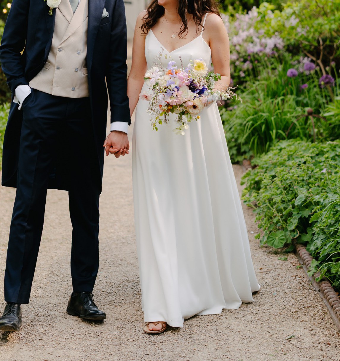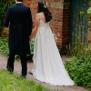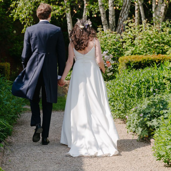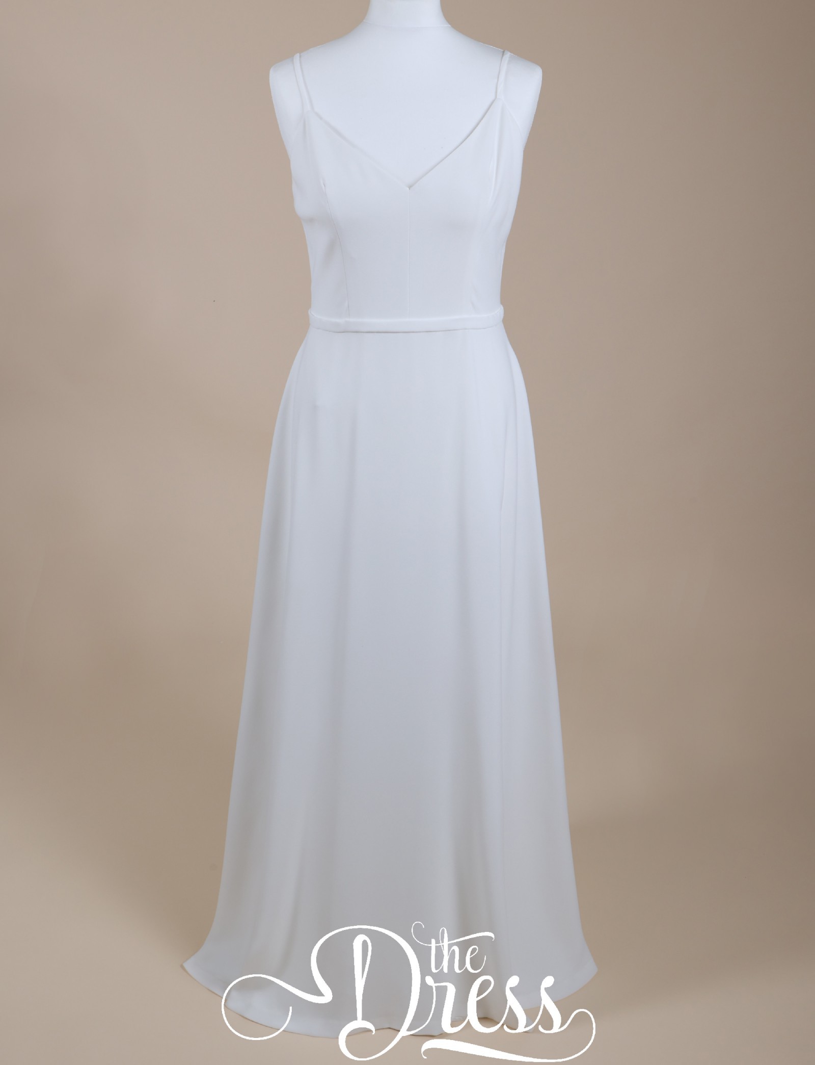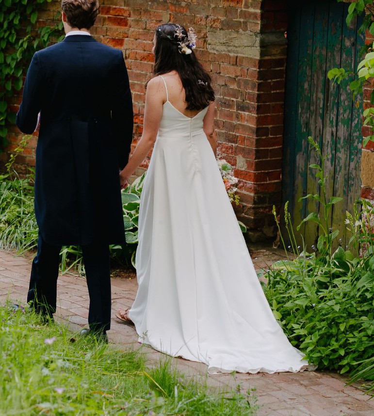 A beautiful minimalist A-line dress with spaghetti straps, low back and train. Fitted with a traditional (over) bustle to shorten the train if desired, creating a beautiful cascading effect, and allowing easy movement and dancing through the night.