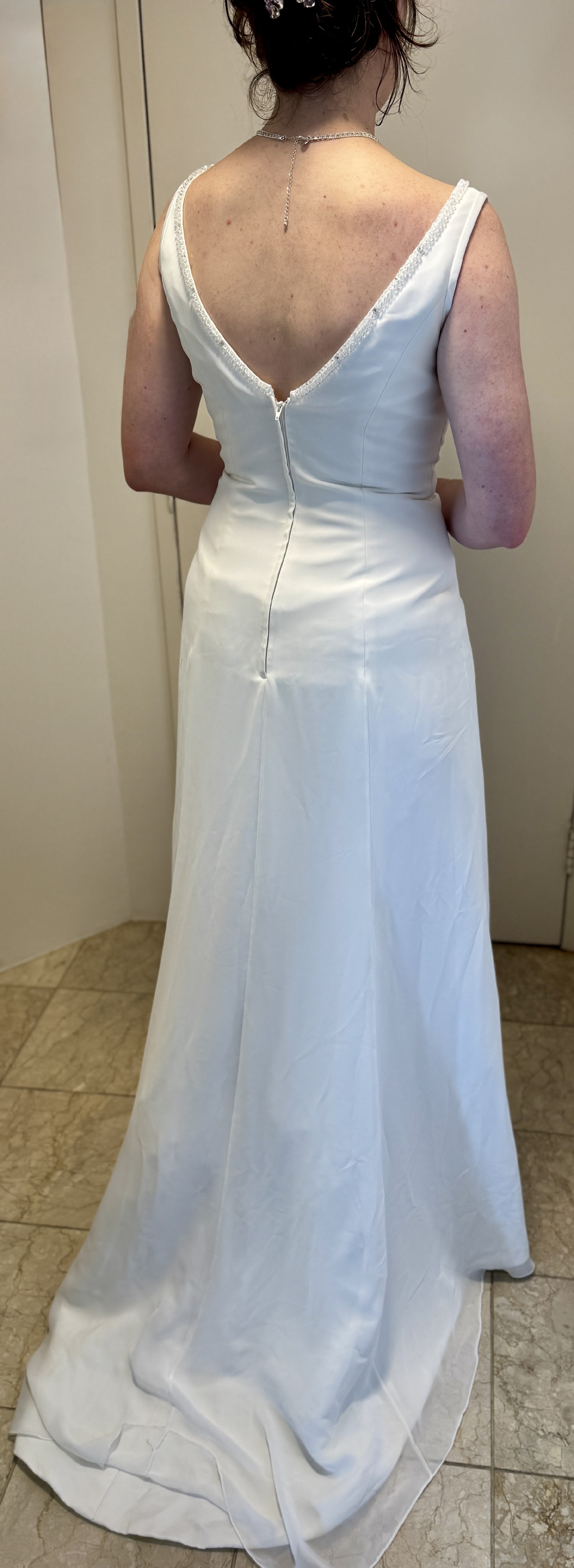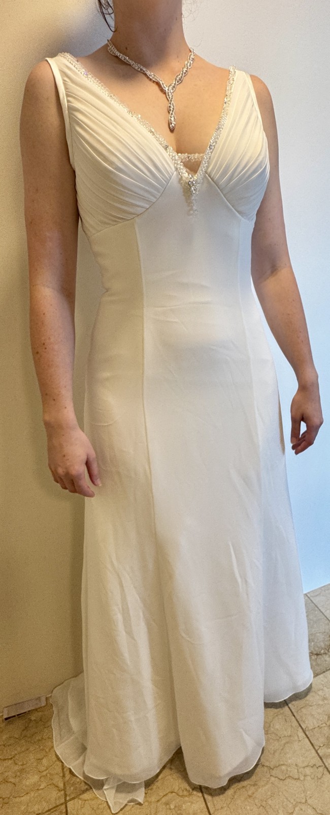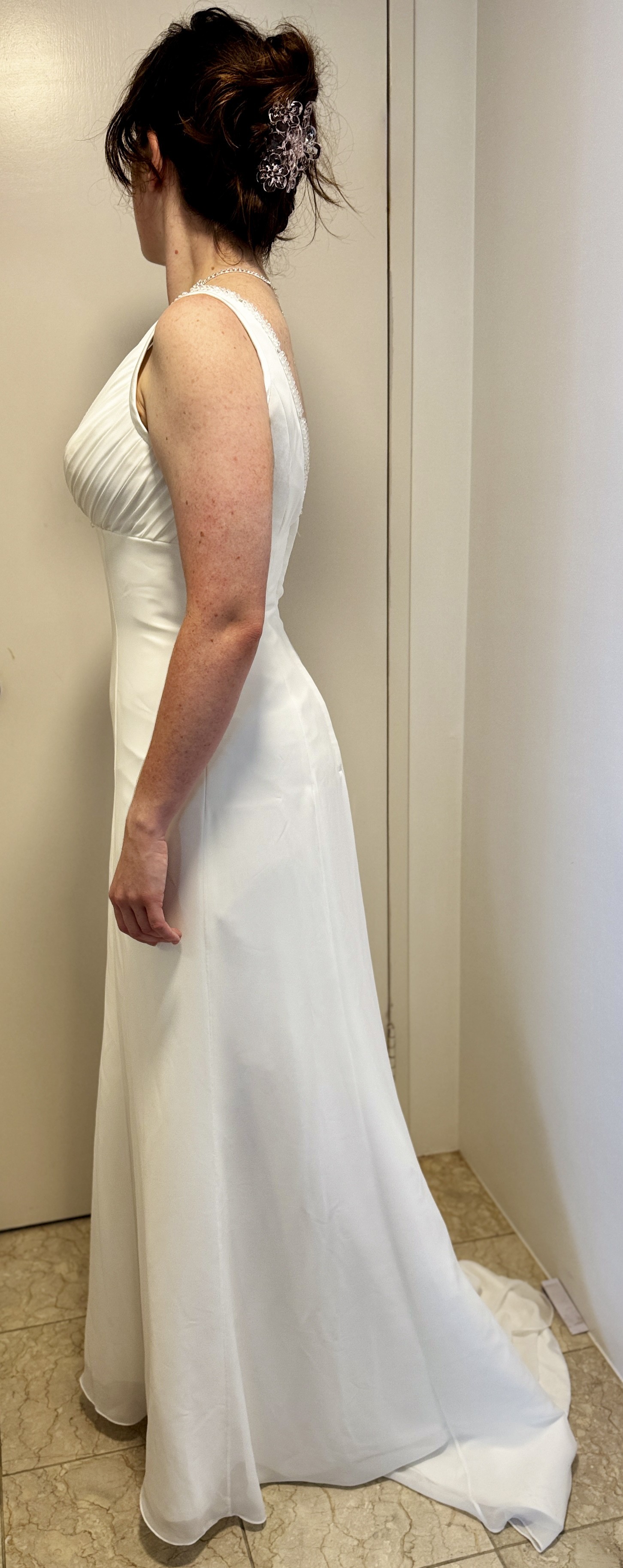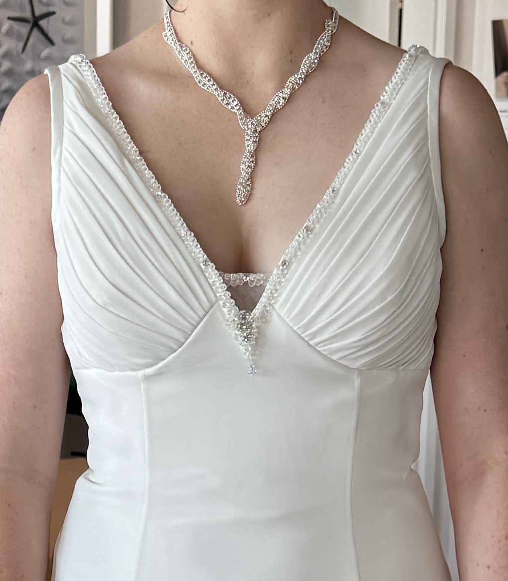 This simple, elegant gown is so comfortable to wear, and falls softly to the floor. It makes you feel very beautiful and very special.