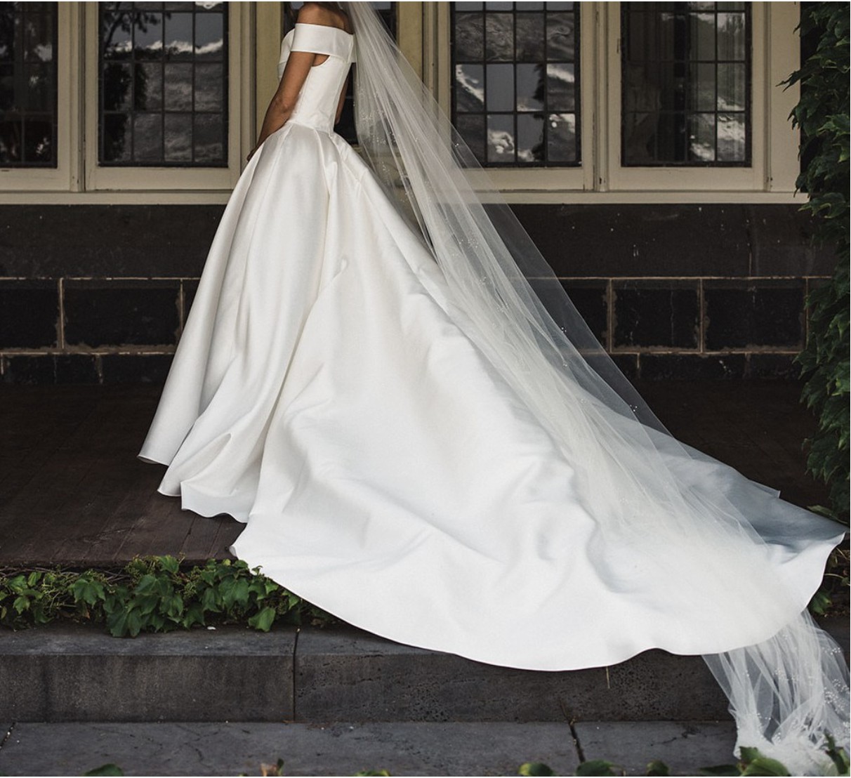 Timeless Elie Saab dress in perfect condition! The dress was worn for the ceremony only, and is cleaned and ready to give someone else their perfect day. A classic silhouette and stunning train make this dress truely beautiful in person and in photos.