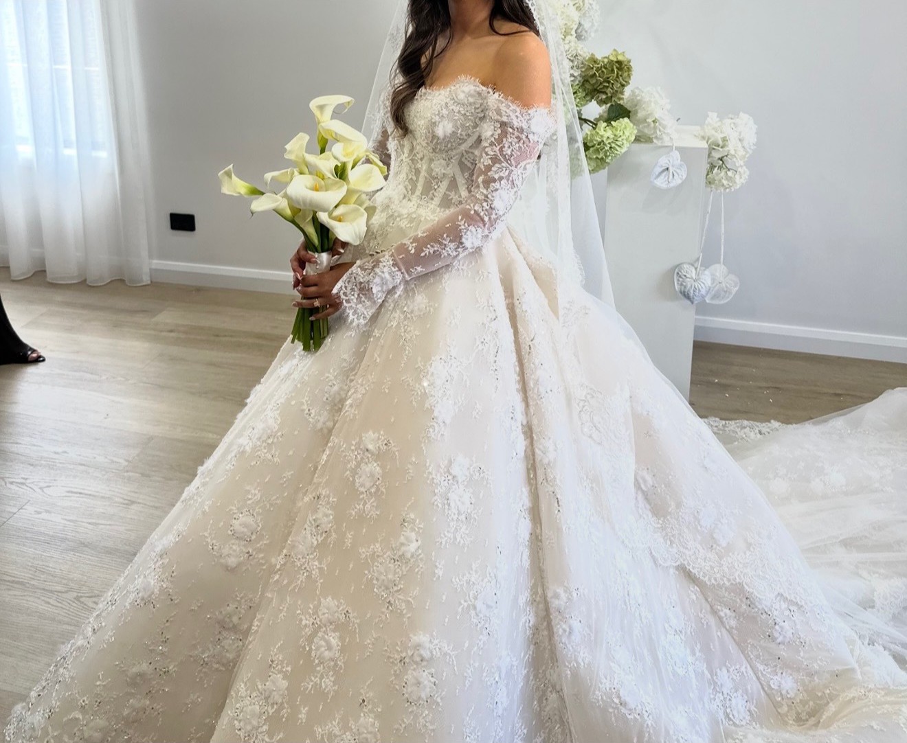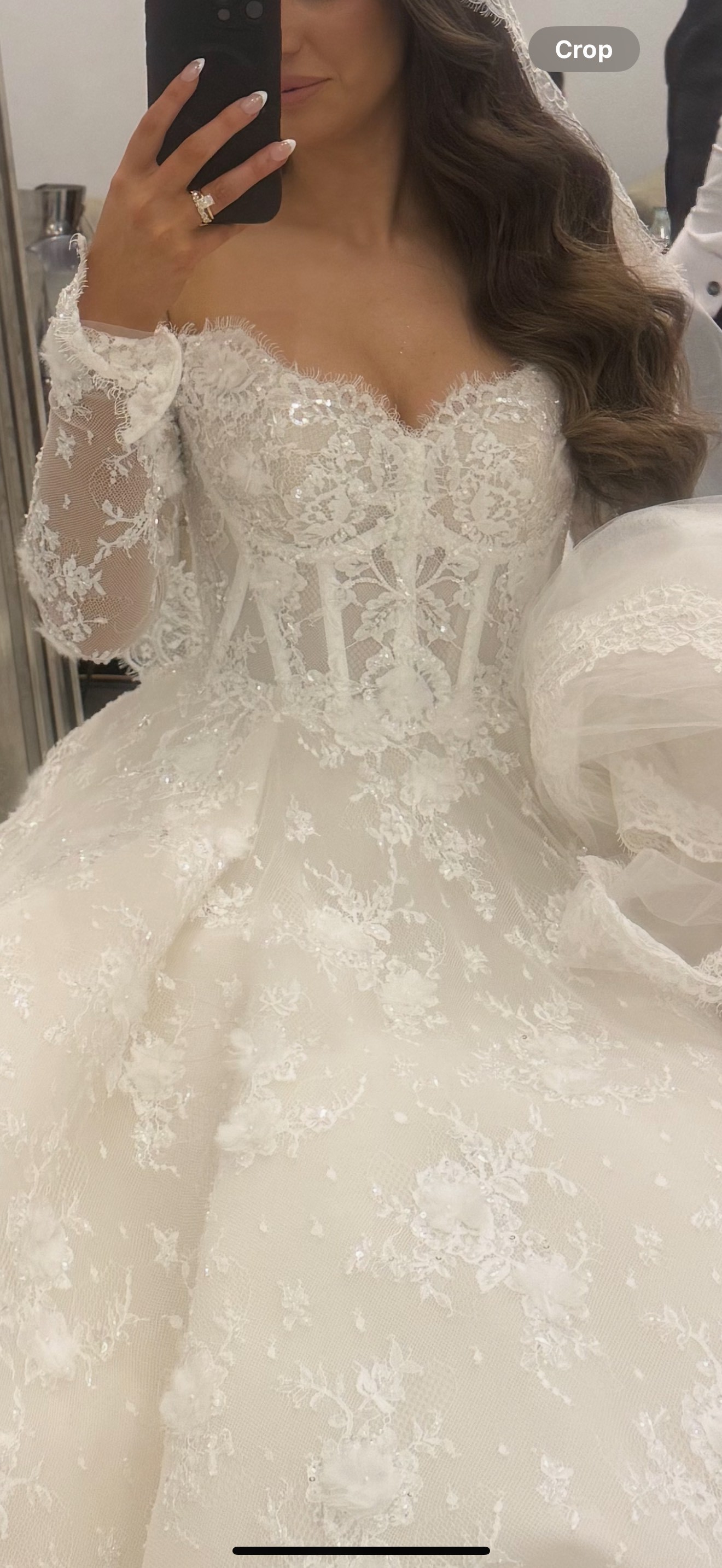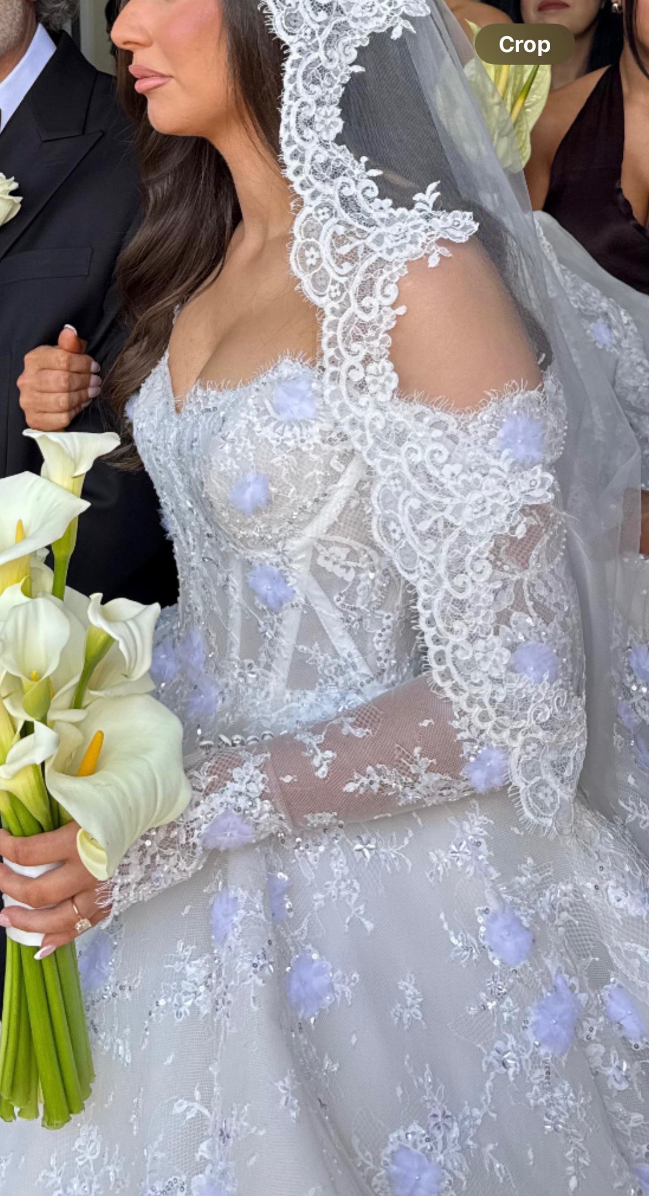 I loved every moment of wearing this dress on my wedding day. This custom Steven Khalil wedding gown was exquisitely crafted from layers of soft tulle and sheer illusion mesh, adorned with intricate hand-embroidered lace and delicate floral appliqués throughout. The structured corseted bodice features fine boning for shape and support, finished with a romantic sweetheart neckline softened by illusion lace sleeves that extend gracefully over the arms. Subtle three-dimensional floral detailing and beadwork add depth and texture, catching the light beautifully while maintaining an ethereal softness. Every element of the gown reflects exceptional couture craftsmanship, creating a timeless, romantic silhouette that felt truly special on my wedding day.