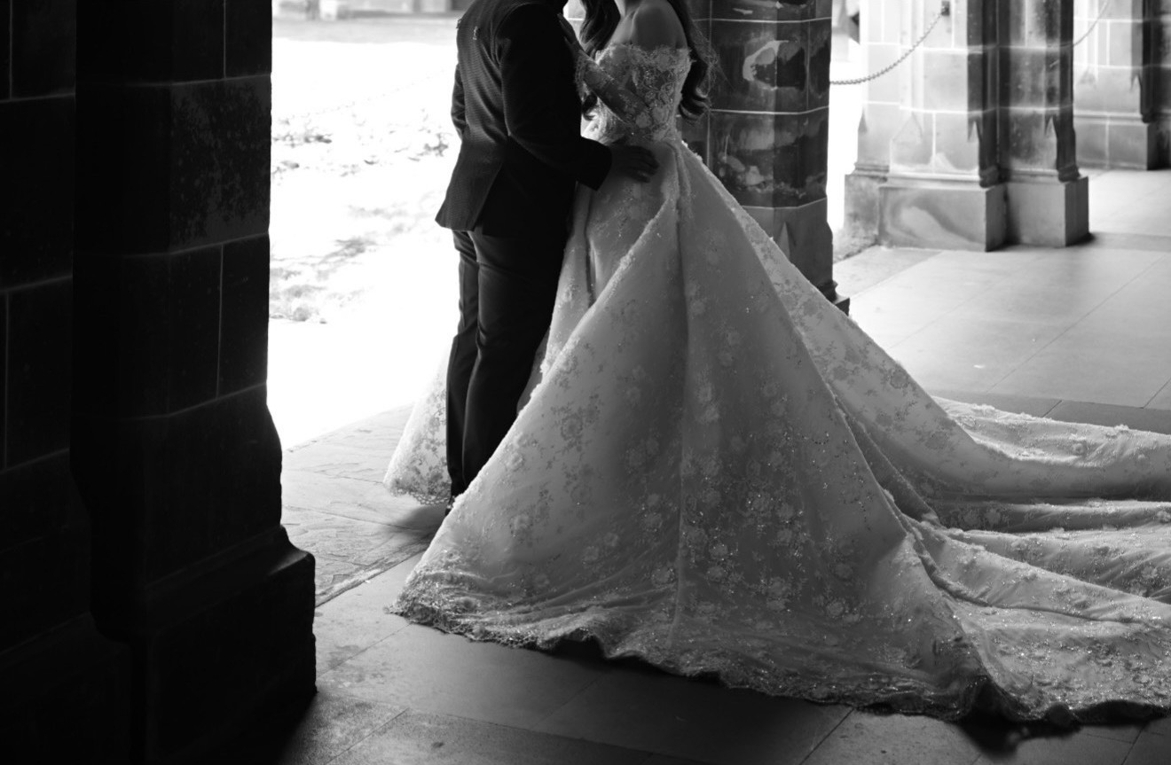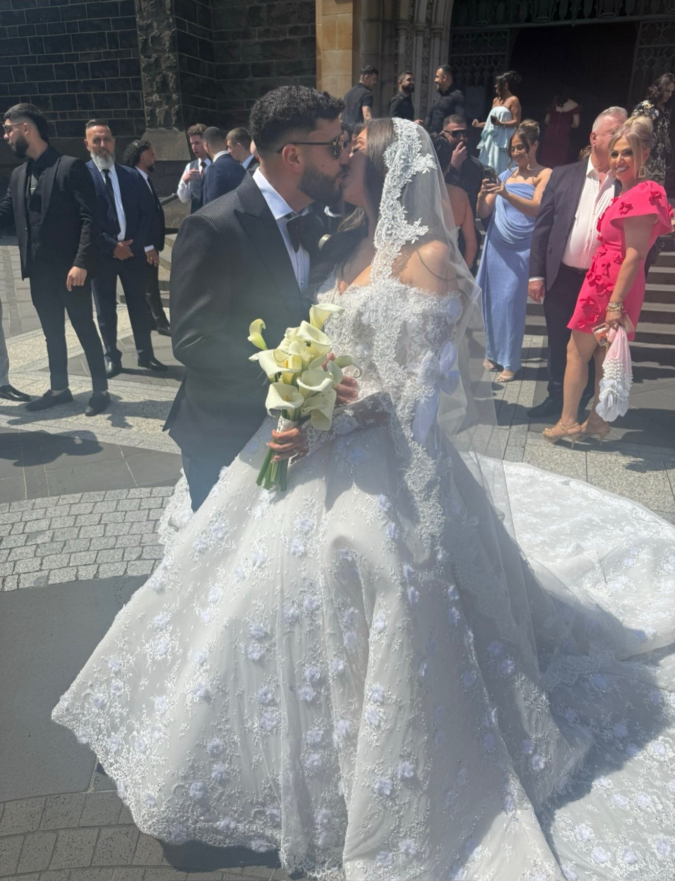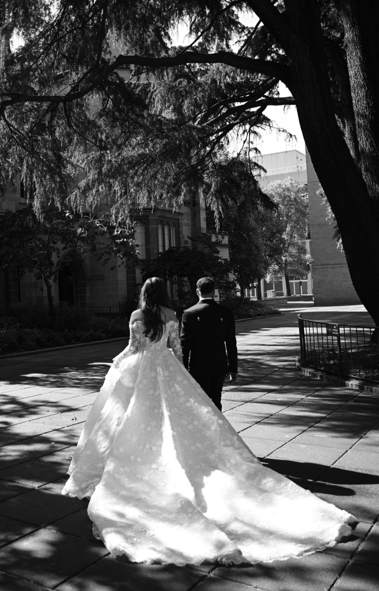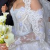 I loved every moment of wearing this dress on my wedding day. This custom Steven Khalil wedding gown was exquisitely crafted from layers of soft tulle and sheer illusion mesh, adorned with intricate hand-embroidered lace and delicate floral appliqués throughout. The structured corseted bodice features fine boning for shape and support, finished with a romantic sweetheart neckline softened by illusion lace sleeves that extend gracefully over the arms. Subtle three-dimensional floral detailing and beadwork add depth and texture, catching the light beautifully while maintaining an ethereal softness. Every element of the gown reflects exceptional couture craftsmanship, creating a timeless, romantic silhouette that felt truly special on my wedding day.