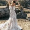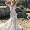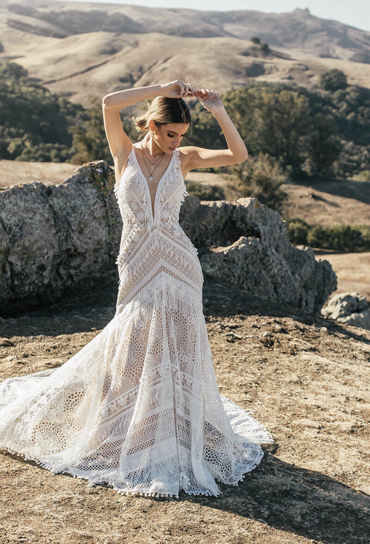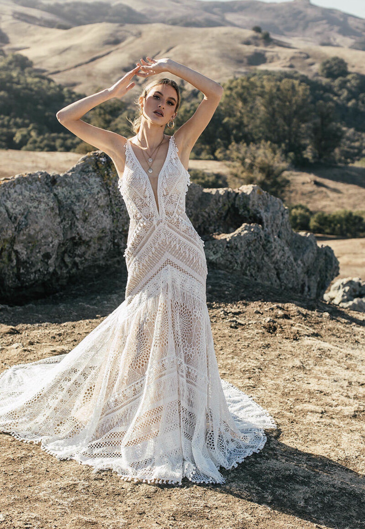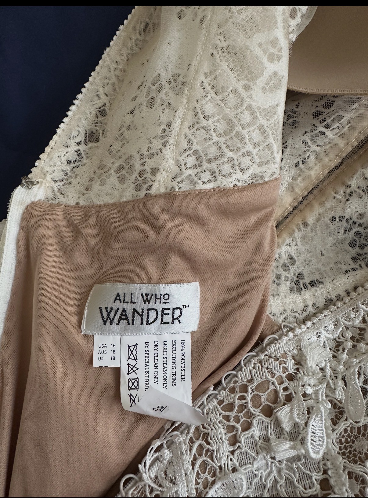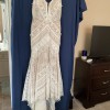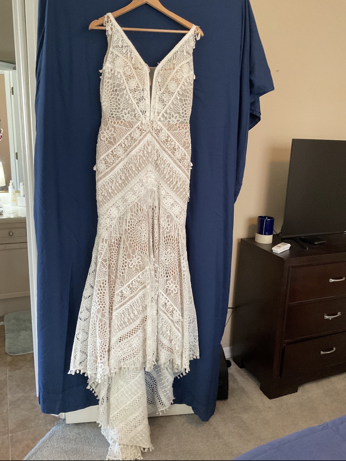 Micah is made for the boho spirit with a vintage flair. Head-to-toe lace details give this wedding dress an unforgettable vintage feel, with geometric, linear and floral patterns combining for a striking effect. Tassels and fringe details give 3D decoration to the gown, adding natural dimension and texture. The nude lining shows off the ornate intricacies in the lace patterns and makes the tassels really pop. The fit-and-flare silhouette easily hugs the bodys natural curves, with the skirt effortlessly flowing into a lovely train. Ideal for an outdoor celebration of love, Micah will easily flow with the breeze on your walk down the aisle. This dress was altered down to a size 8.