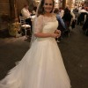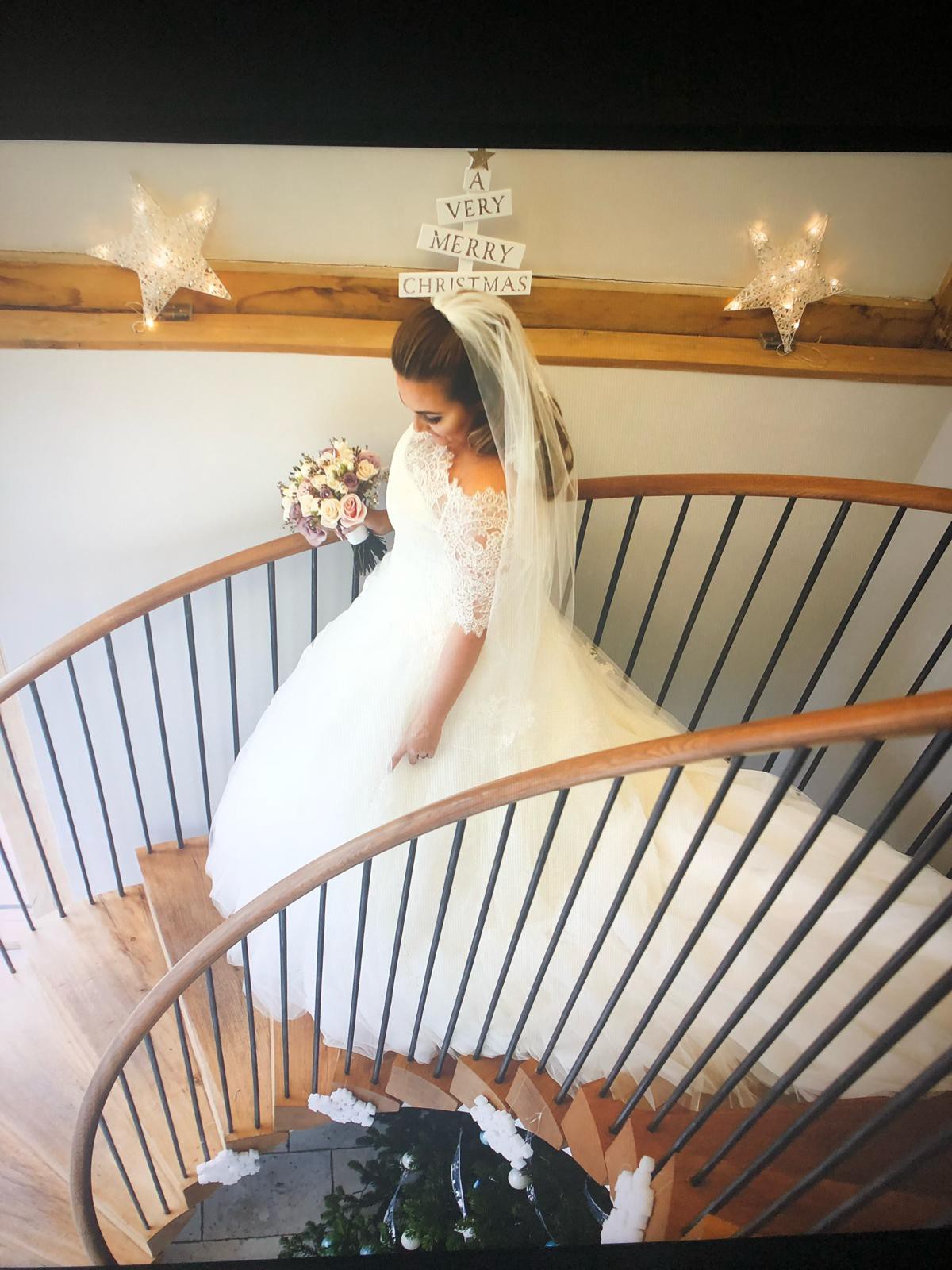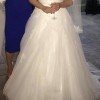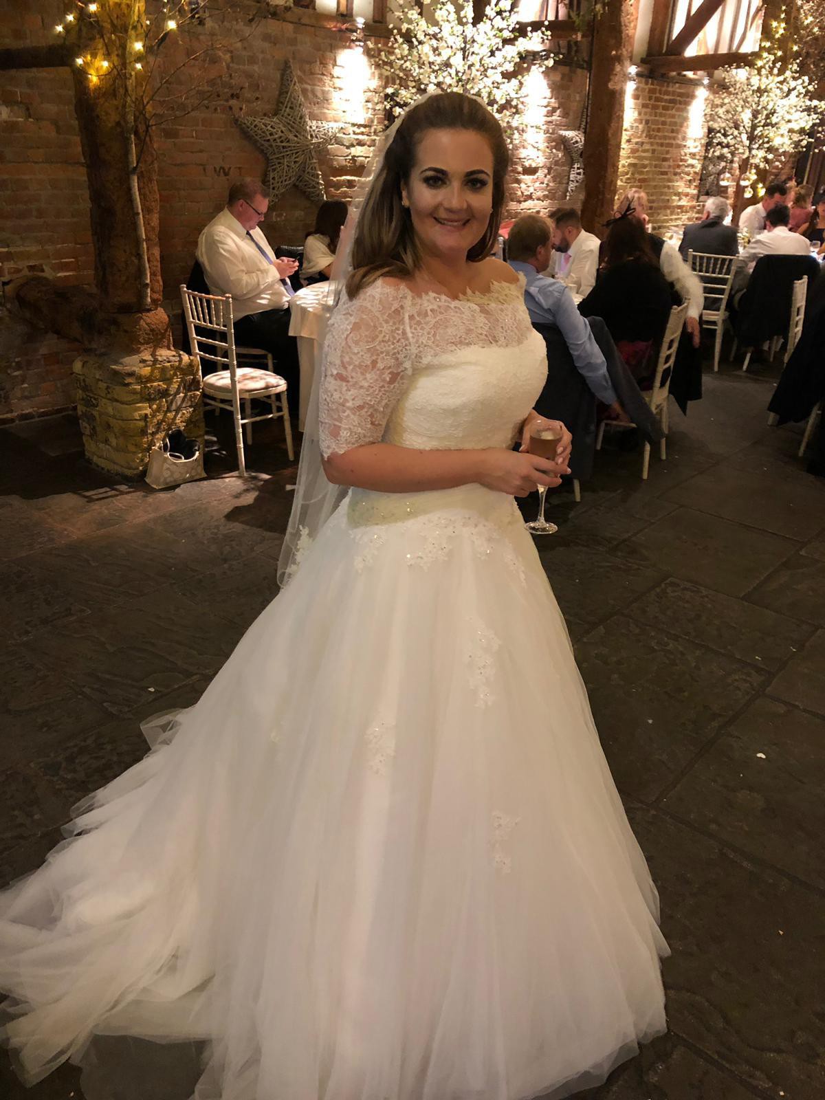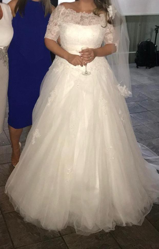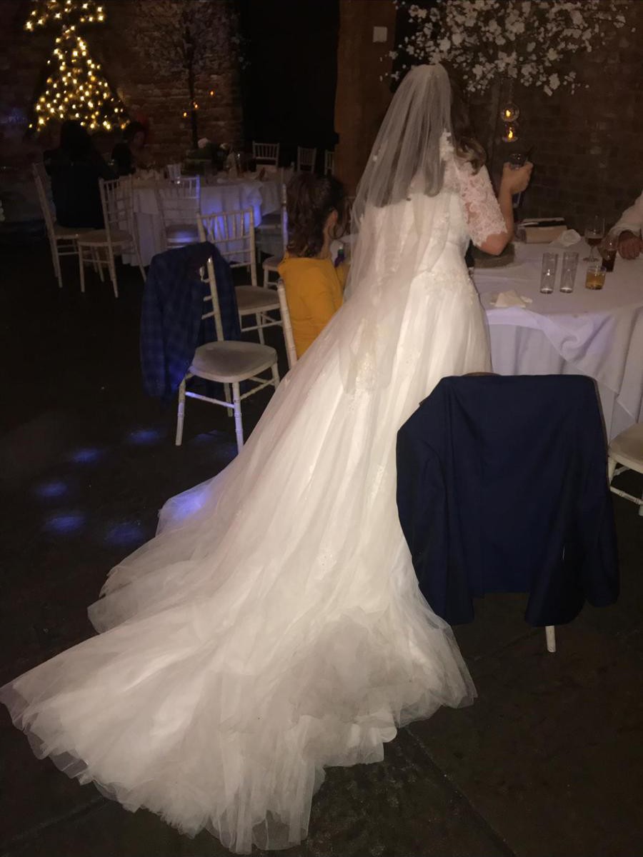 Beautiful Gown Worn in 2019 I have more close up pictures There is slight damage to the bottom of netting at back but can be repaired. Also because of the train the underside of train that drags on the floor is stained. This dress has been professionally cleaned by the shop which we purchased it from,but if the dresss needs to be altered you may loose it. We paid for extra crystals on this dress and is beautiful when lights shine on it . It has lots of skirts very full also have the blue ribbon hoop to go with it. Have the veil