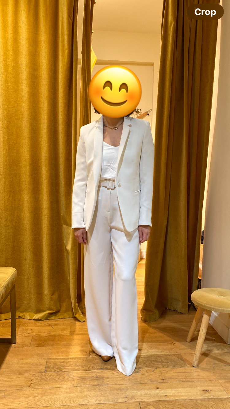 Ivory bridal suit from Parisian designer 17h10. Brand new, unworn, tags still attached. Fit blazer - 1 button - Two piped pockets - Two large inside pockets - Chest darts - Genuine buttoning at bottom of sleeve - Fully lined Palazzo pant - Wide leg - High waist - Double front darts - Two Italian pockets - Matching removable belt Never worn (just decided to go in a different direction for my wedding)