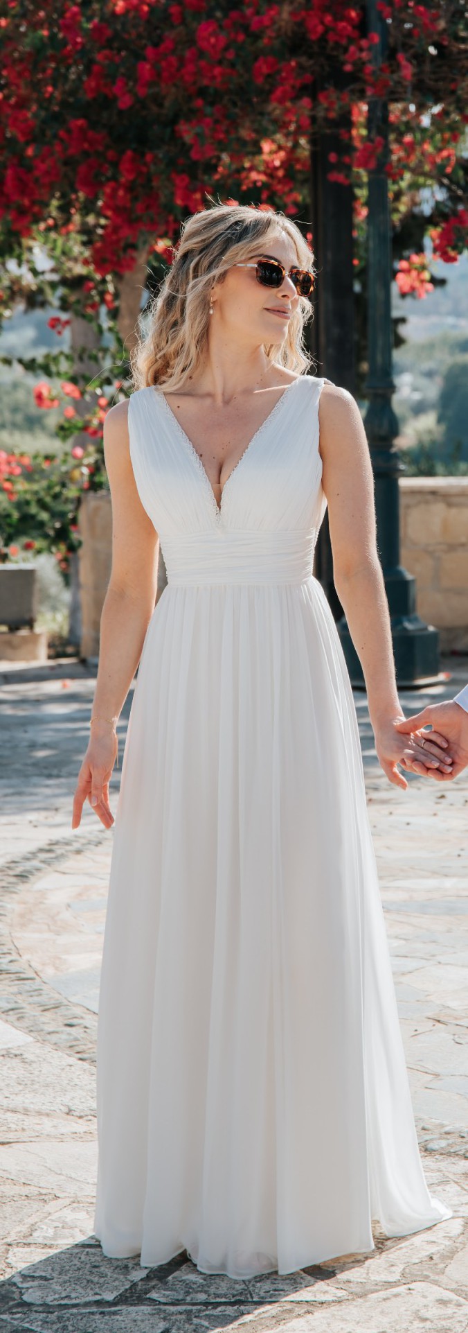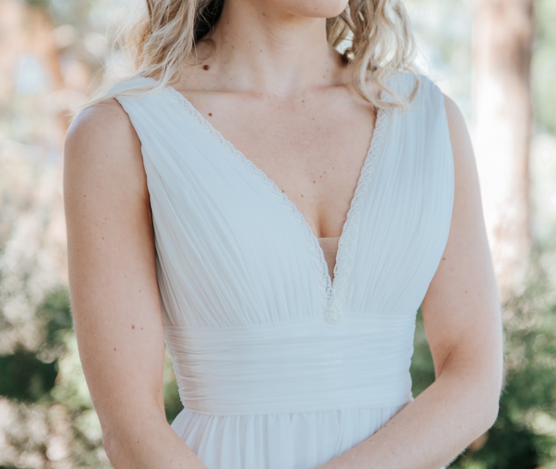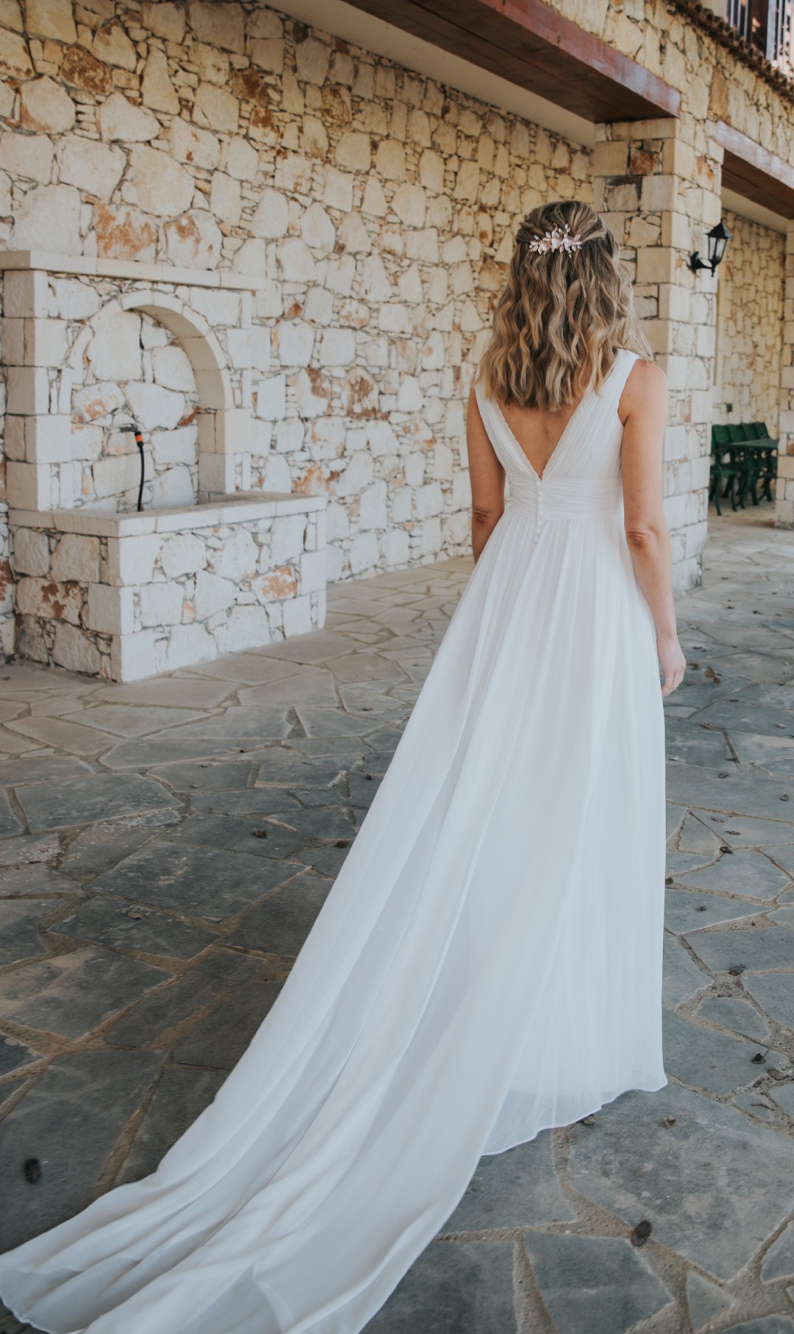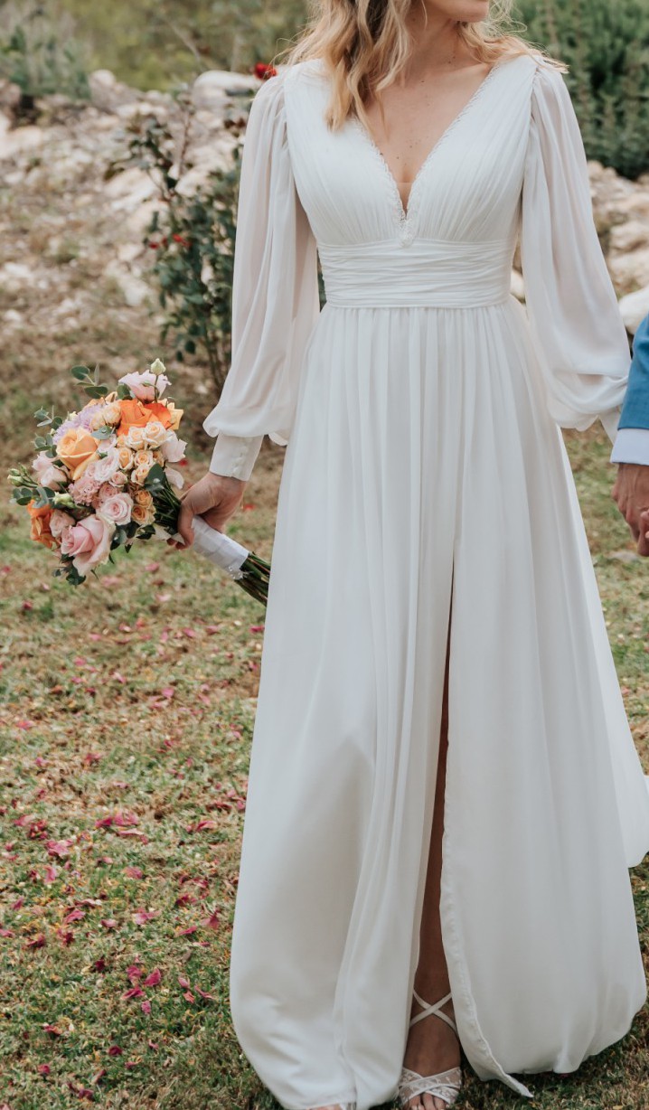 The dress features an elegant A-line silhouette, low back and flattering V-neckline. The ivory chiffon fabric drapes beautifully, creating a flowy, graceful 'greek goddess' look. It comes with detachable puff sleeves which add a boho vibe to the overall look. I wore them in the evening when it got a bit chilly!