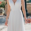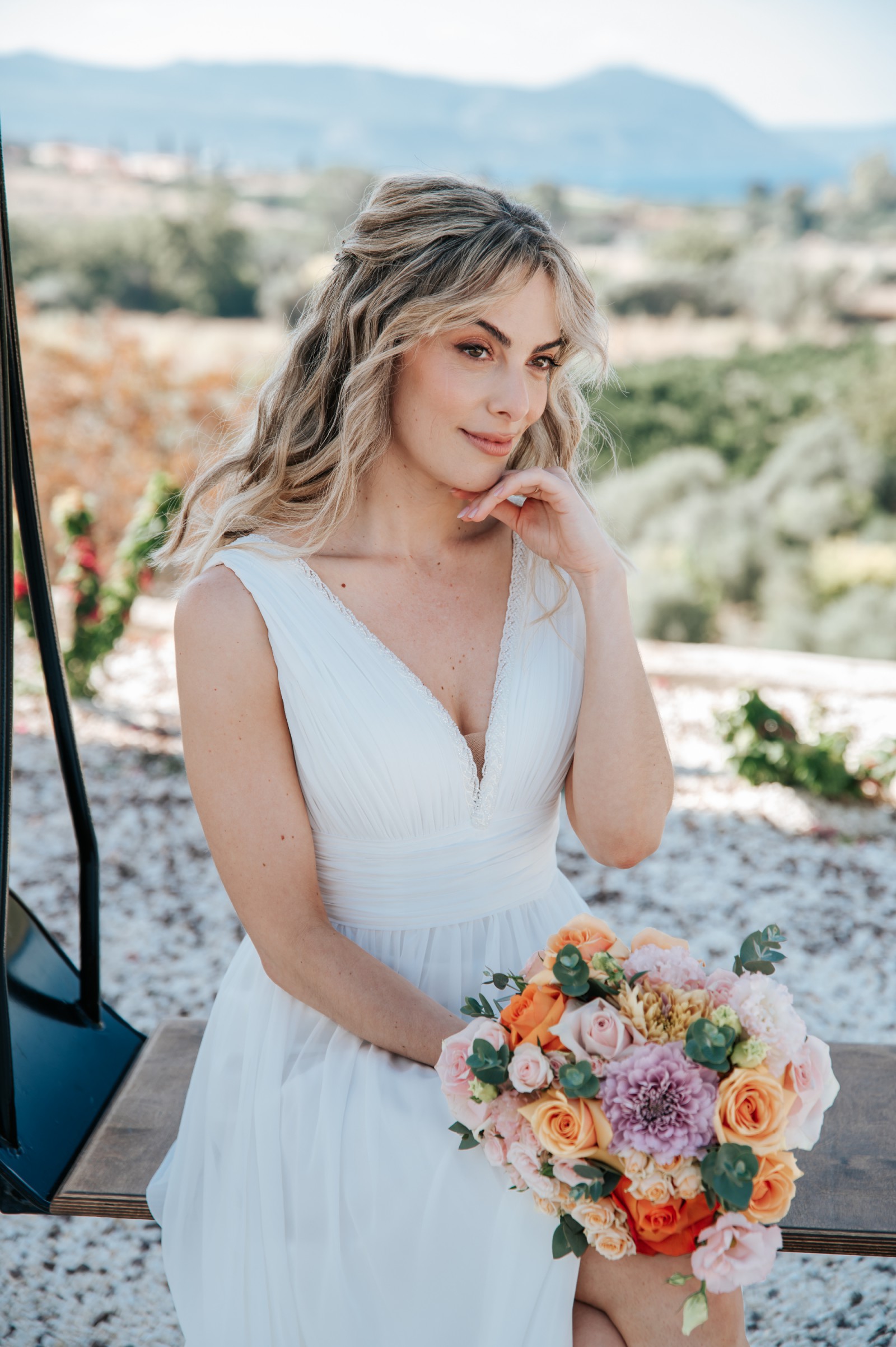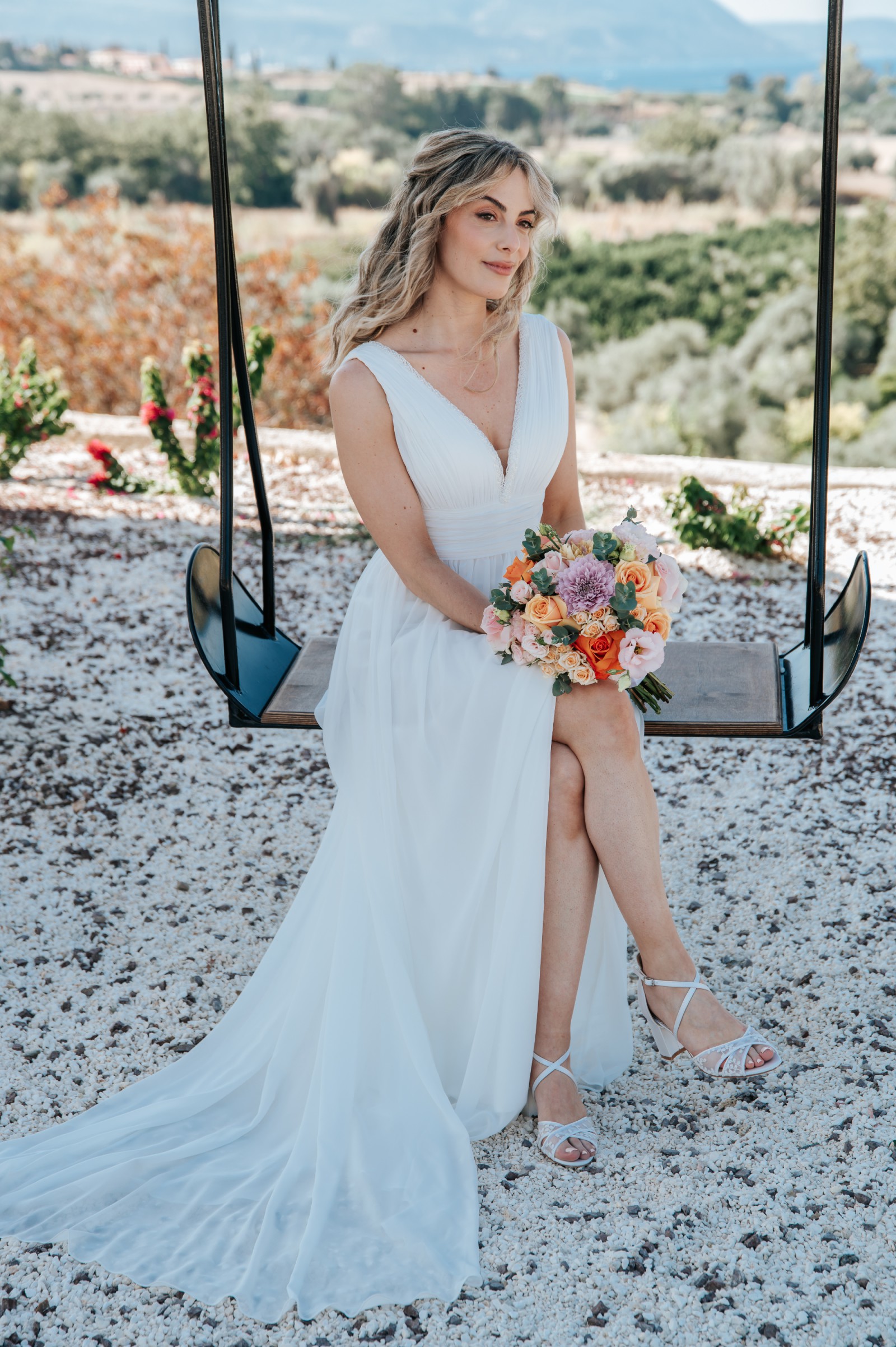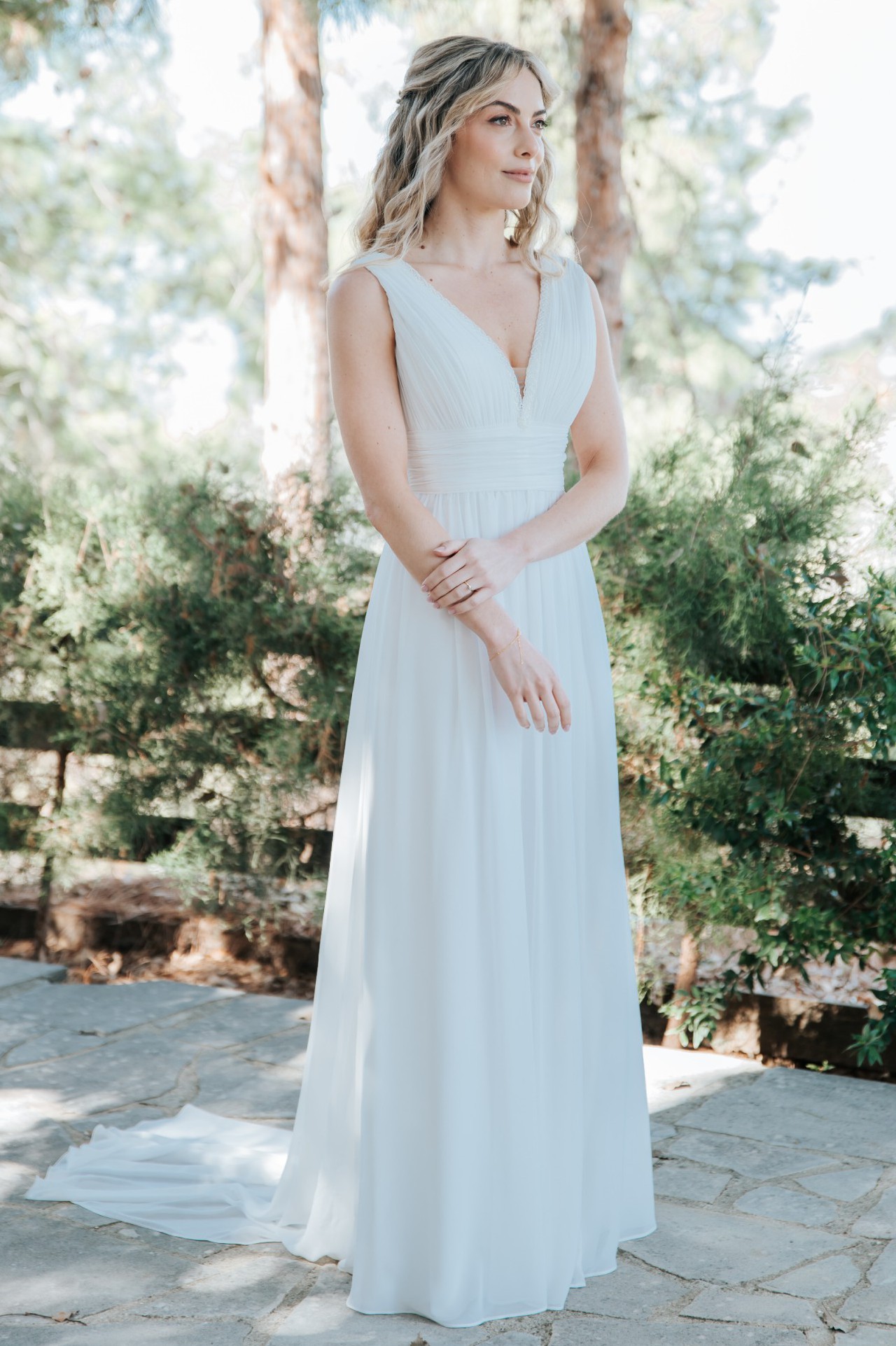 The dress features an elegant A-line silhouette, low back and flattering V-neckline. The ivory chiffon fabric drapes beautifully, creating a flowy, graceful 'greek goddess' look. It comes with detachable puff sleeves which add a boho vibe to the overall look. I wore them in the evening when it got a bit chilly!