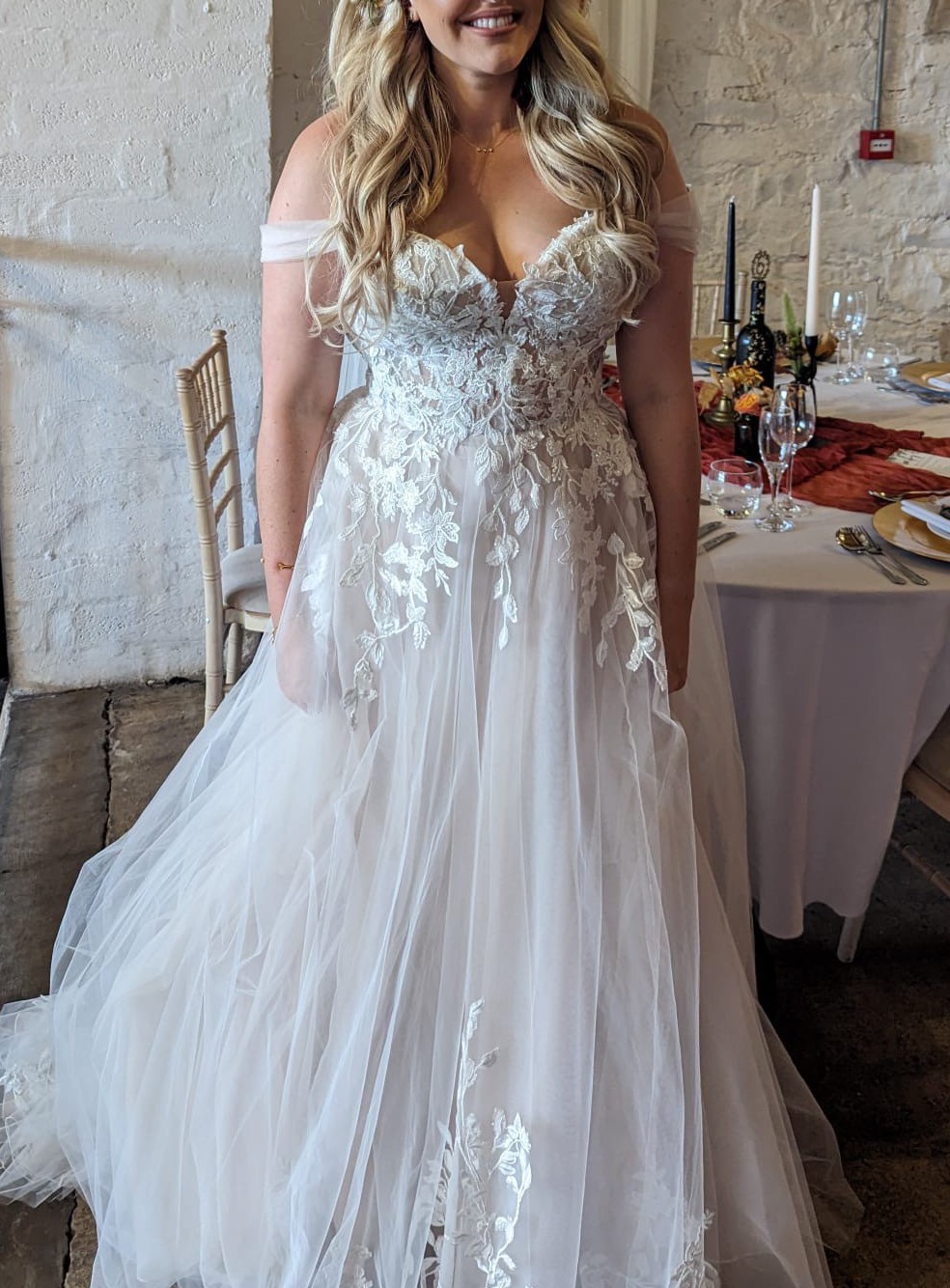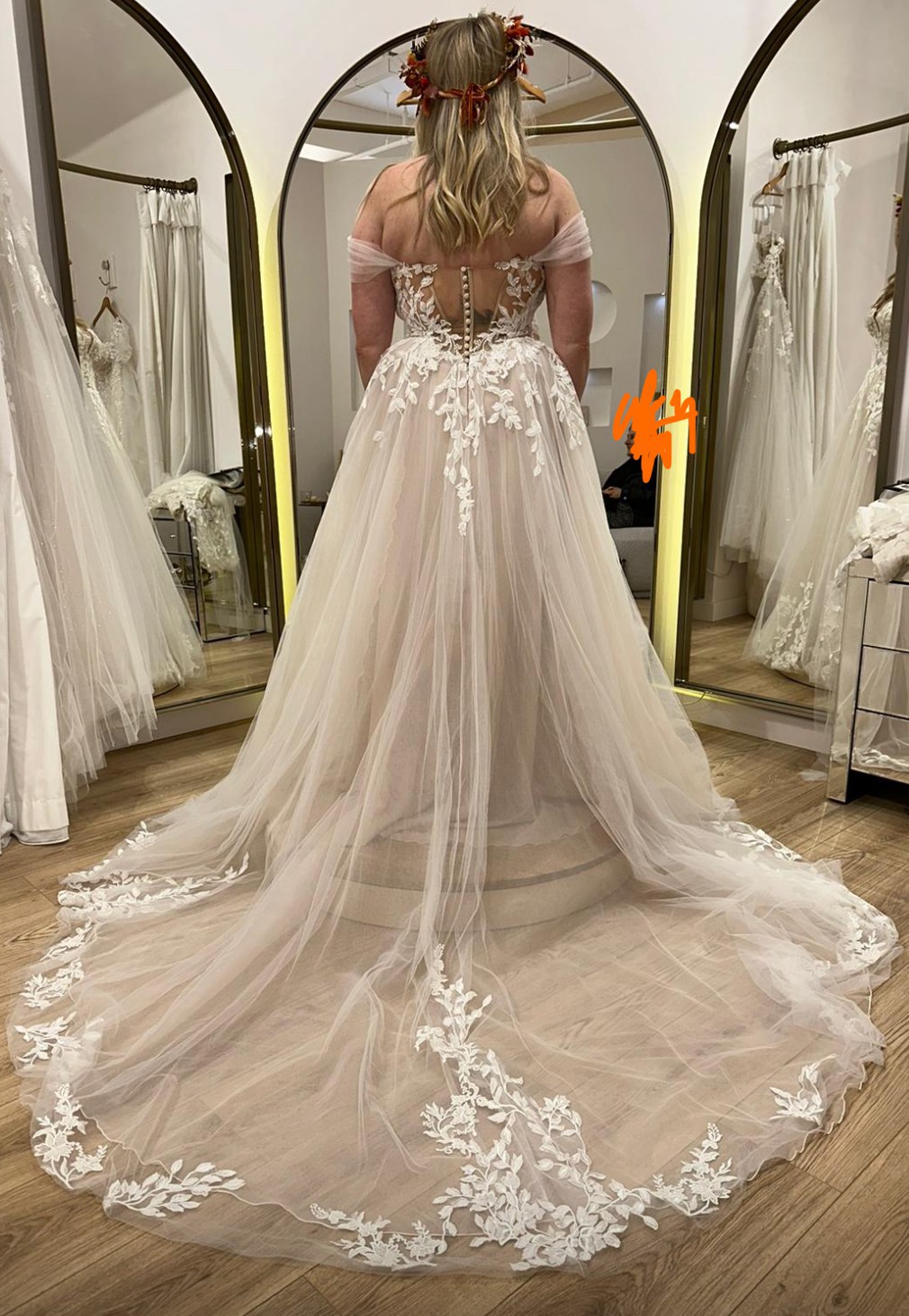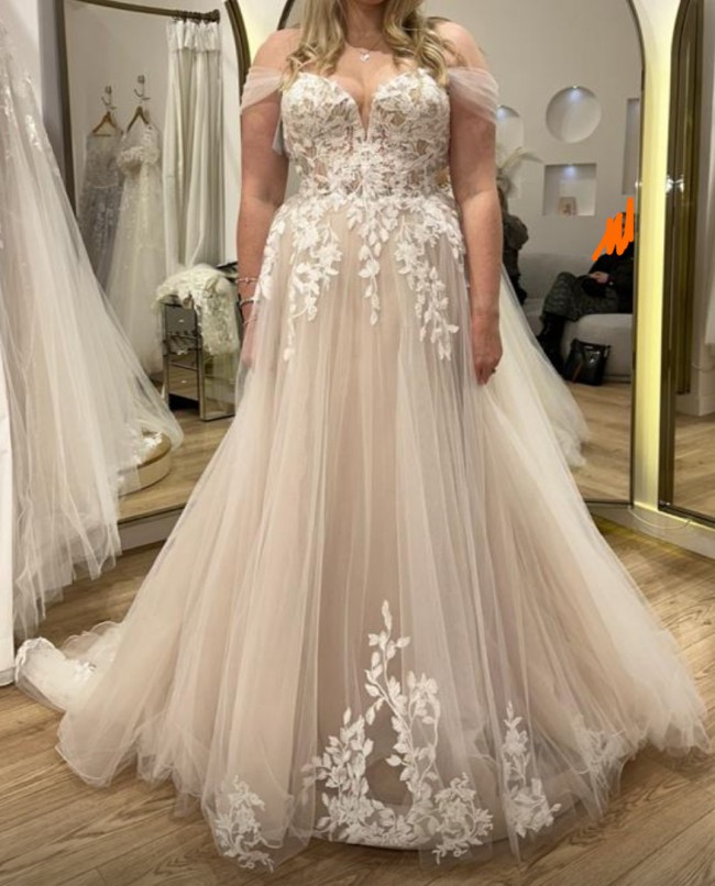 Warm nude undertone on the underpart of the dress as seen, first photos from fitting in bridal shop to see dress detail more clearly than our wedding day.