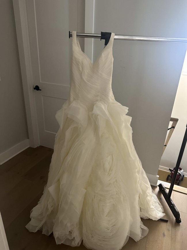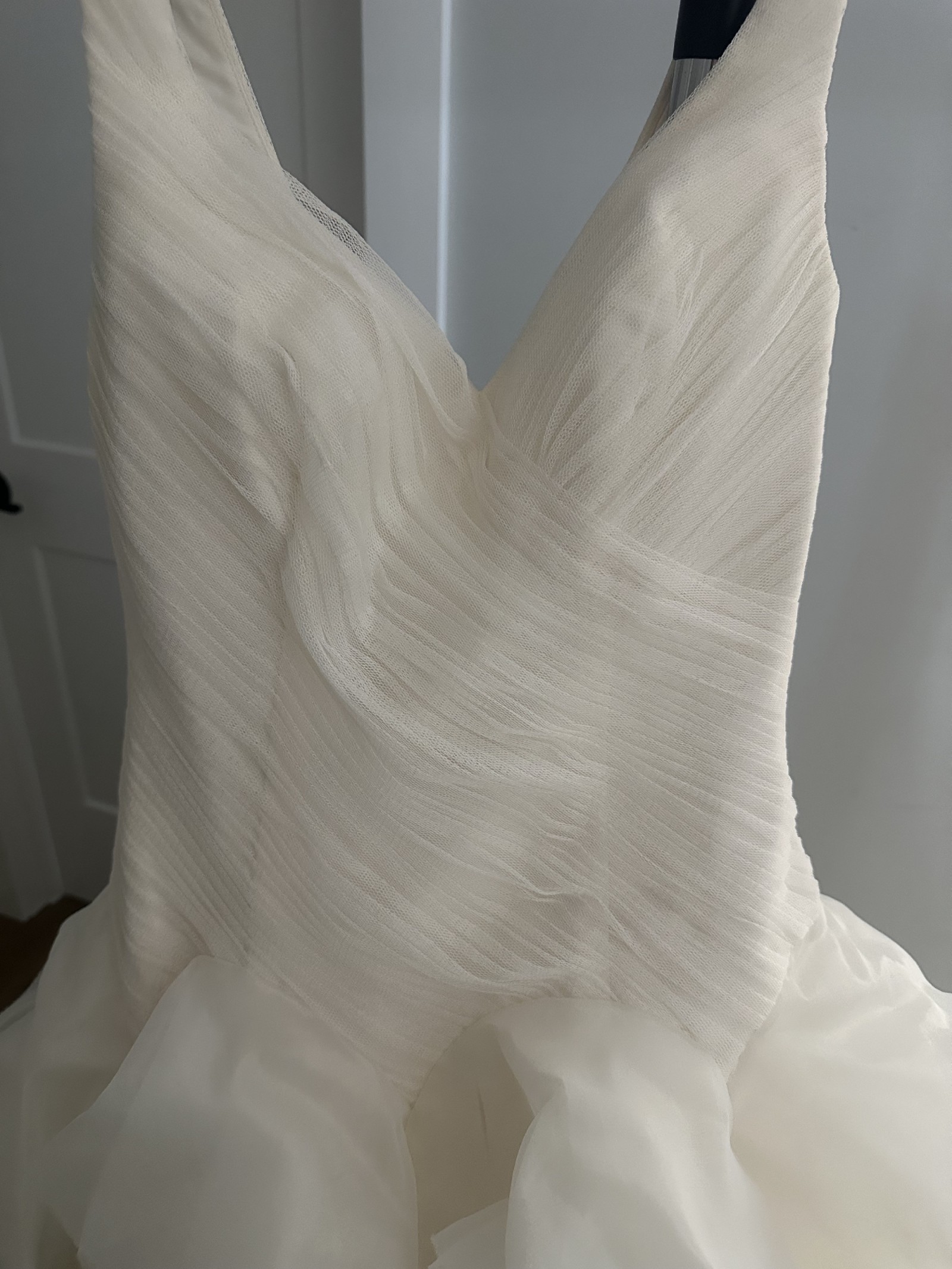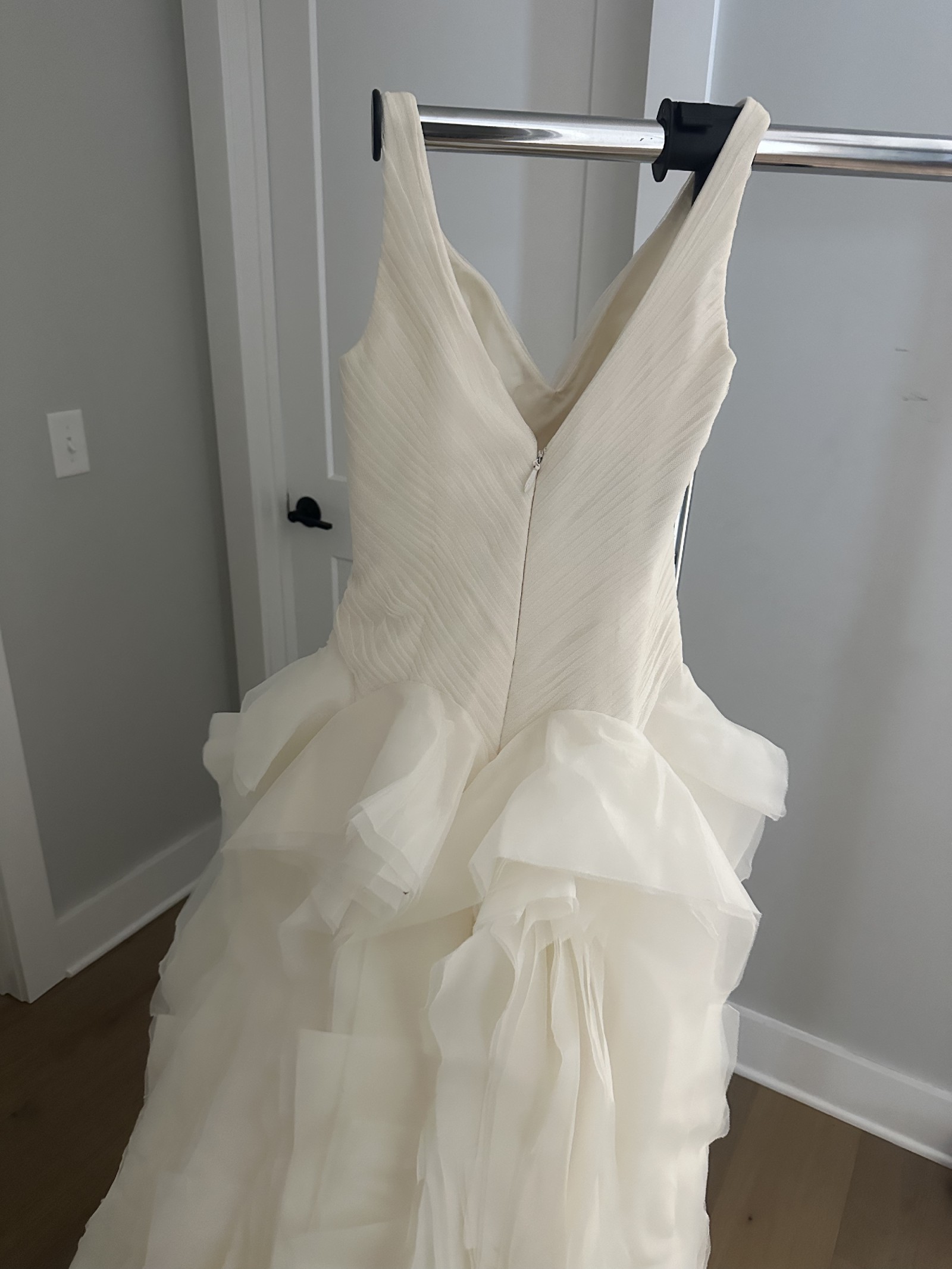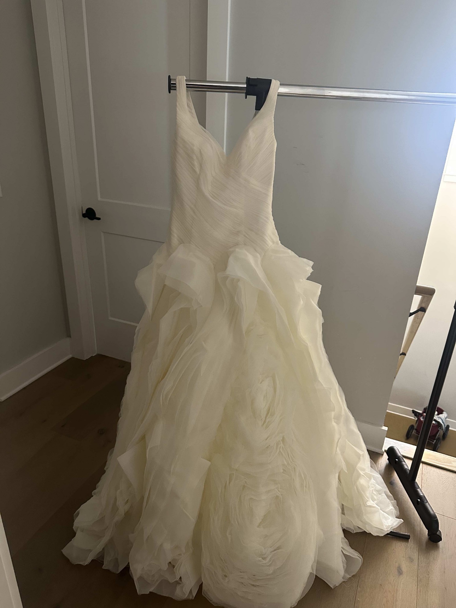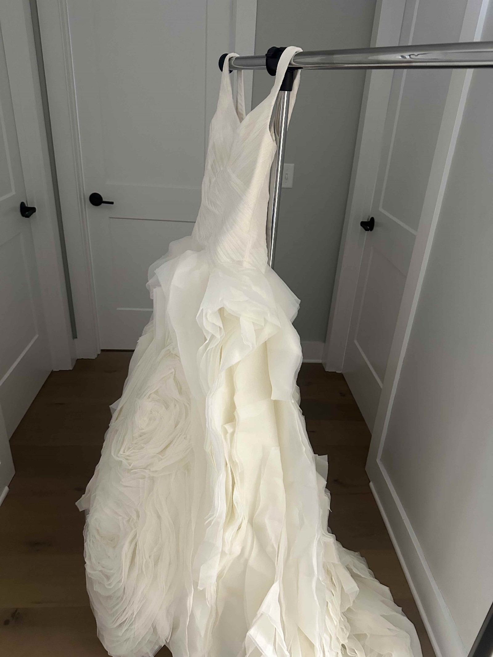 This stunning Vera Wang White wedding dress was a dream come true on my special day. The moment I slipped into this A-Line silhouette, I felt effortlessly elegant. The delicate V-neckline and V-back design add a touch of sophistication, allowing me to feel both beautiful and comfortable as I walked down the aisle.
