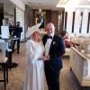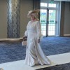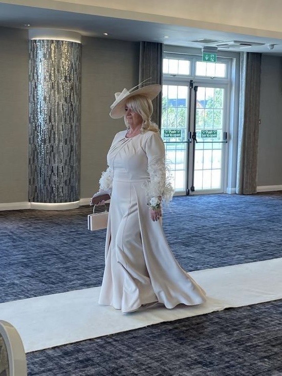 Mother of the bride cream wide leg jumpsuit with cape attached at the waist. Cape has a small train. All one piece. Sleeves have cream feathers and diamantés. Comes with a hat that was specially made to match the outfit, which also includes matching feathers and diamantés.