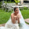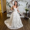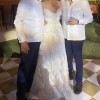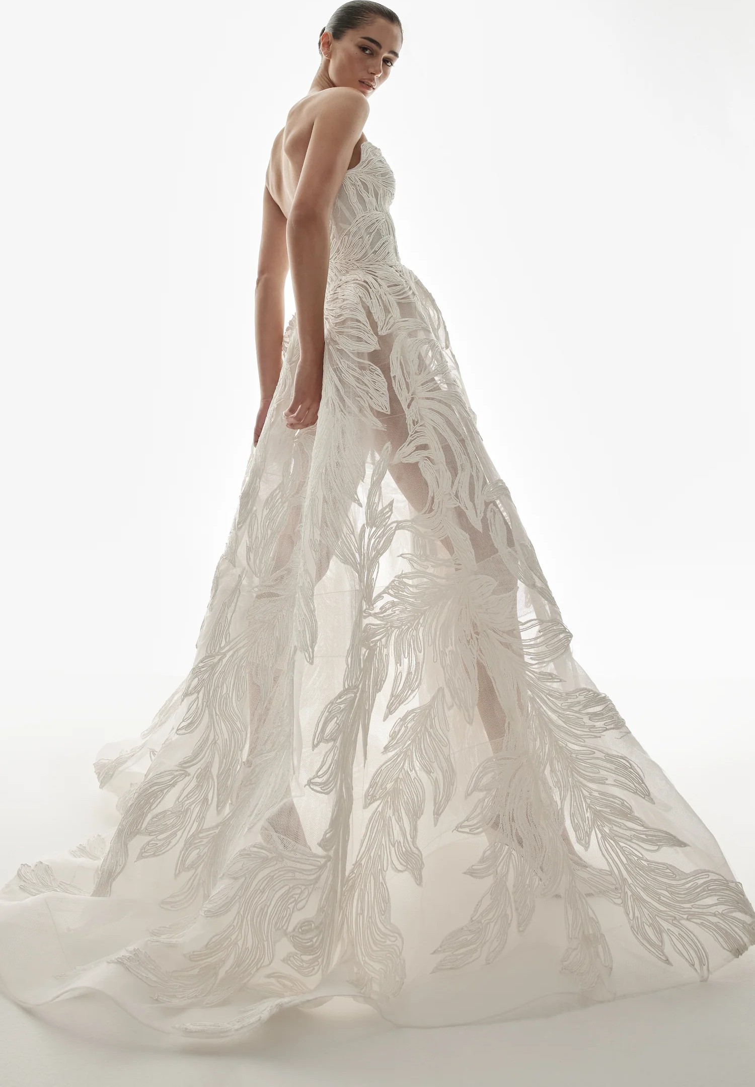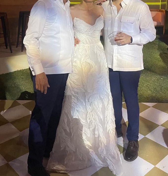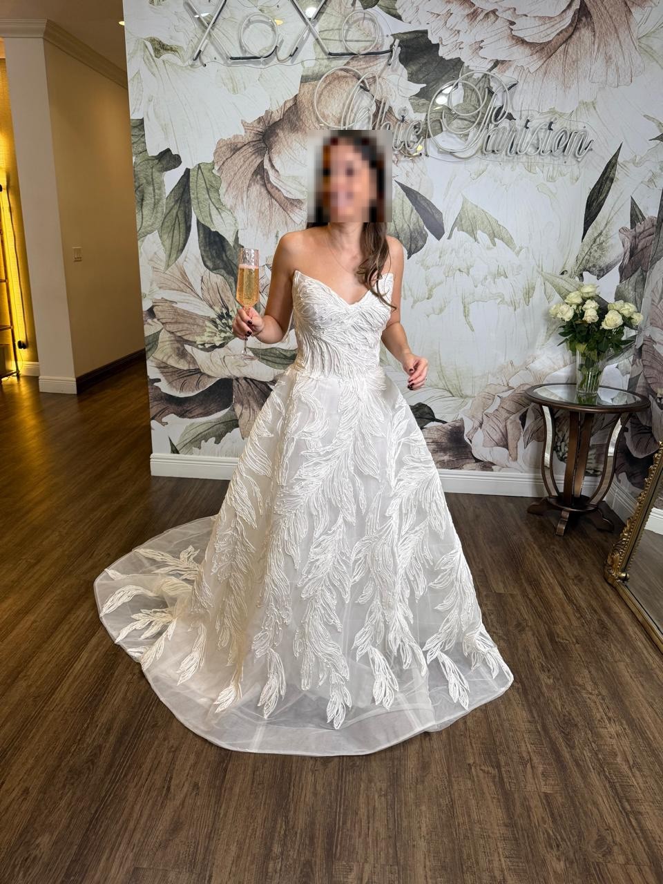The dress is a beautiful strapless raffia embroidered tulle ballgown with raffia leaf detail from Monique Lhuillier Platinum Collection. It has a stunning 3D look and is literal art.