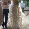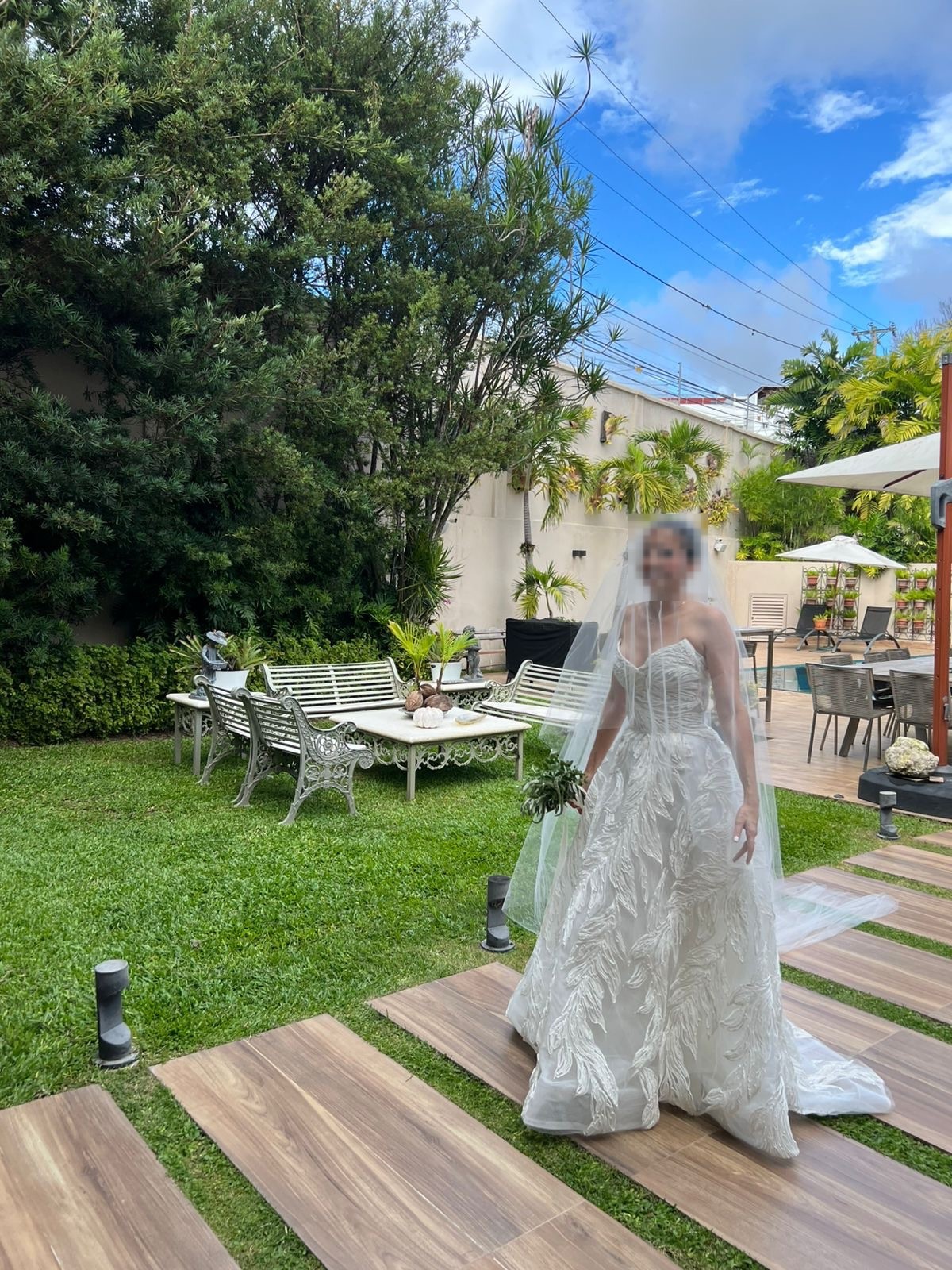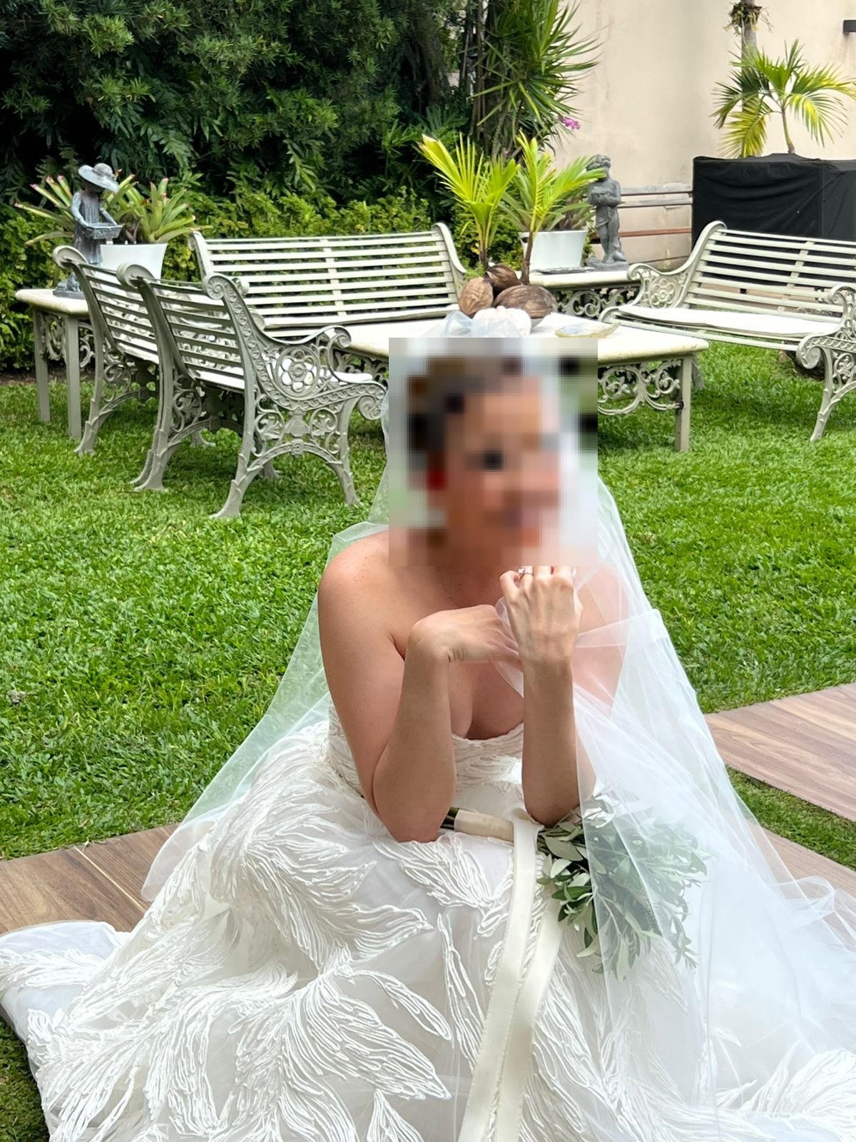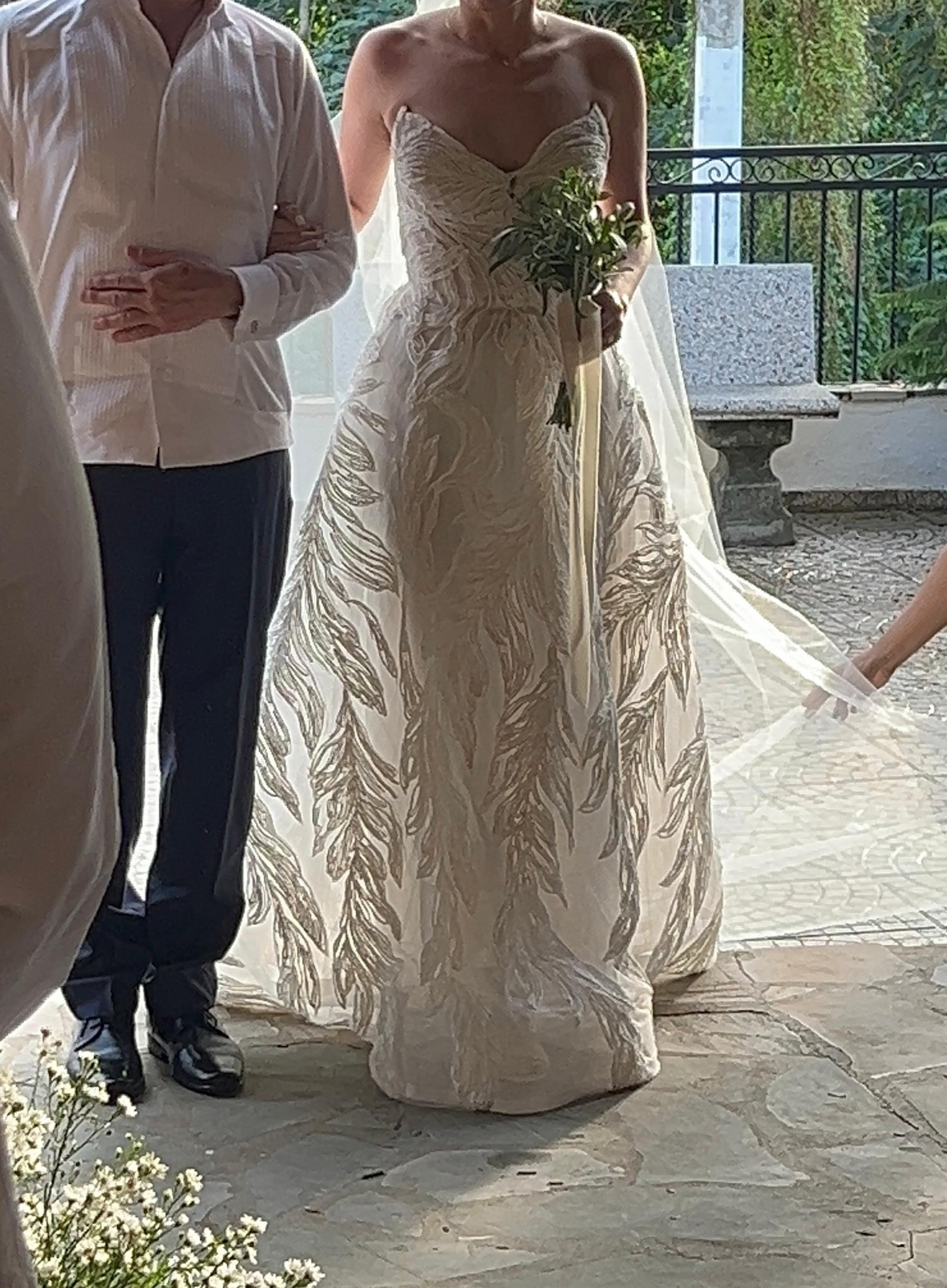 Veil is not the matching veil that has the same details as the dress, but a plain tulle cathedral-length veil that I got from the boutique where I purchased my dress.