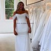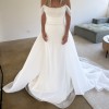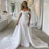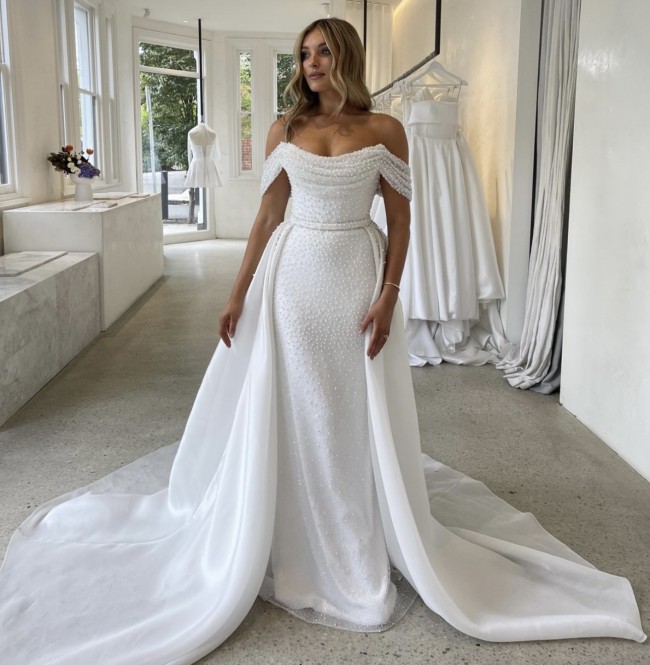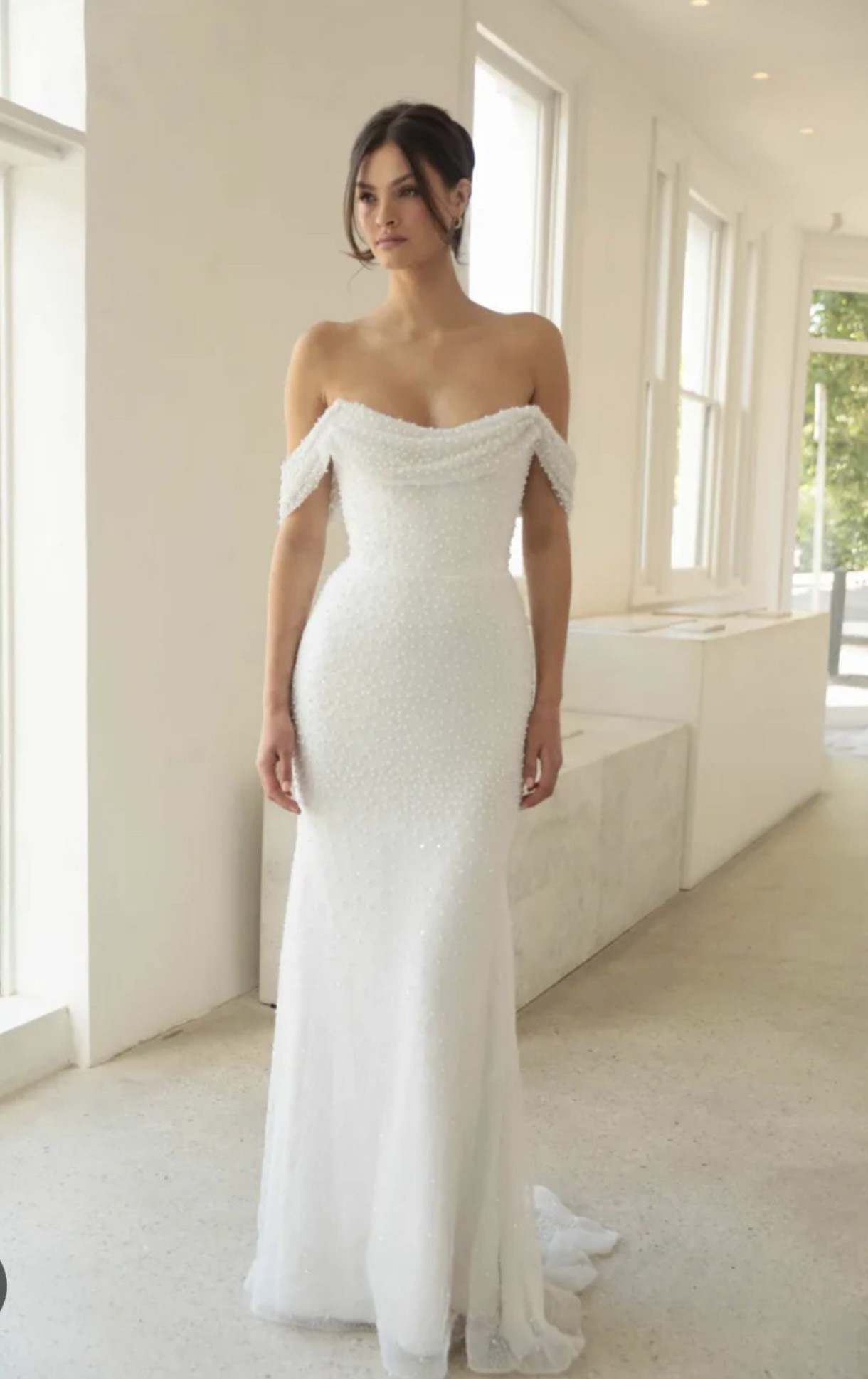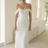 This Alessia wedding dress by Mariana Hardwick is the epitome of elegance and sophistication. Designed for the modern bride who appreciates both allure and timelessness, this sheath silhouette gracefully hugs the body, accentuating your natural shape while offering a touch of refined charm. The off-the-shoulder neckline adds a romantic flair, beautifully framing the collarbone and shoulders, while the low back invites a hint of daring without compromising on grace.