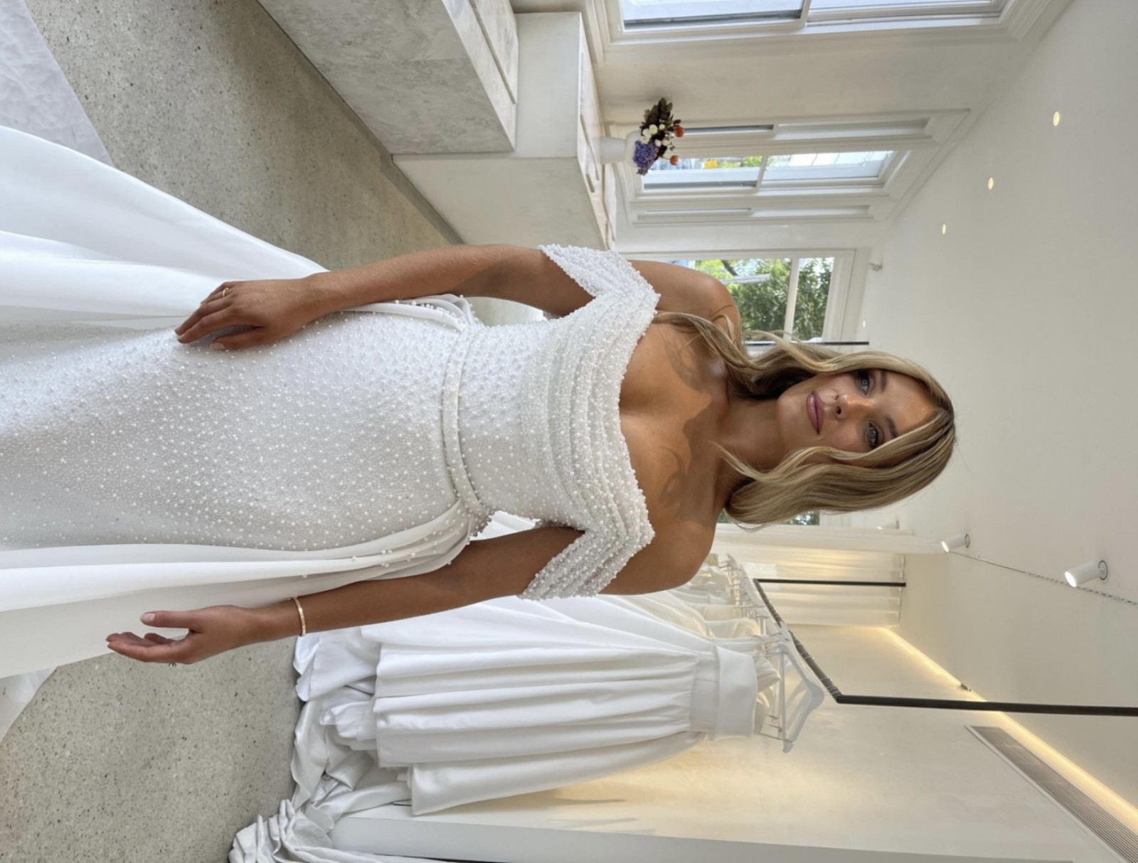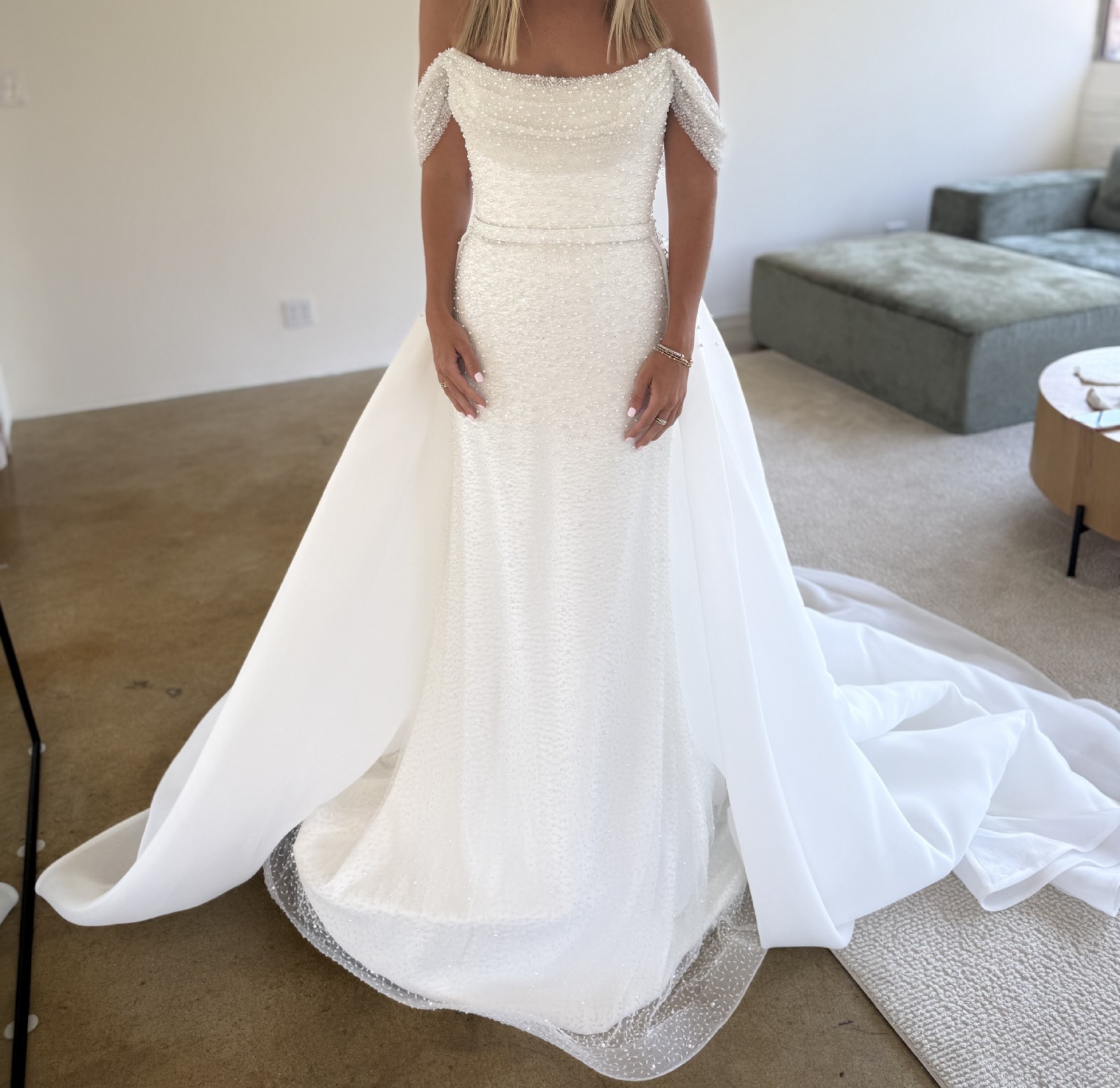 Glistening pearls and delicate sequins intricately embellish the fabric, creating an enchanting sparkle that catches the light with every movement. The floor-length design drapes elegantly, ensuring you'll make a stunning entrance and leave a lasting impression as you glide down the aisle. An exquisite overskirt adds drama and dimension, allowing you to transition from ceremony to celebration with dazzling ease.